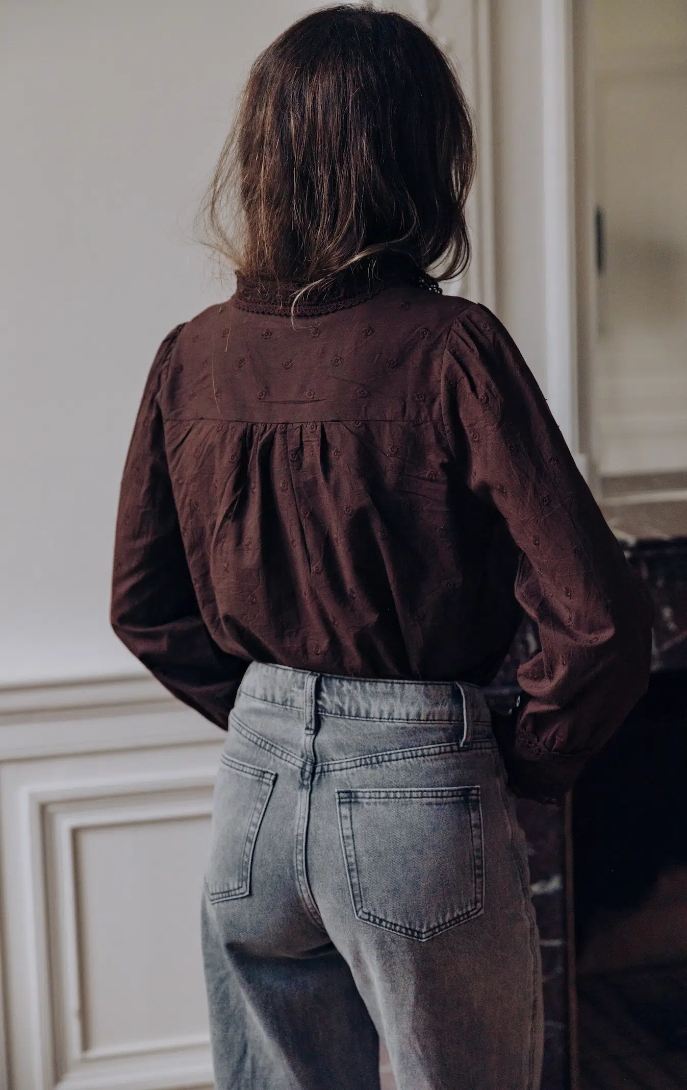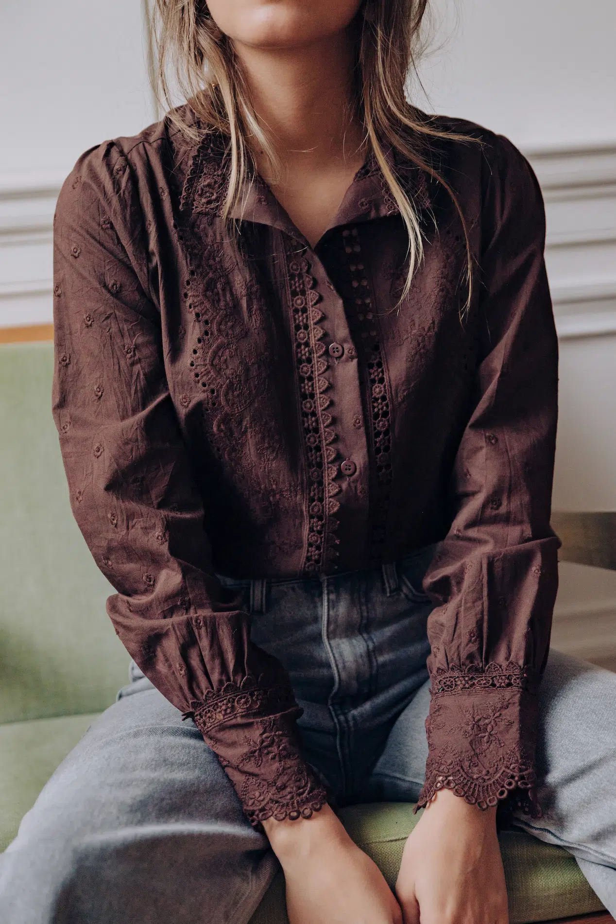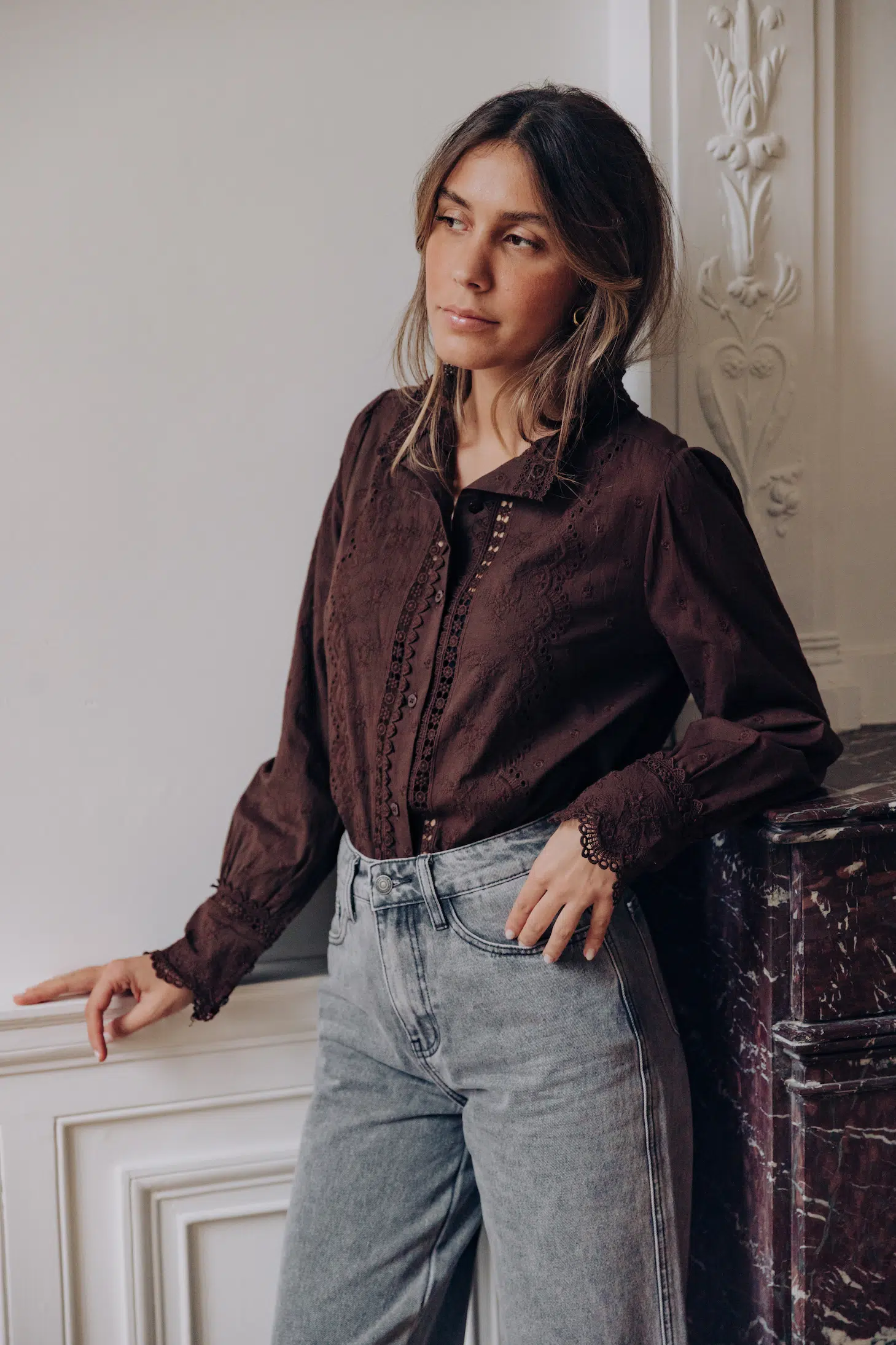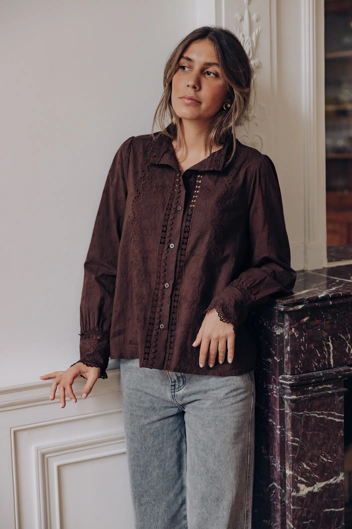 – Chemise col rond à dentelle – Coupe droite – Fermeture par boutons à l’avant – Manches longues resserrées aux poignets par trois boutons – Dentelle fleurie – Couleur : marron