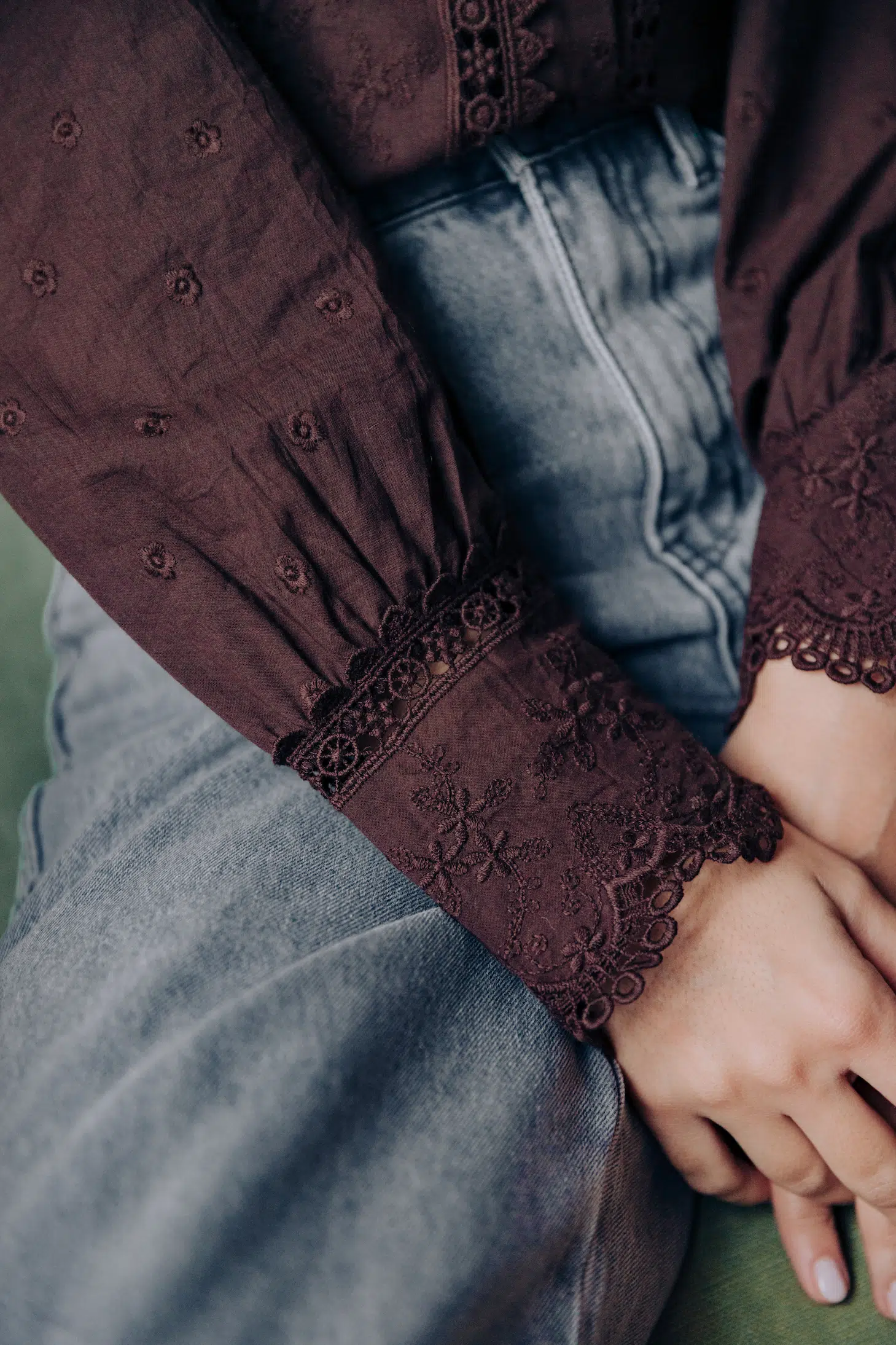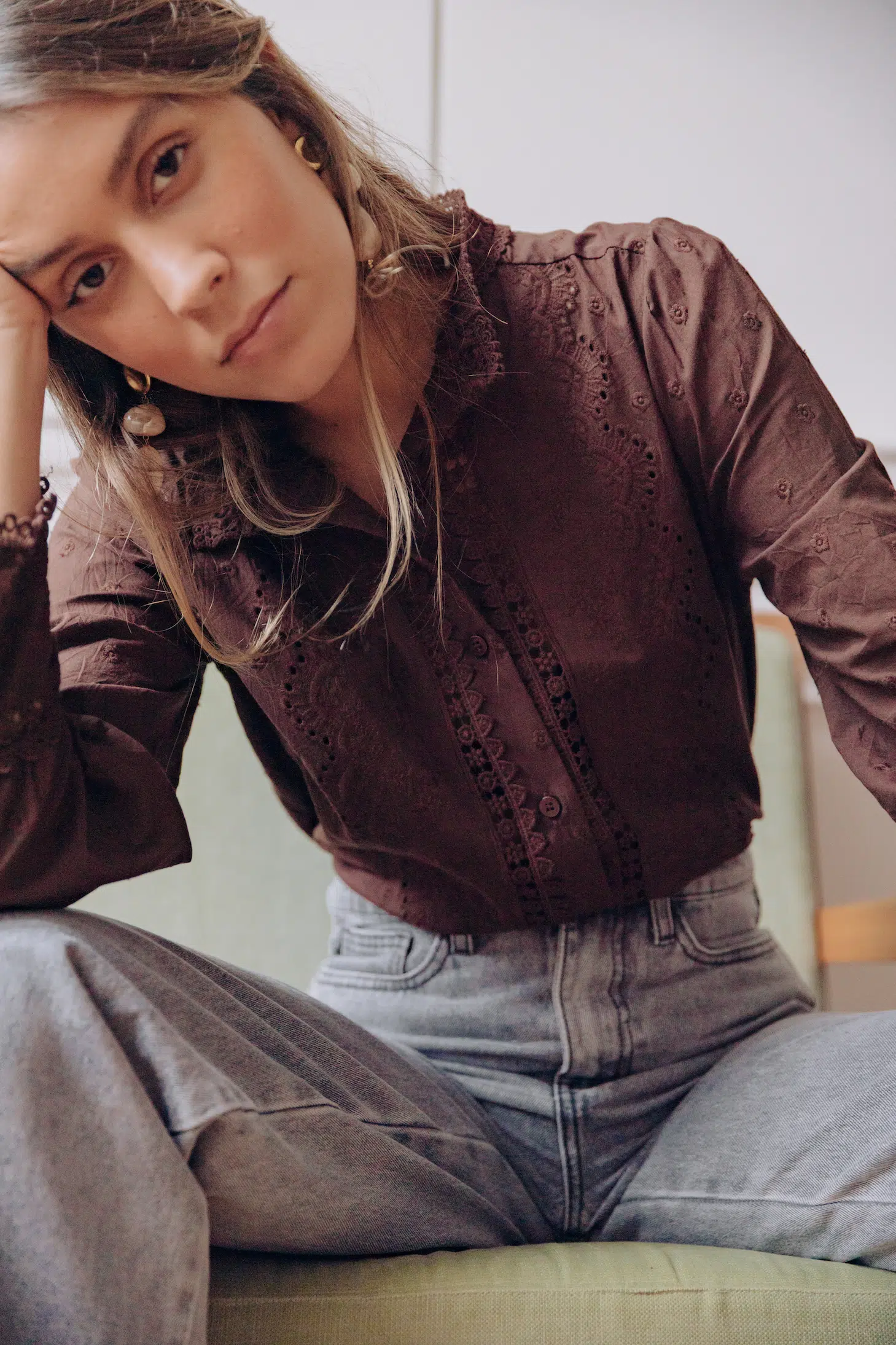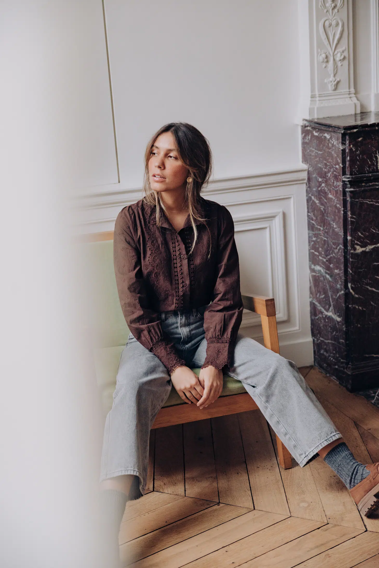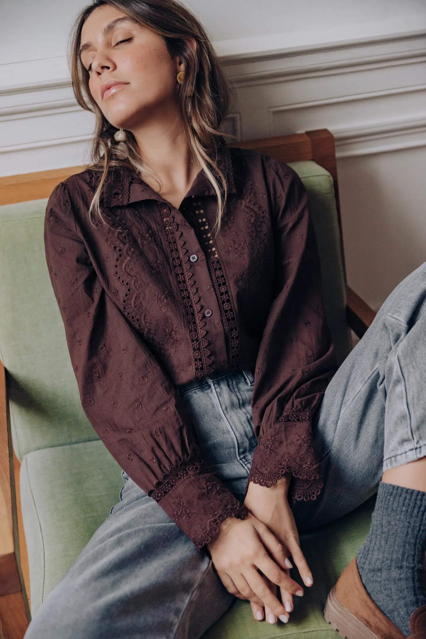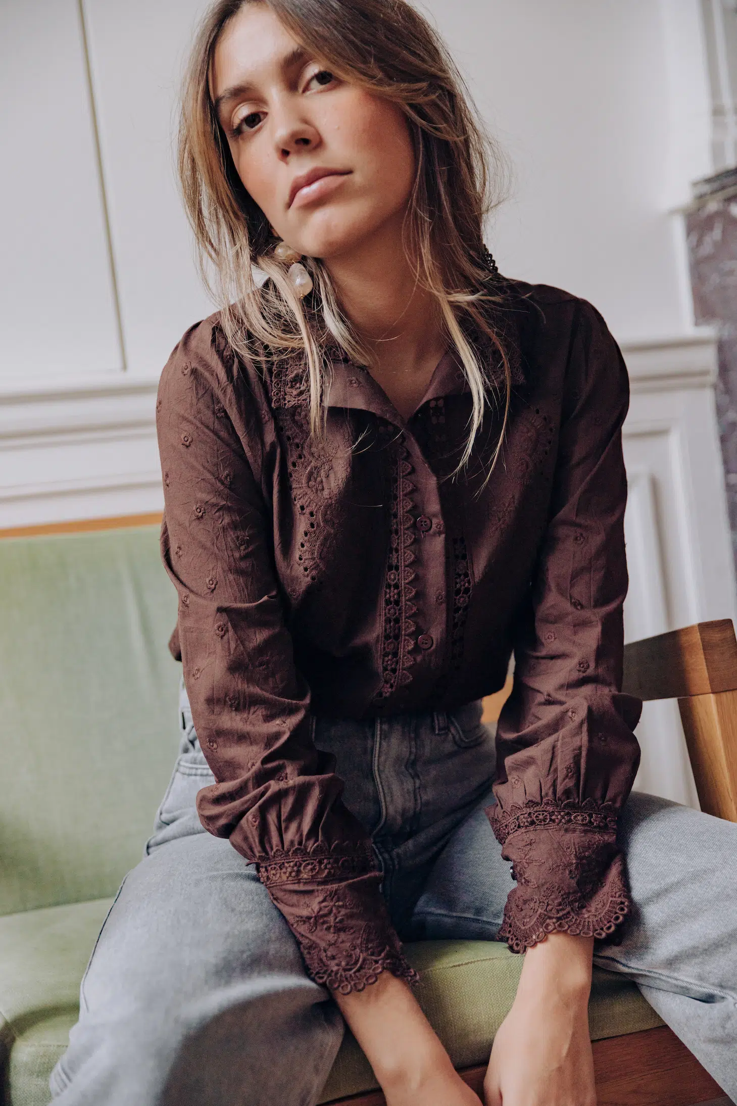 – Chemise col rond à dentelle – Coupe droite – Fermeture par boutons à l’avant – Manches longues resserrées aux poignets par trois boutons – Dentelle fleurie – Couleur : marron