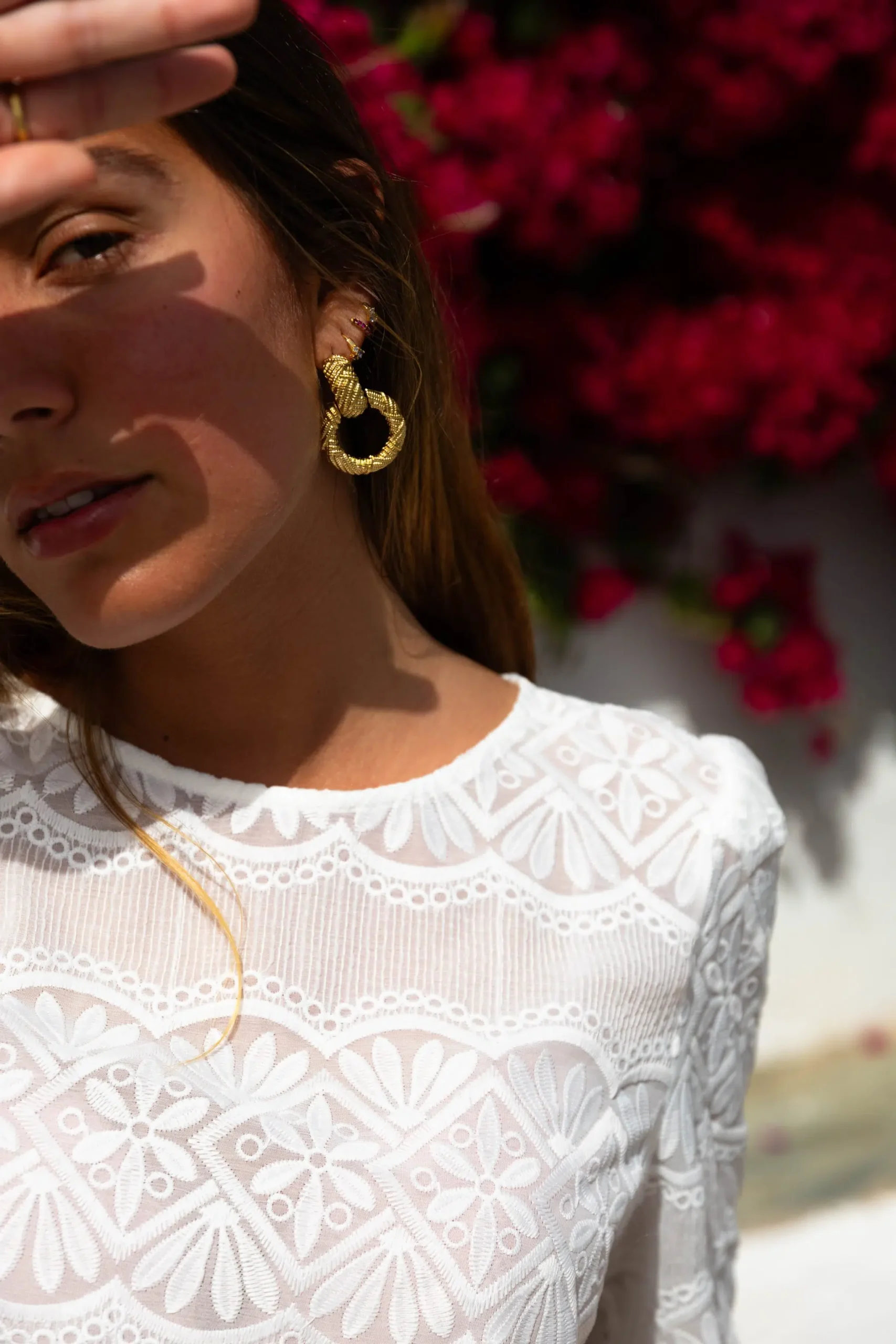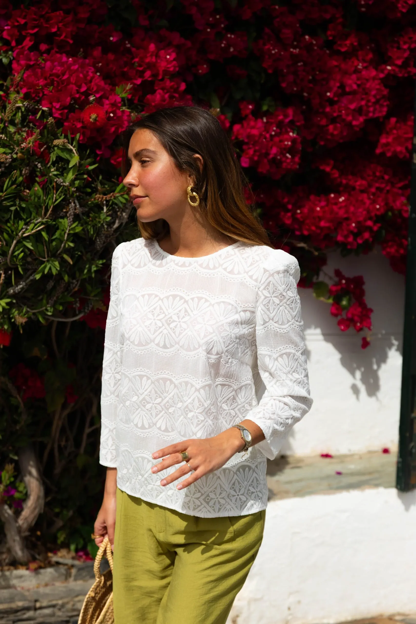 – Blouse brodée – Col rond – Manches longues – Fermeture par bouton au dos – Motifs floraux brodés ton sur ton – Couleur : blanc