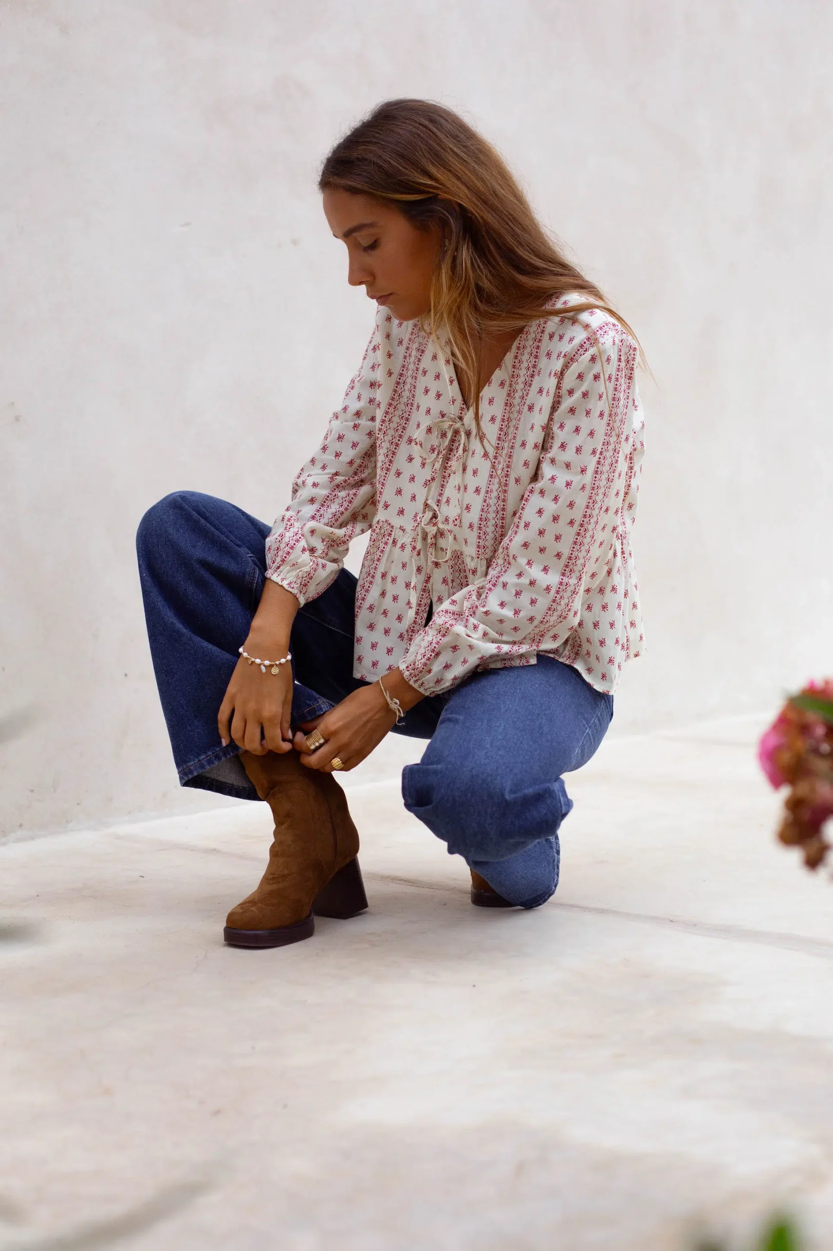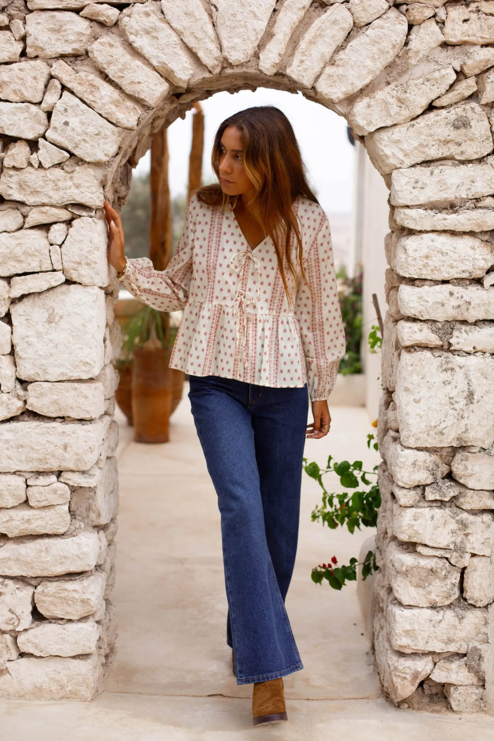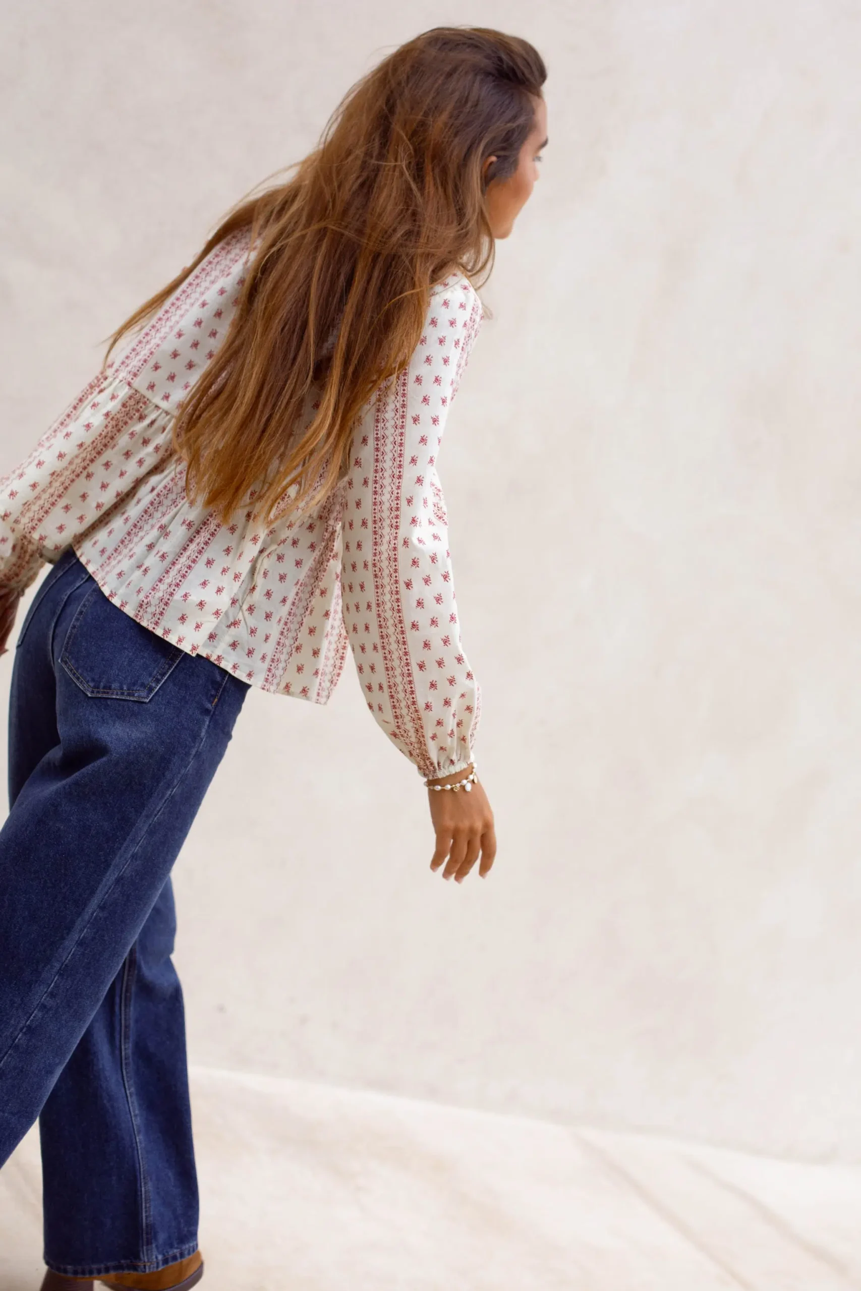 – Blouse manches longues – Fermeture à l’avant – Imprimé fleuri rouge – Couleur : écru