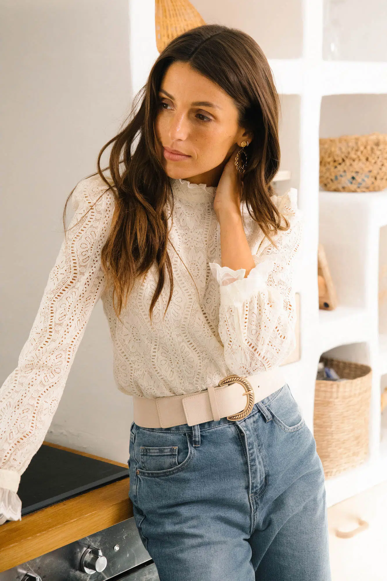 – Blouse en dentelle – Col montant avec dentelle – Fermeture par boutons aux poignets – Fermeture par boutons sur l’épaule gauche – Doublée sur l’avant – Couleur : écru