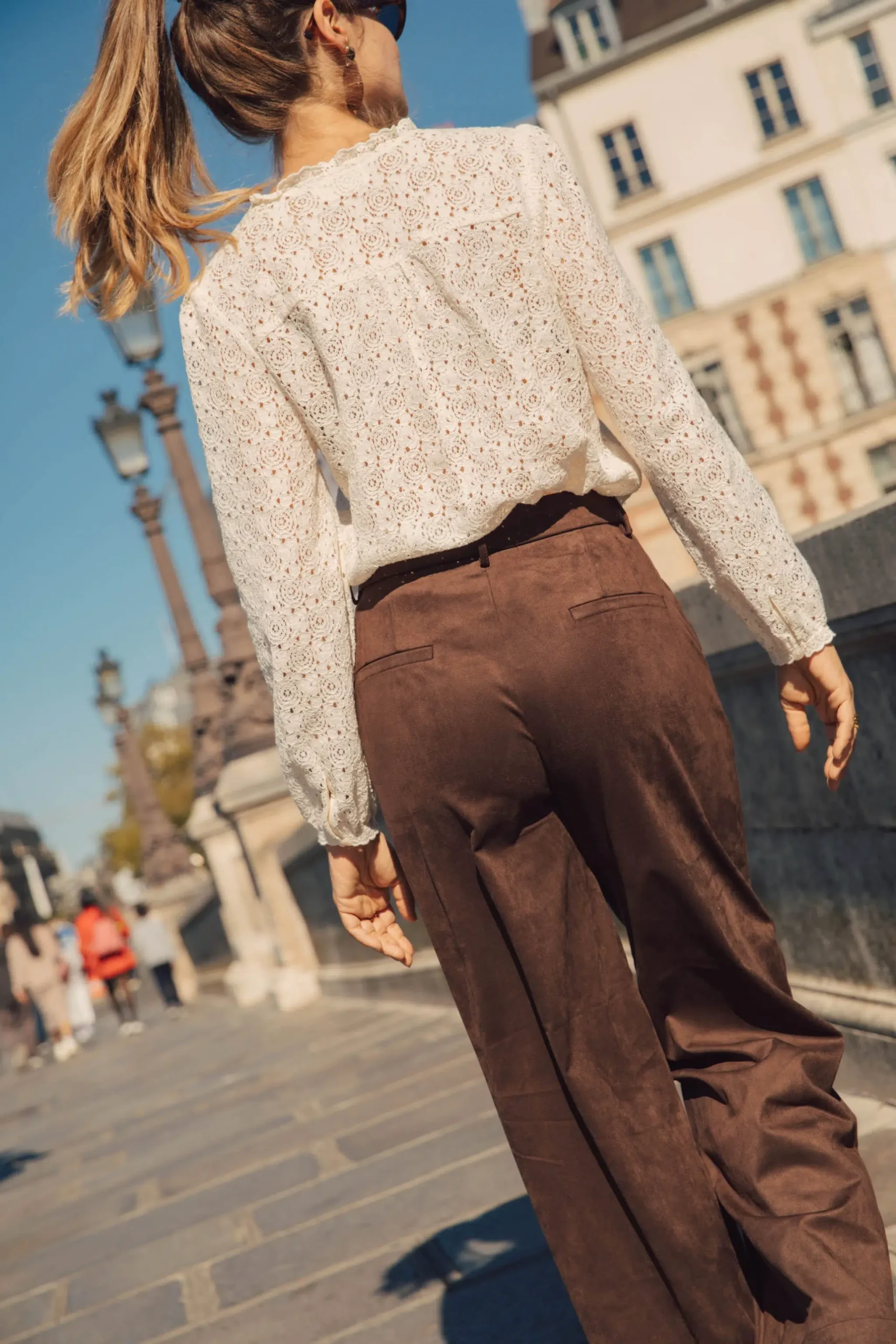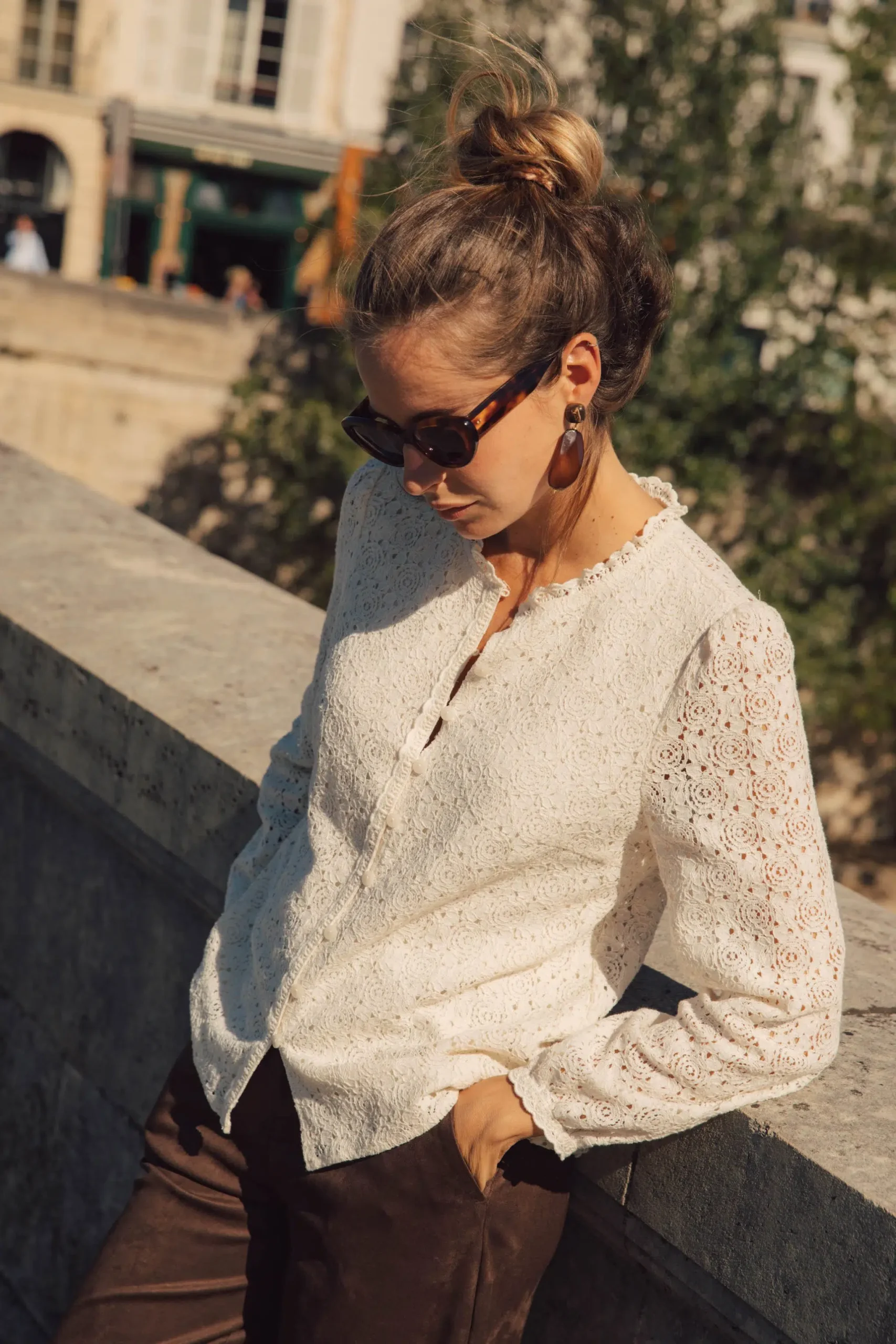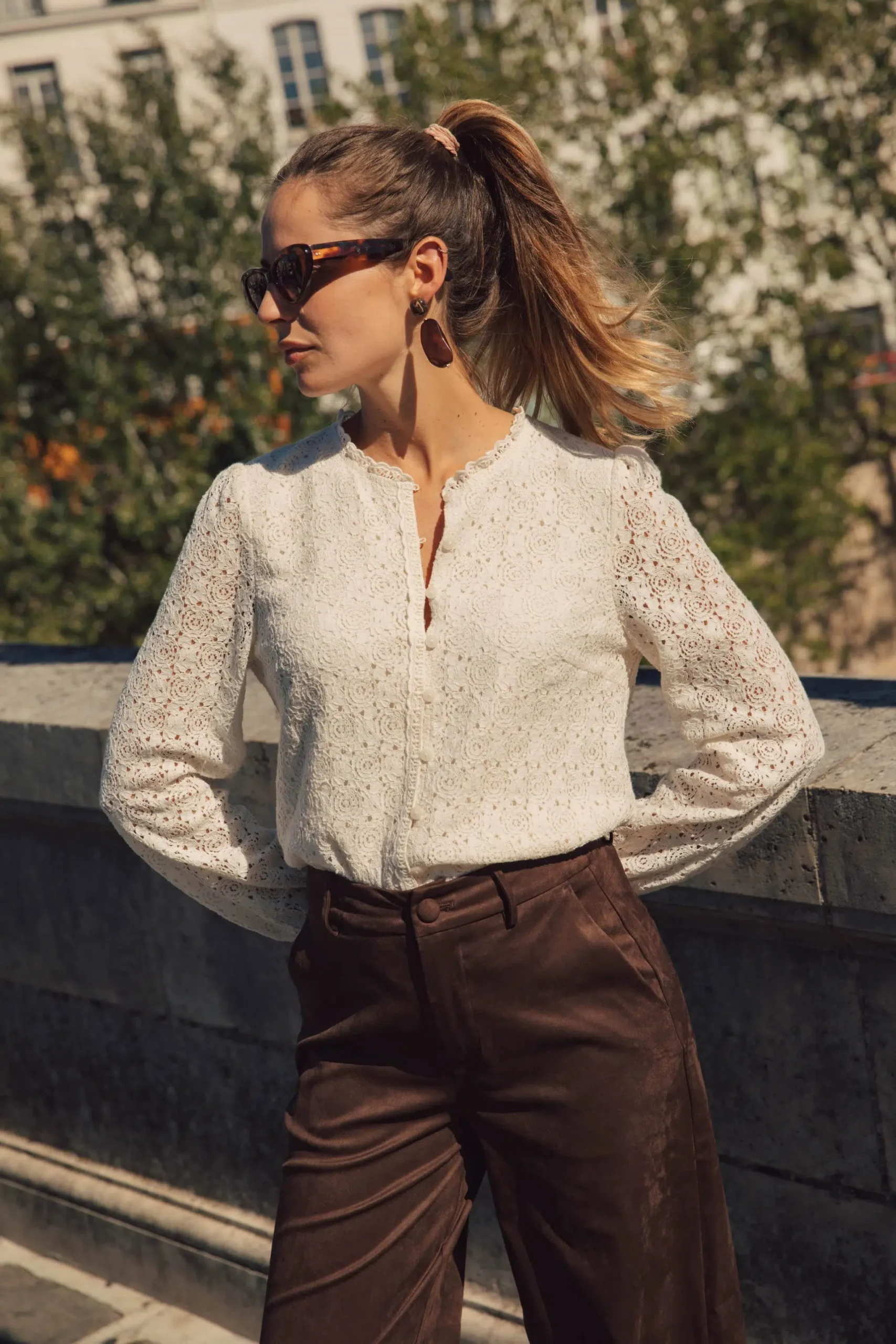 – Blouse en dentelle – Doublée sur l’avant – Manches longues – Fermeture par bouton aux poignets – Fermeture par boutons sur le devant – Couleur : écru