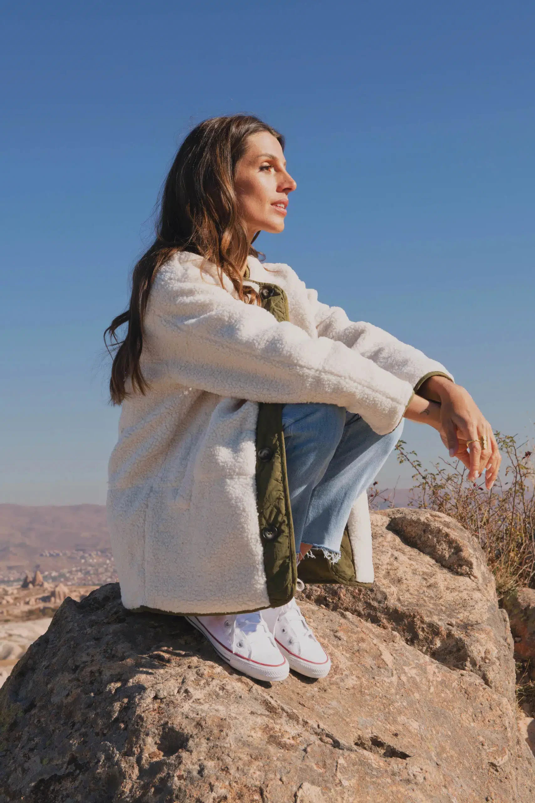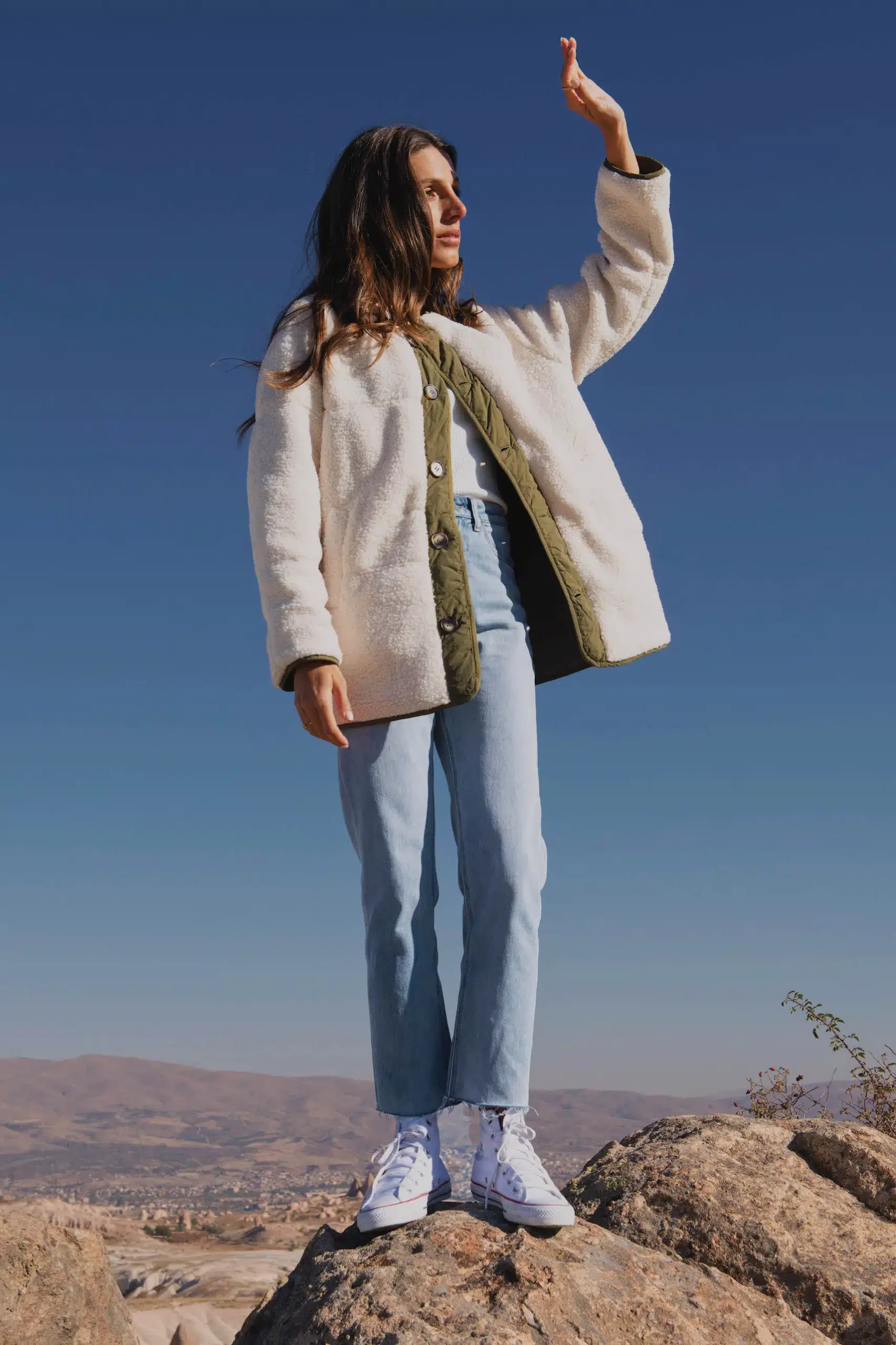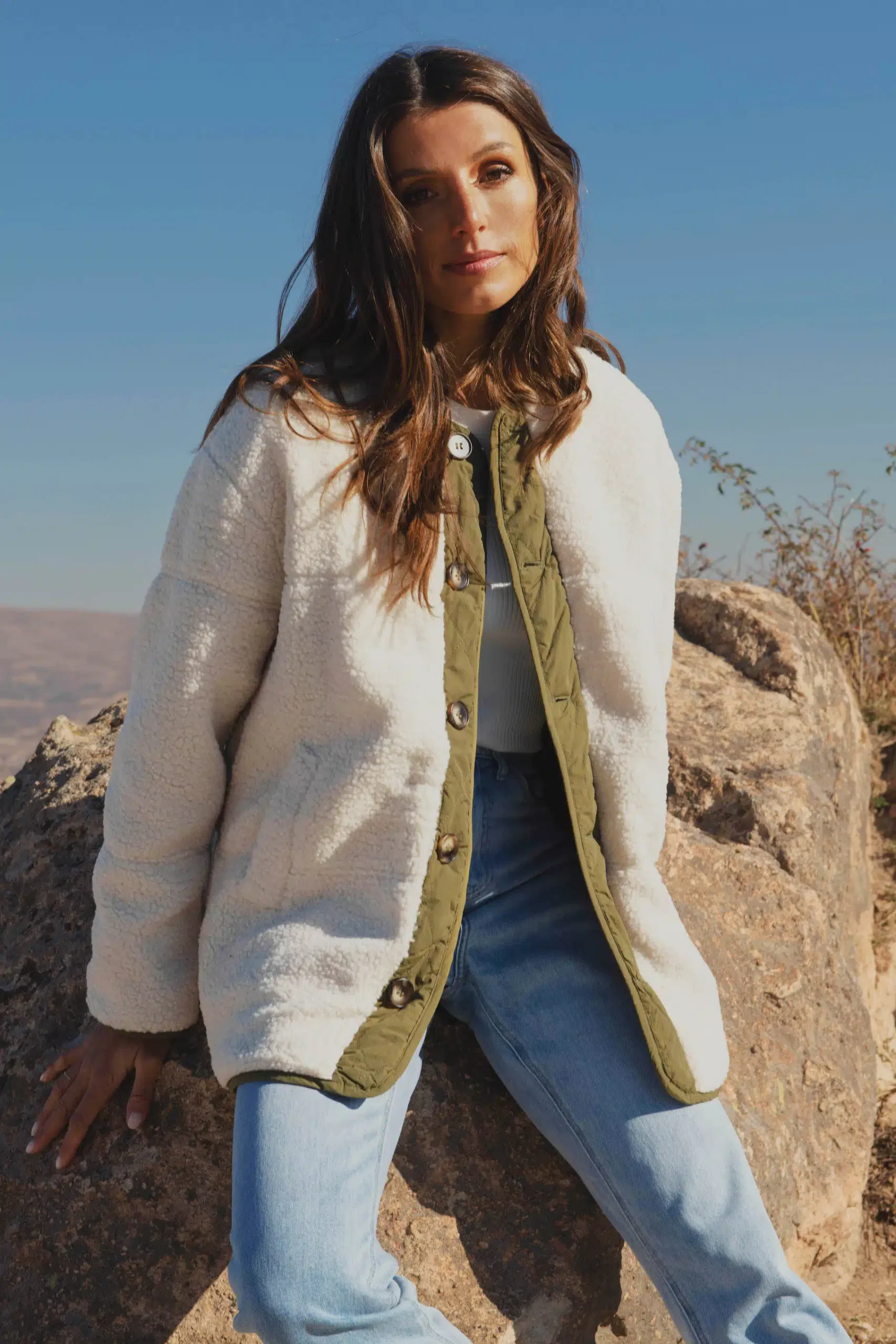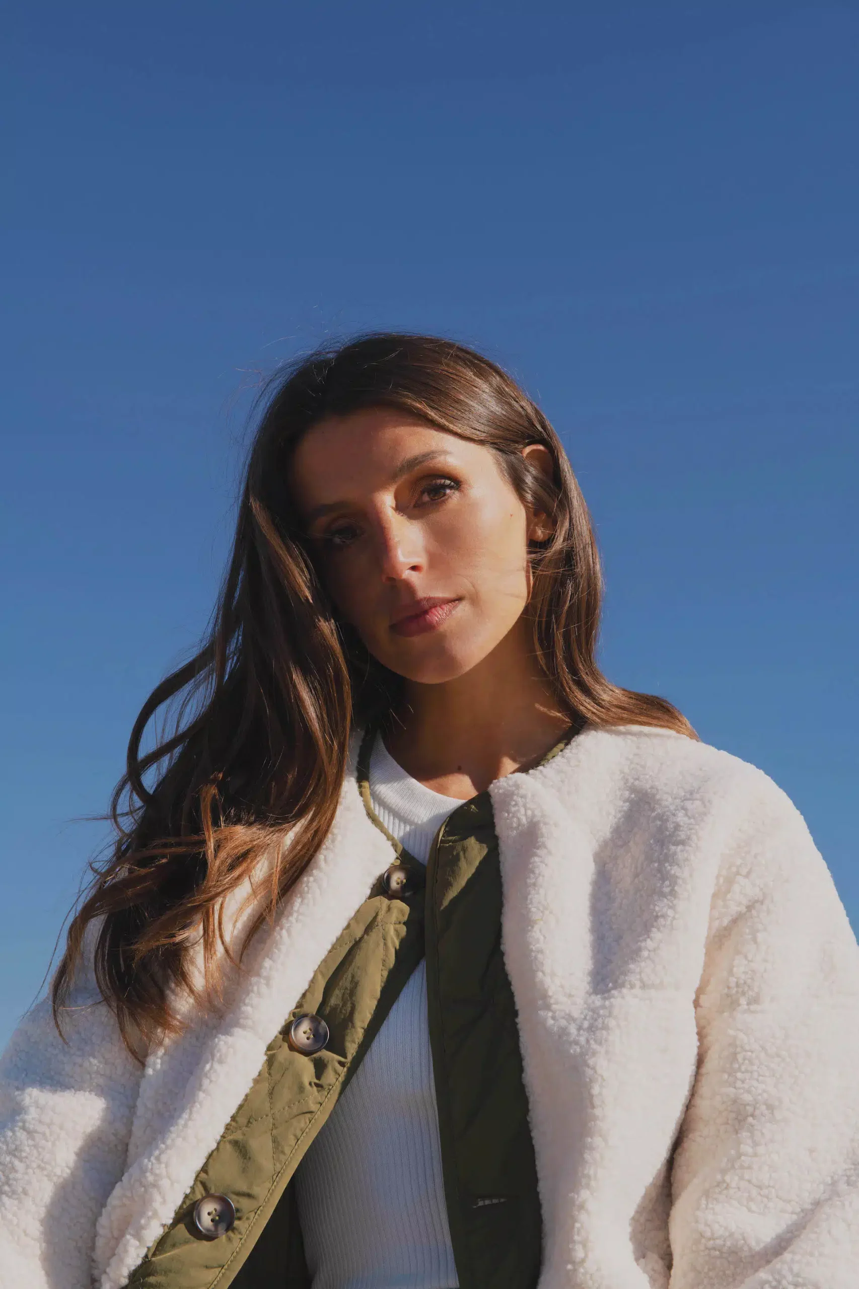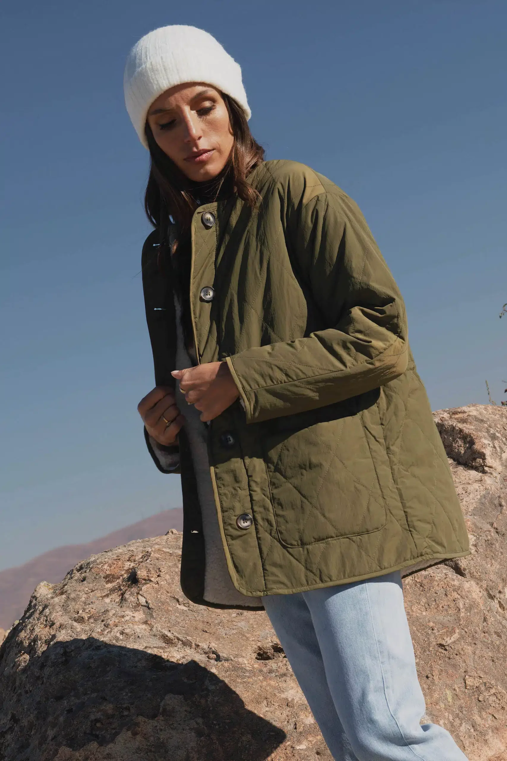 – Blouson réversible – Fermeture par boutons sur le devant – Deux poches à l’avant – Ajustable à la taille – Couleur : vert et écru