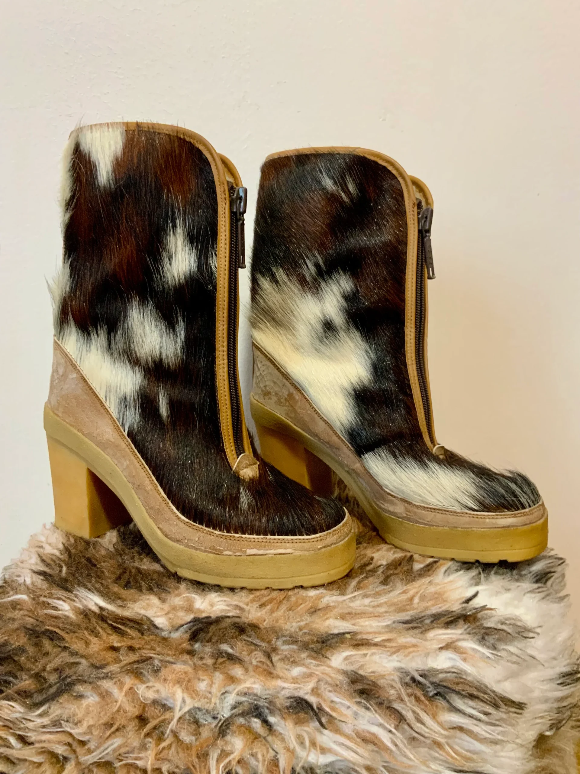 Bottes Originales en poils de vache Vintage 1970 de la grande marque Souki Pichette A la base apres skis seventies – Fourrée en Laine de mouton Très bon état sauf les plastiques vers le bas liés à son âge, le prix en tien compte.