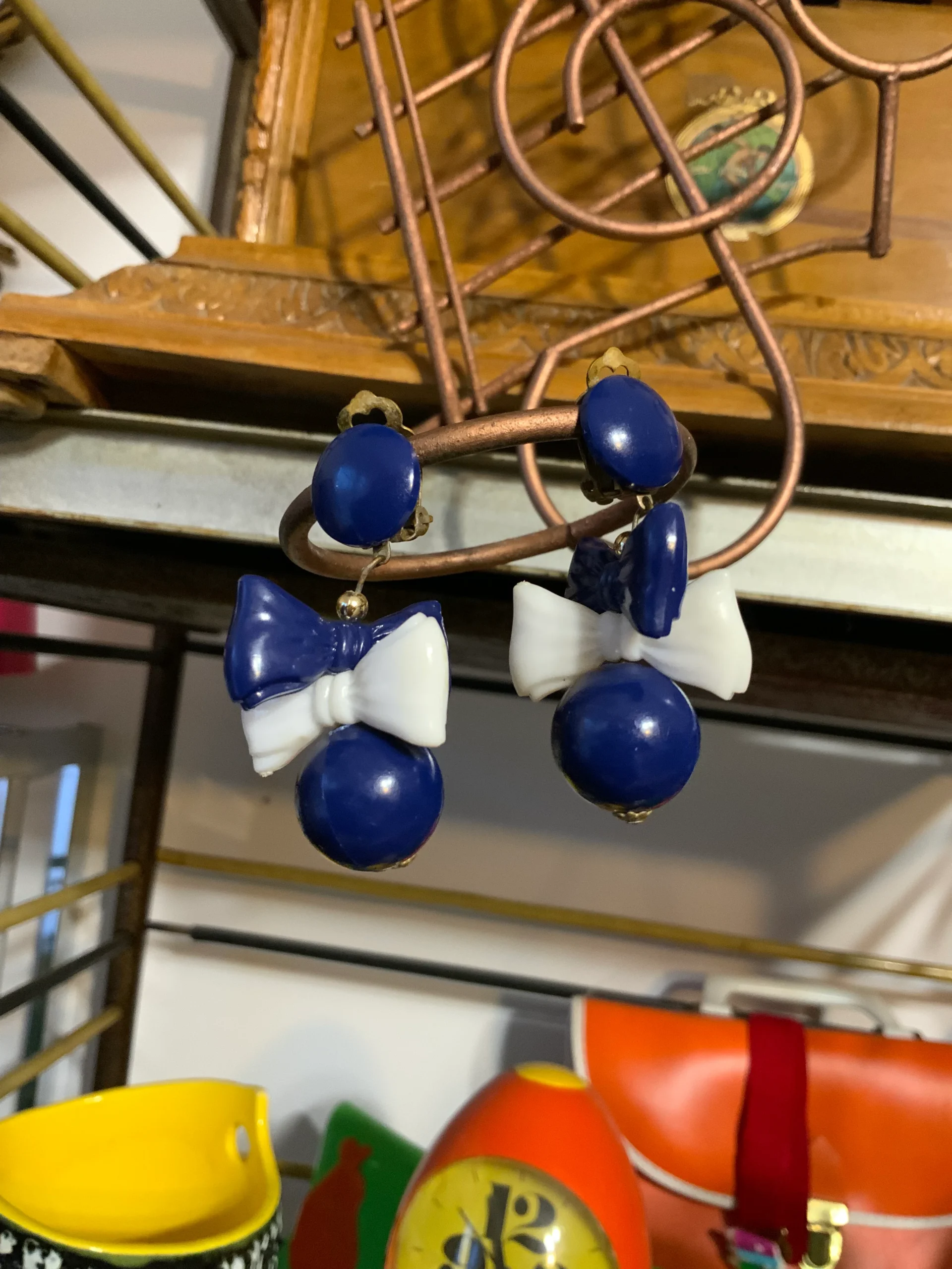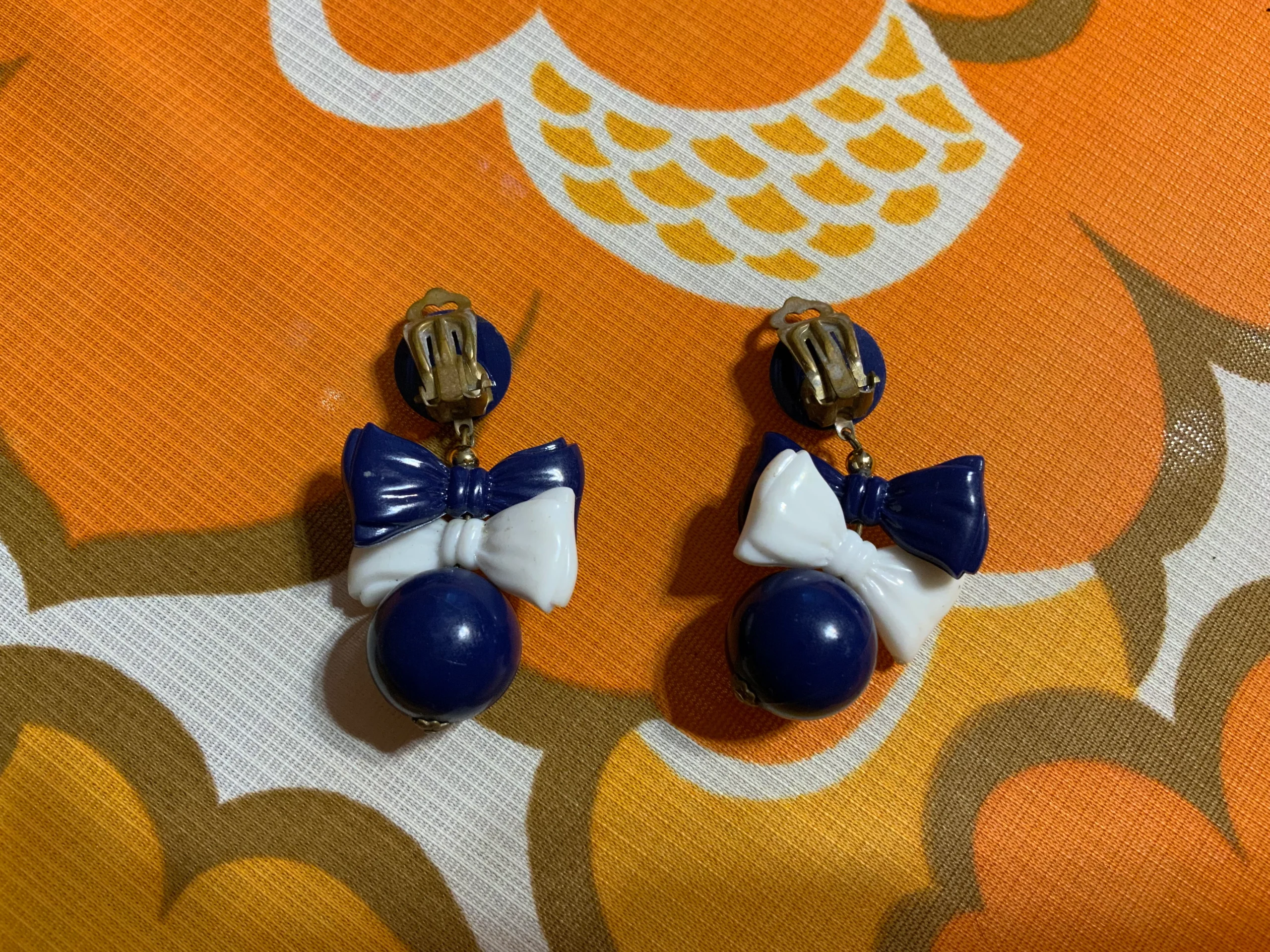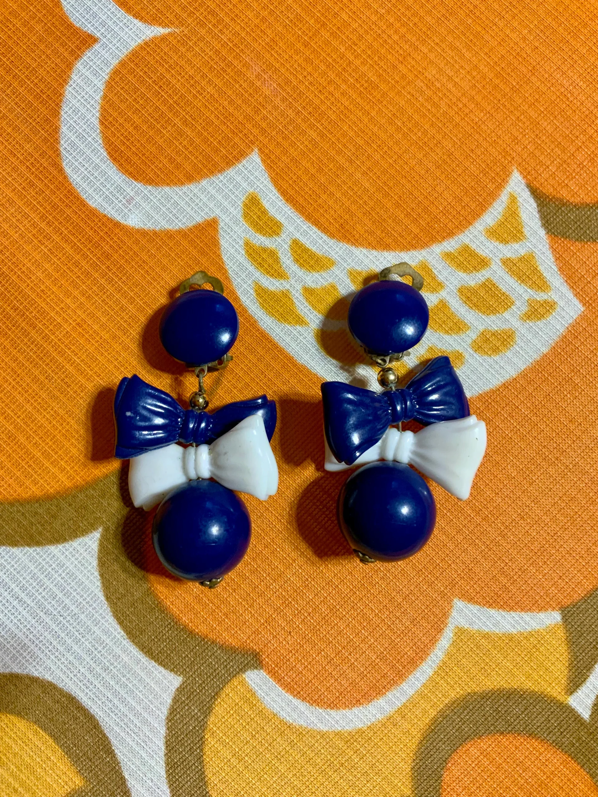 Boucles d’oreilles forme Noeud en métal doré et perles plastiques couleur bleu marine et blanche pendantes, très chic, À pinces 1970/80-