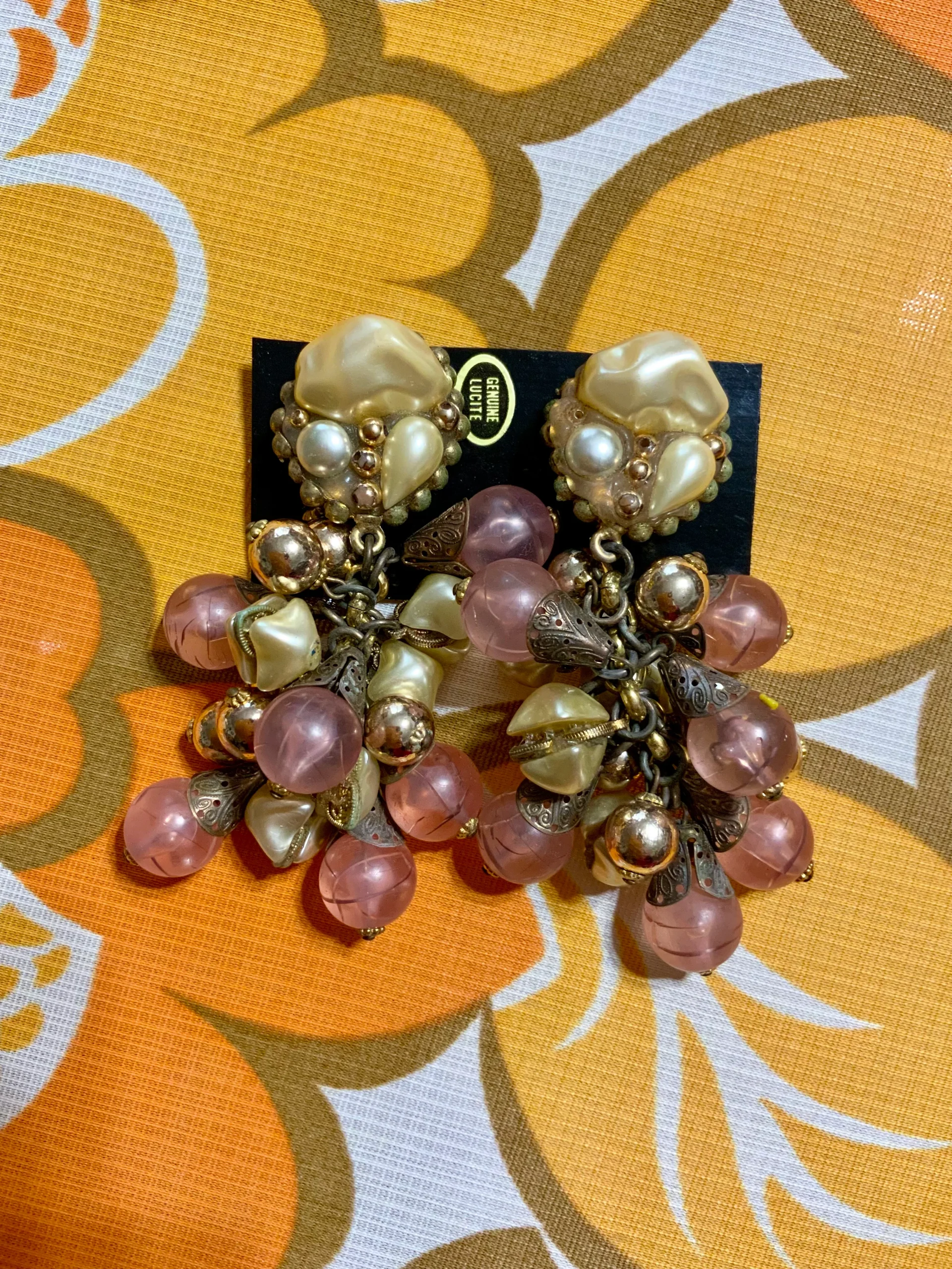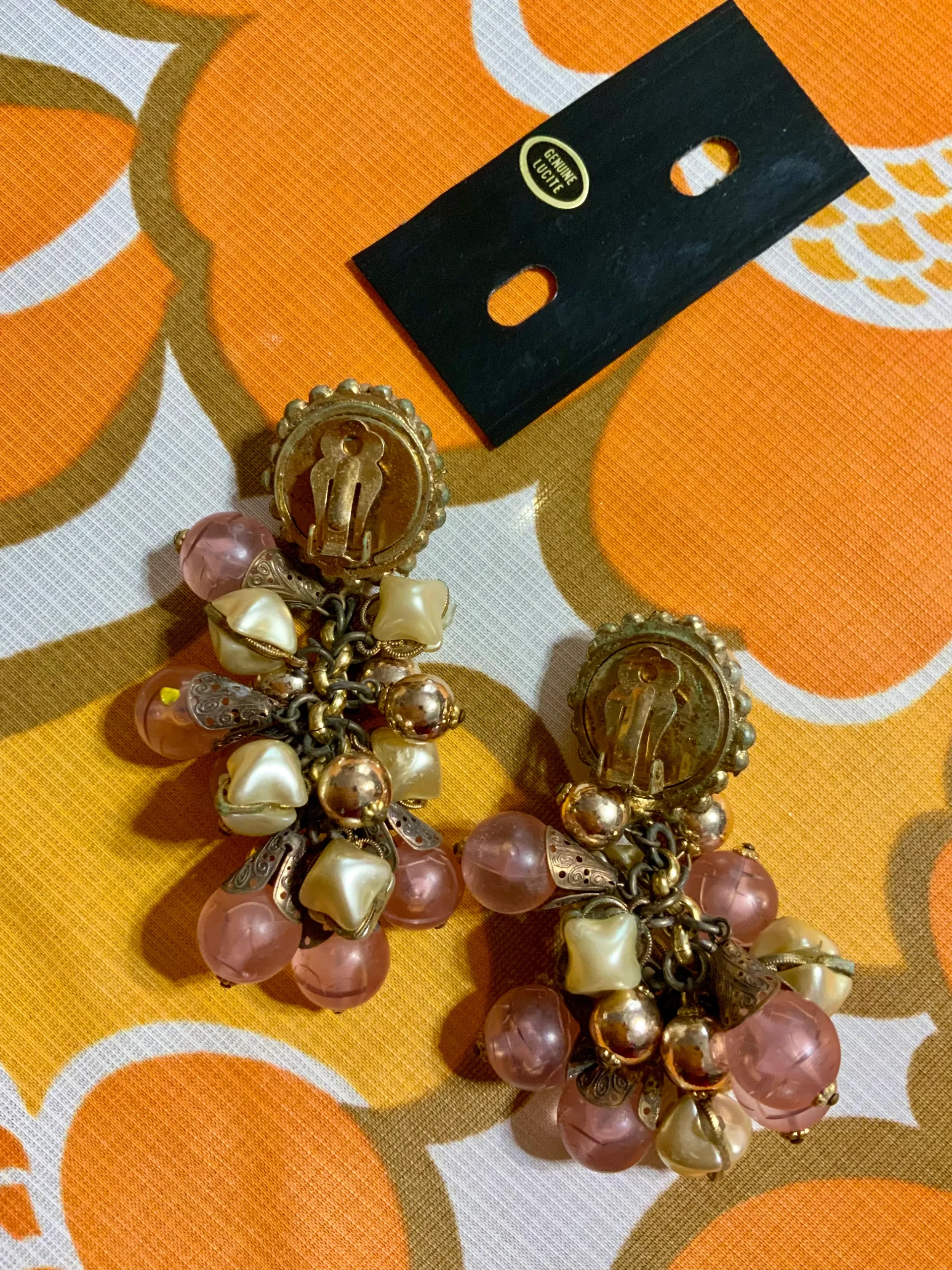 Tres belles boucles d’oreilles anciennes en genuine lucite Forme grappe avec métal et pierres assez impressionnantes.