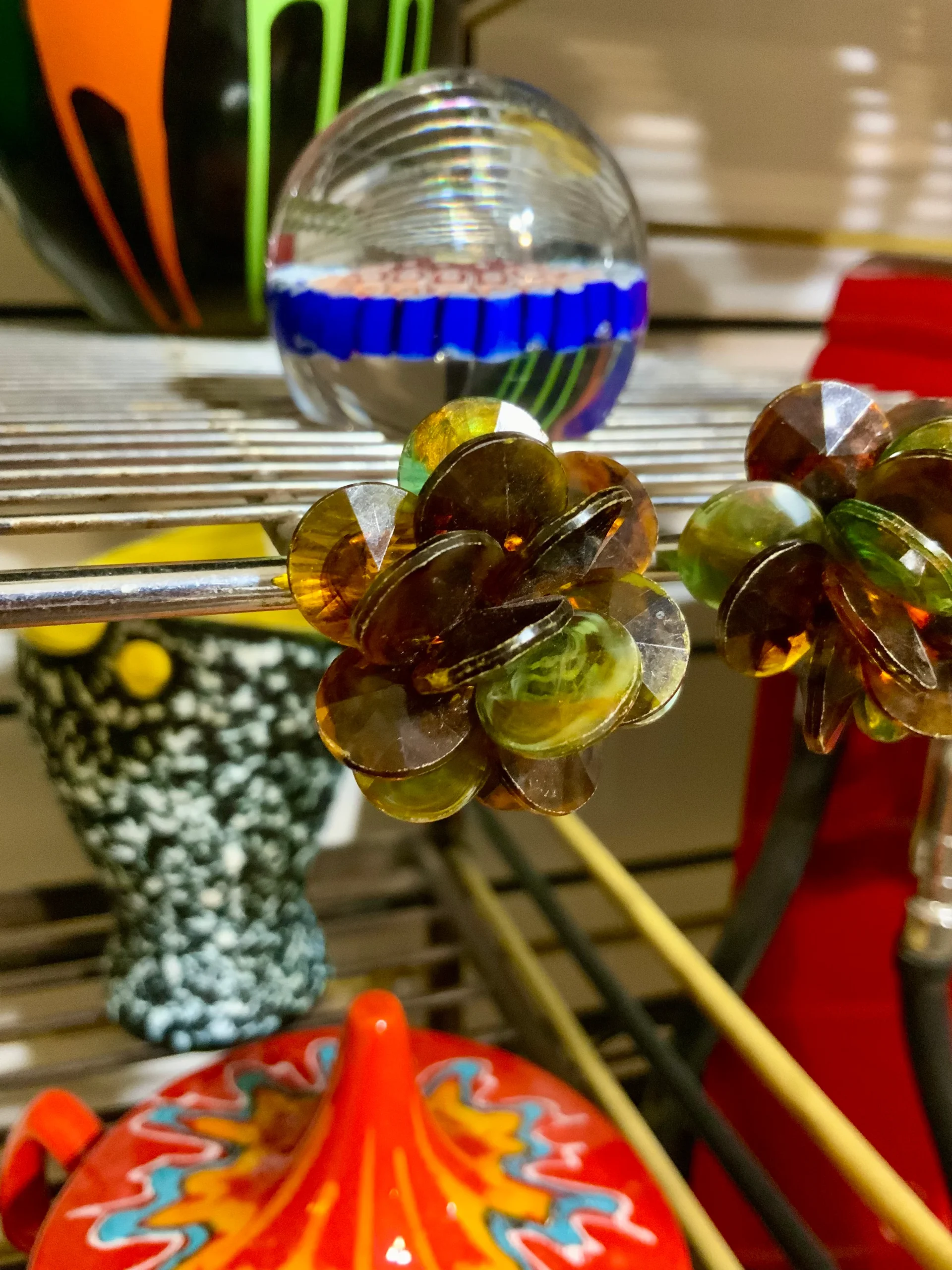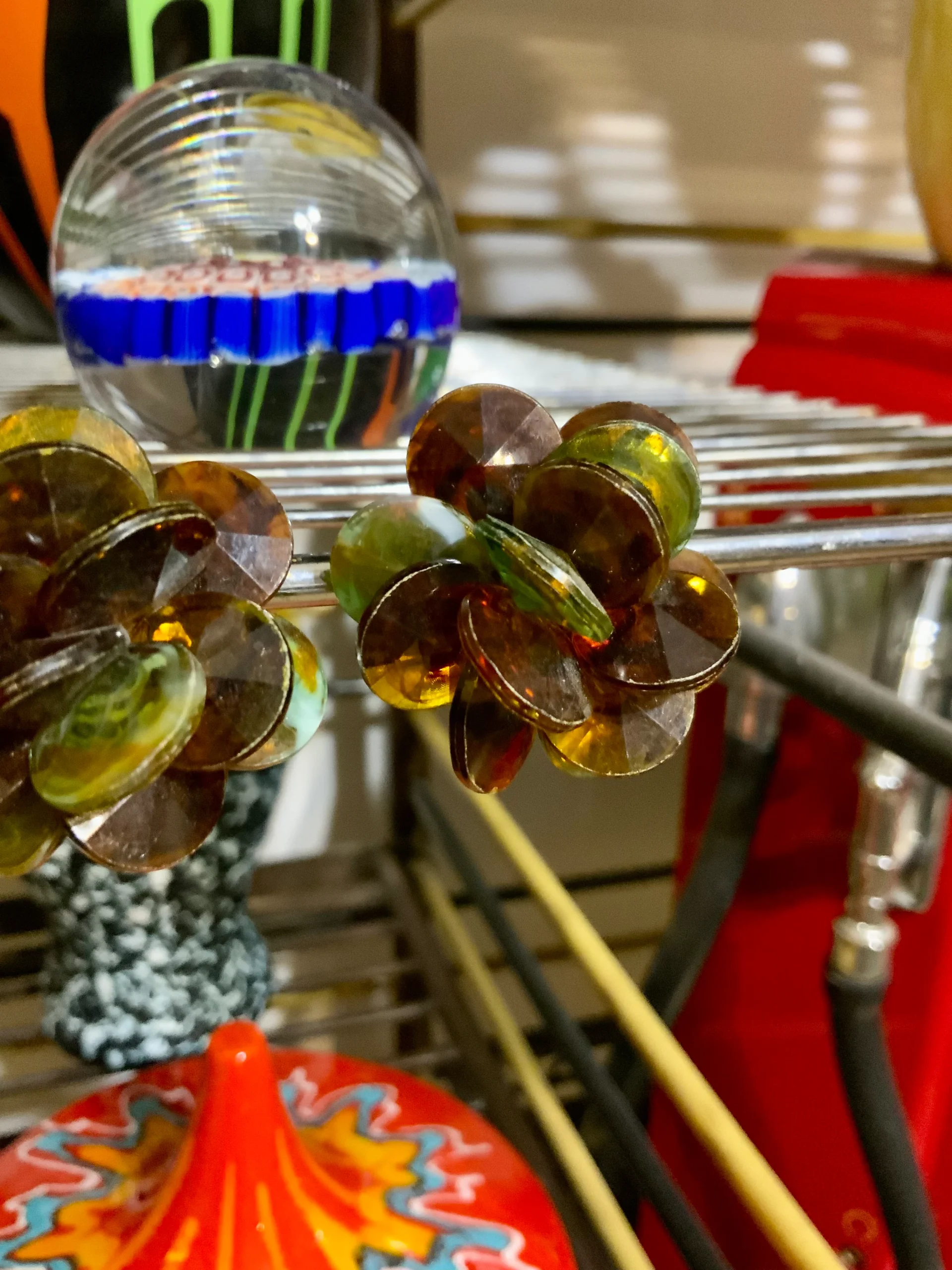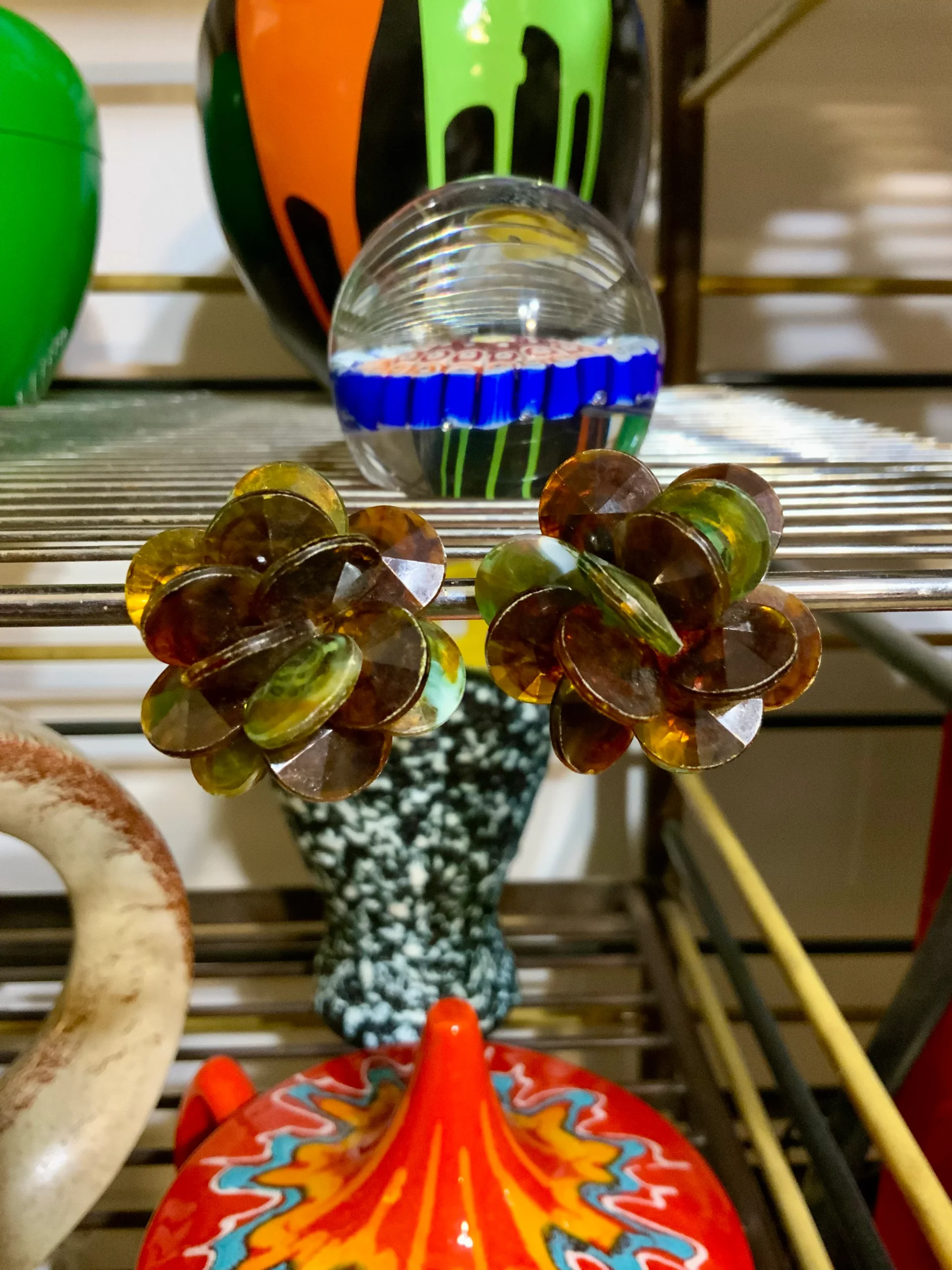 Boucles d’oreilles Vintage plastique marbré marron et vert et métal doré.