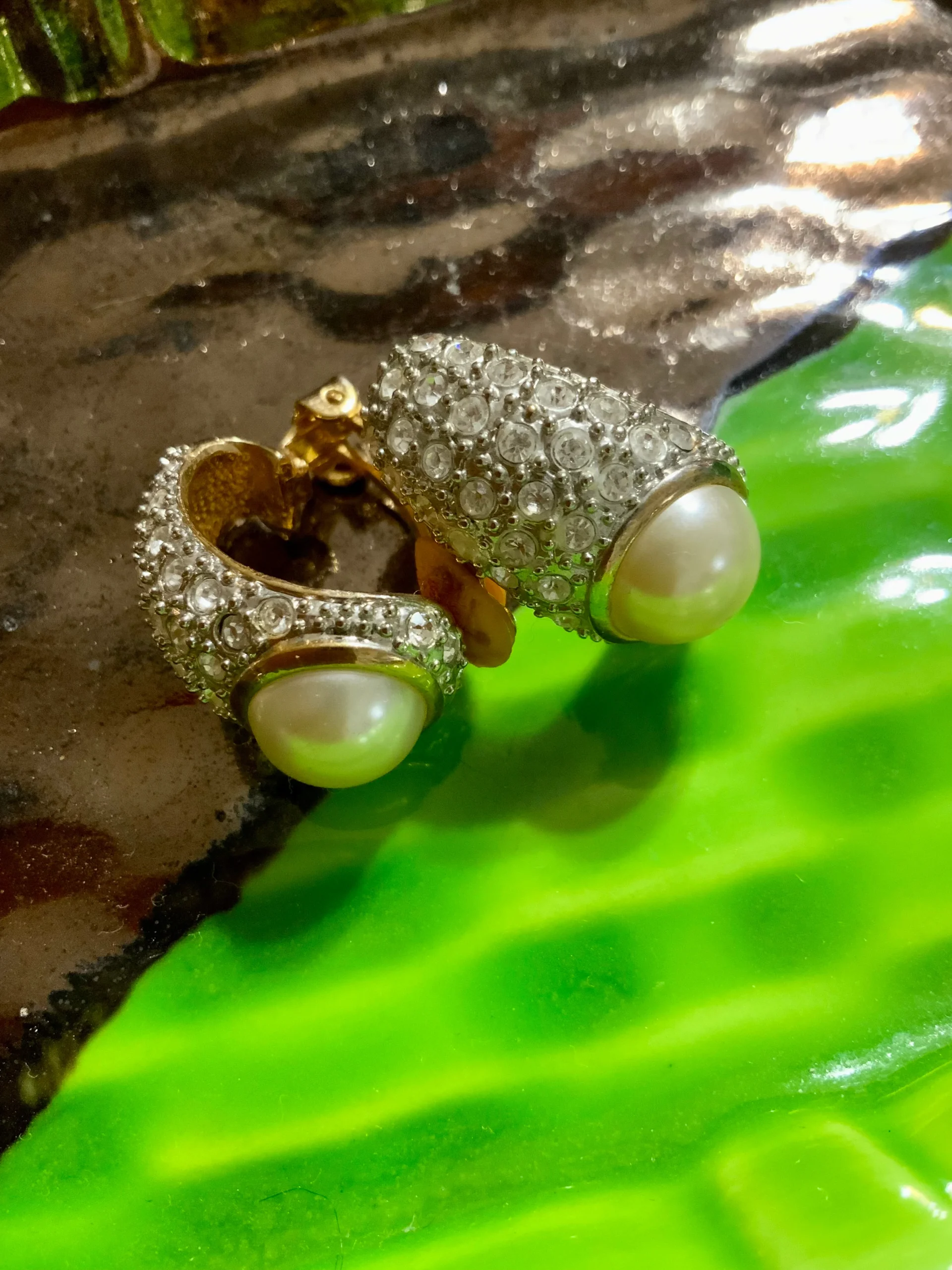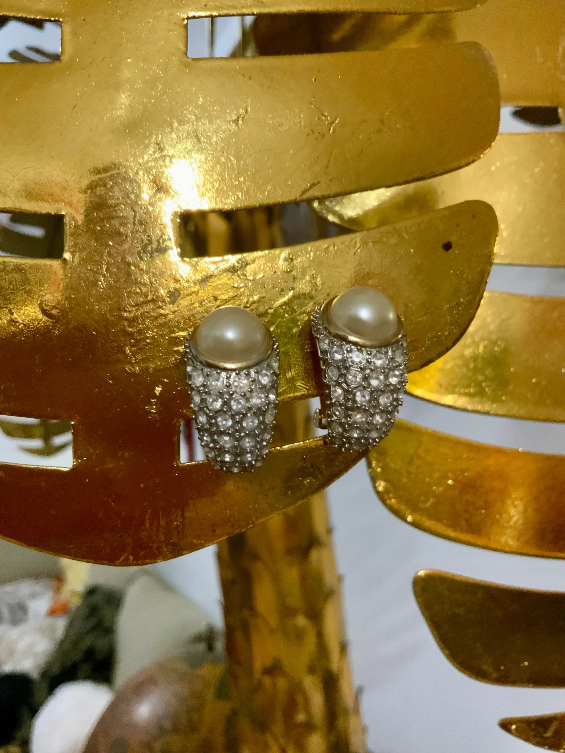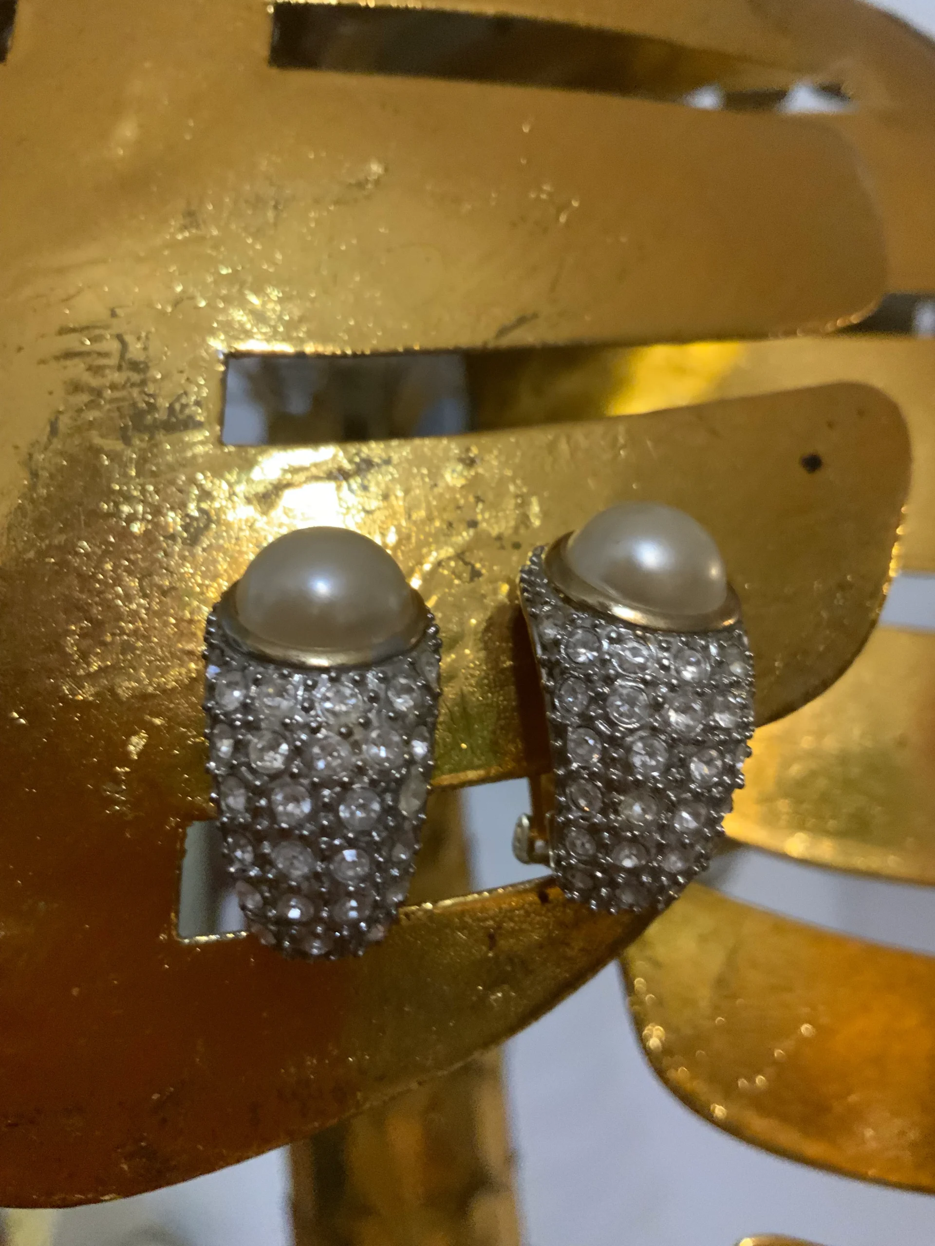 Sublimes boucles d oreilles Vintage Zirconiums, métal doré plaqué or et 1/2 grosse perle intégrée dans les pierres.