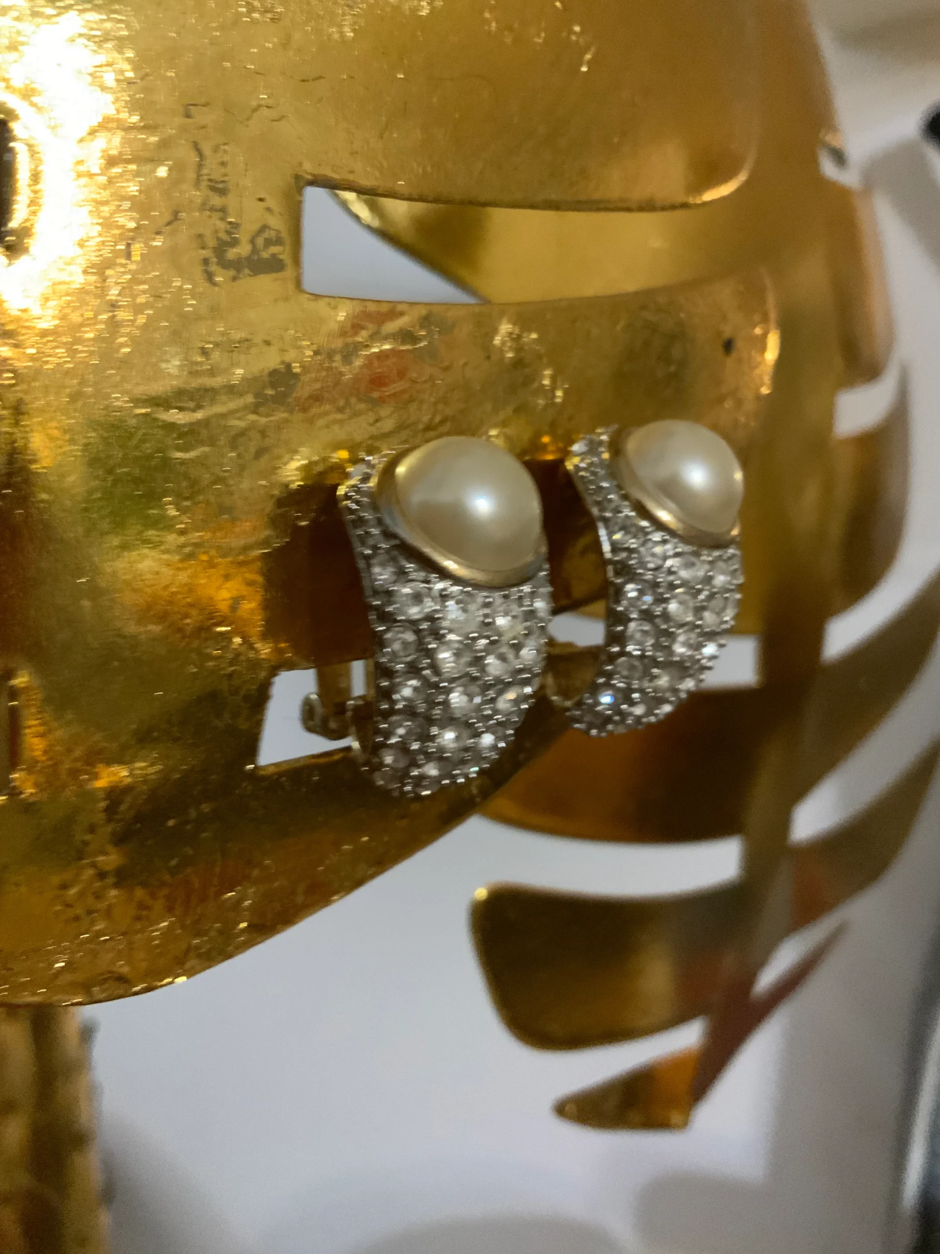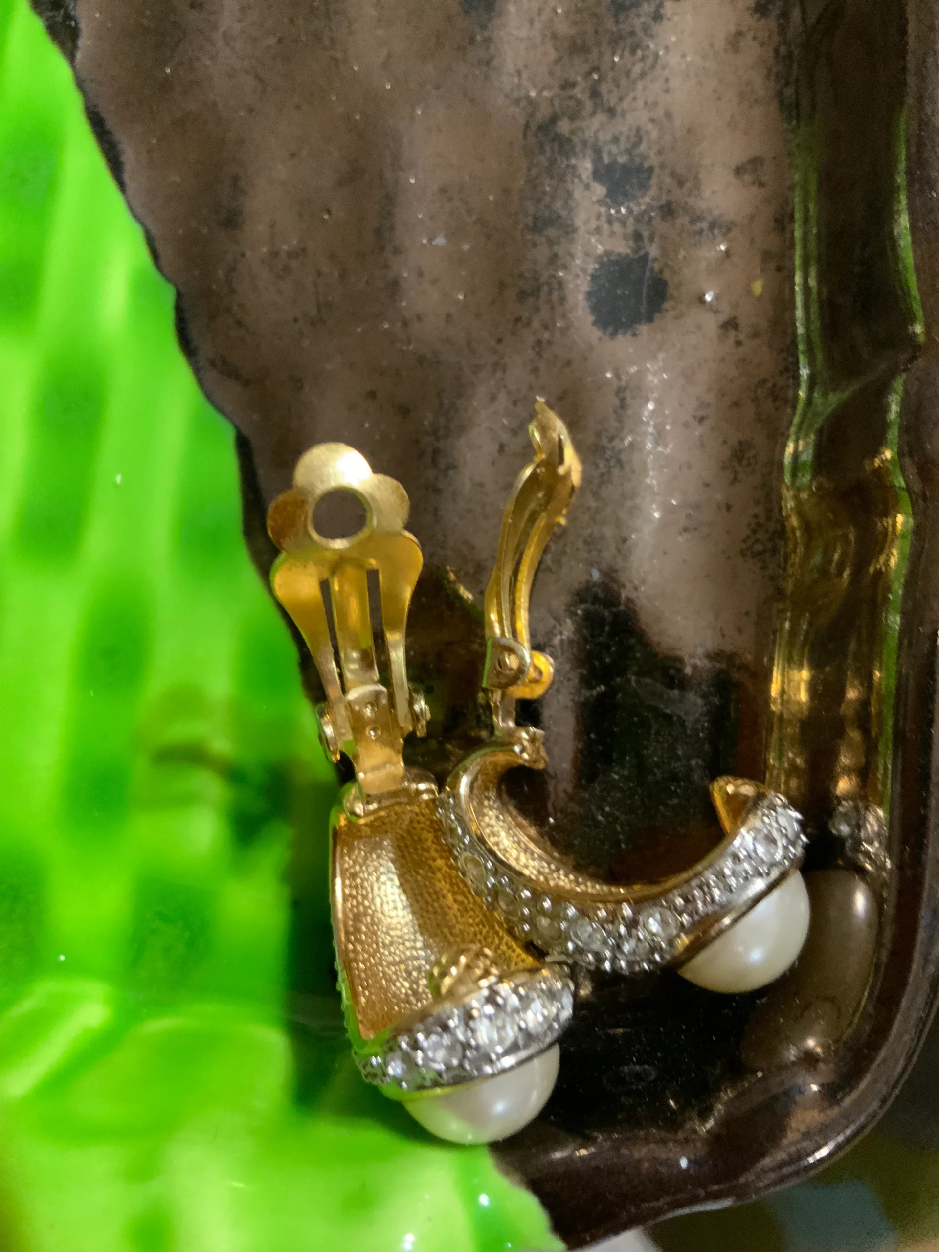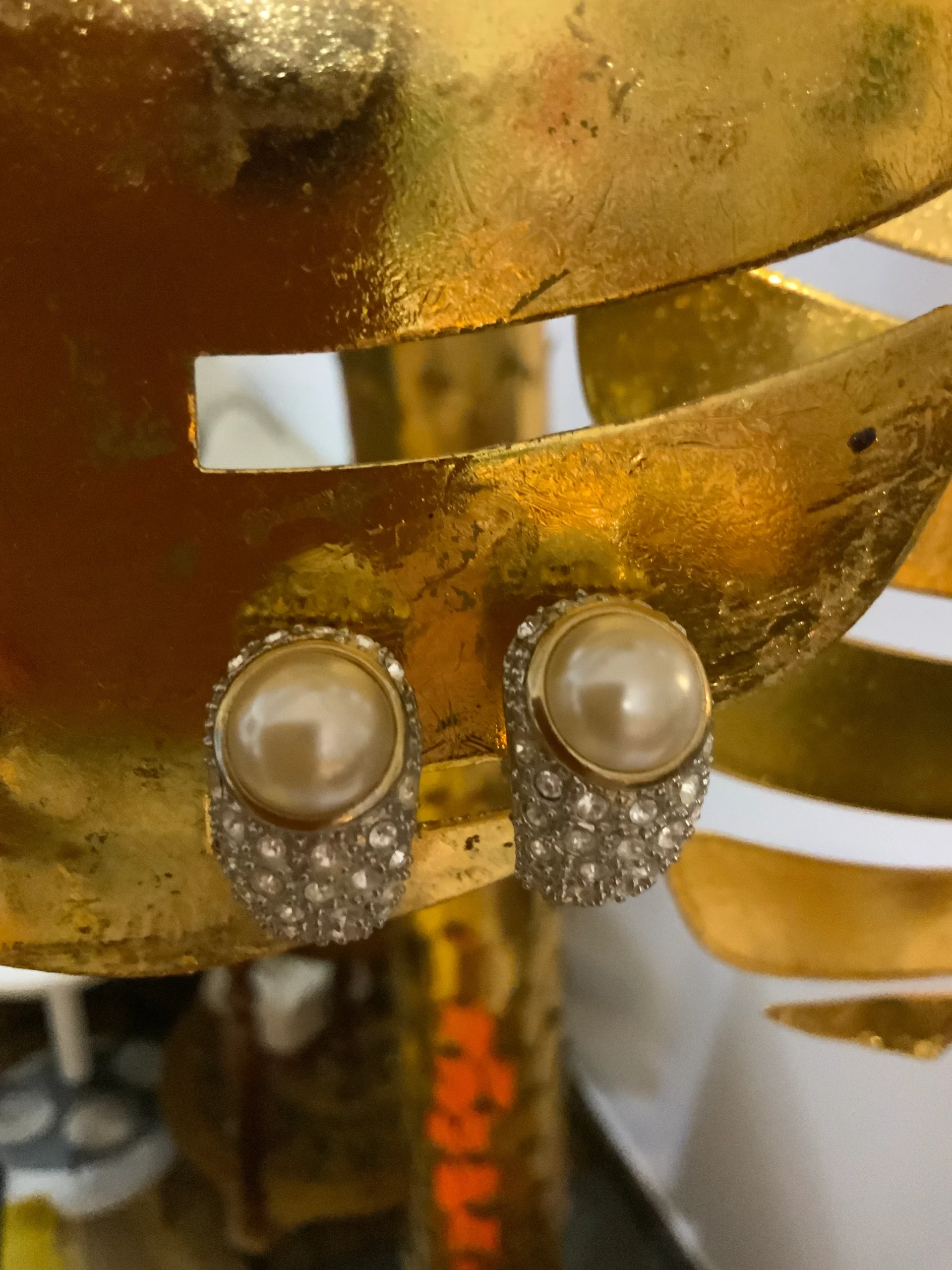 Sublimes boucles d oreilles Vintage Zirconiums, métal doré plaqué or et 1/2 grosse perle intégrée dans les pierres.
