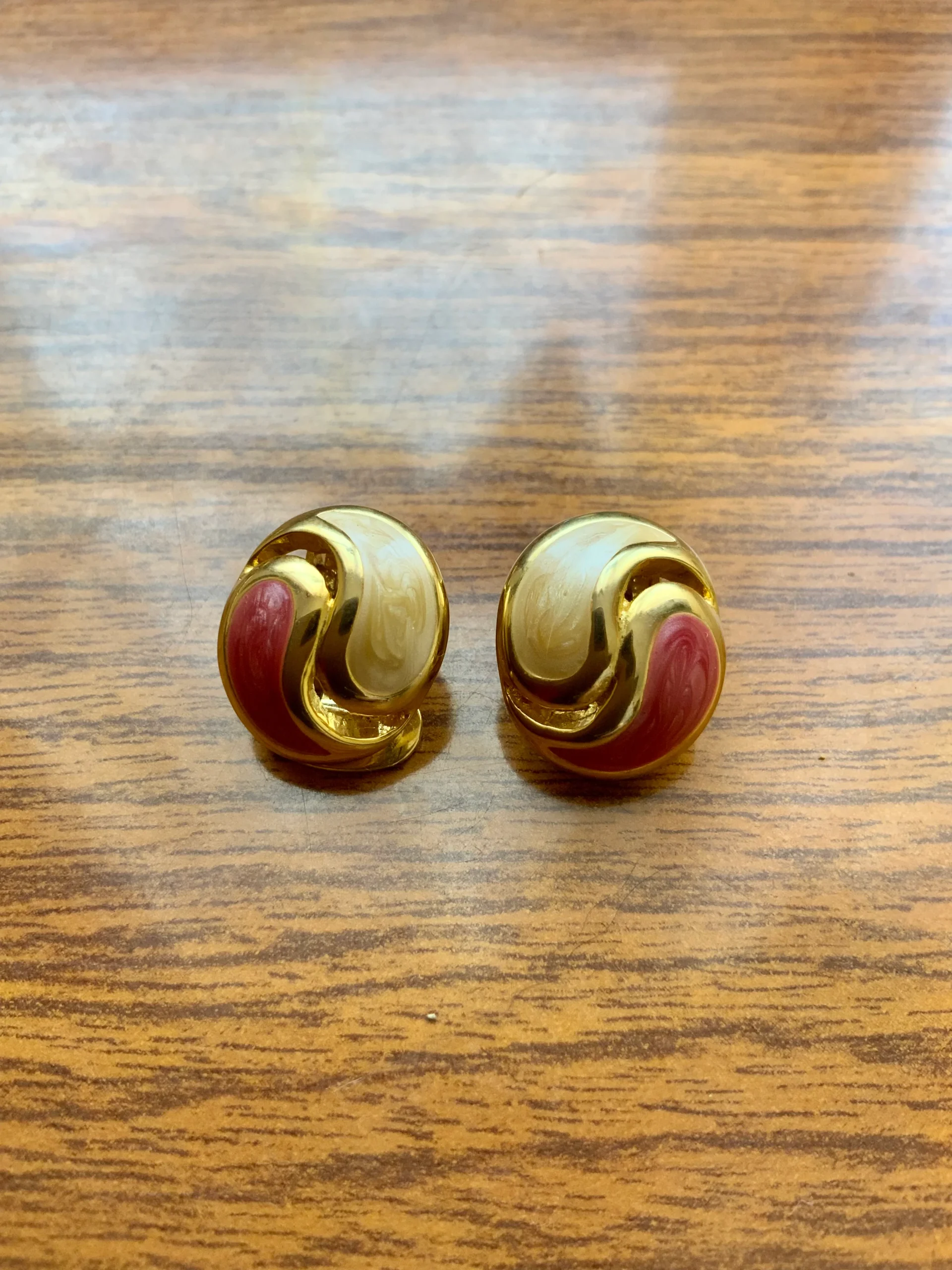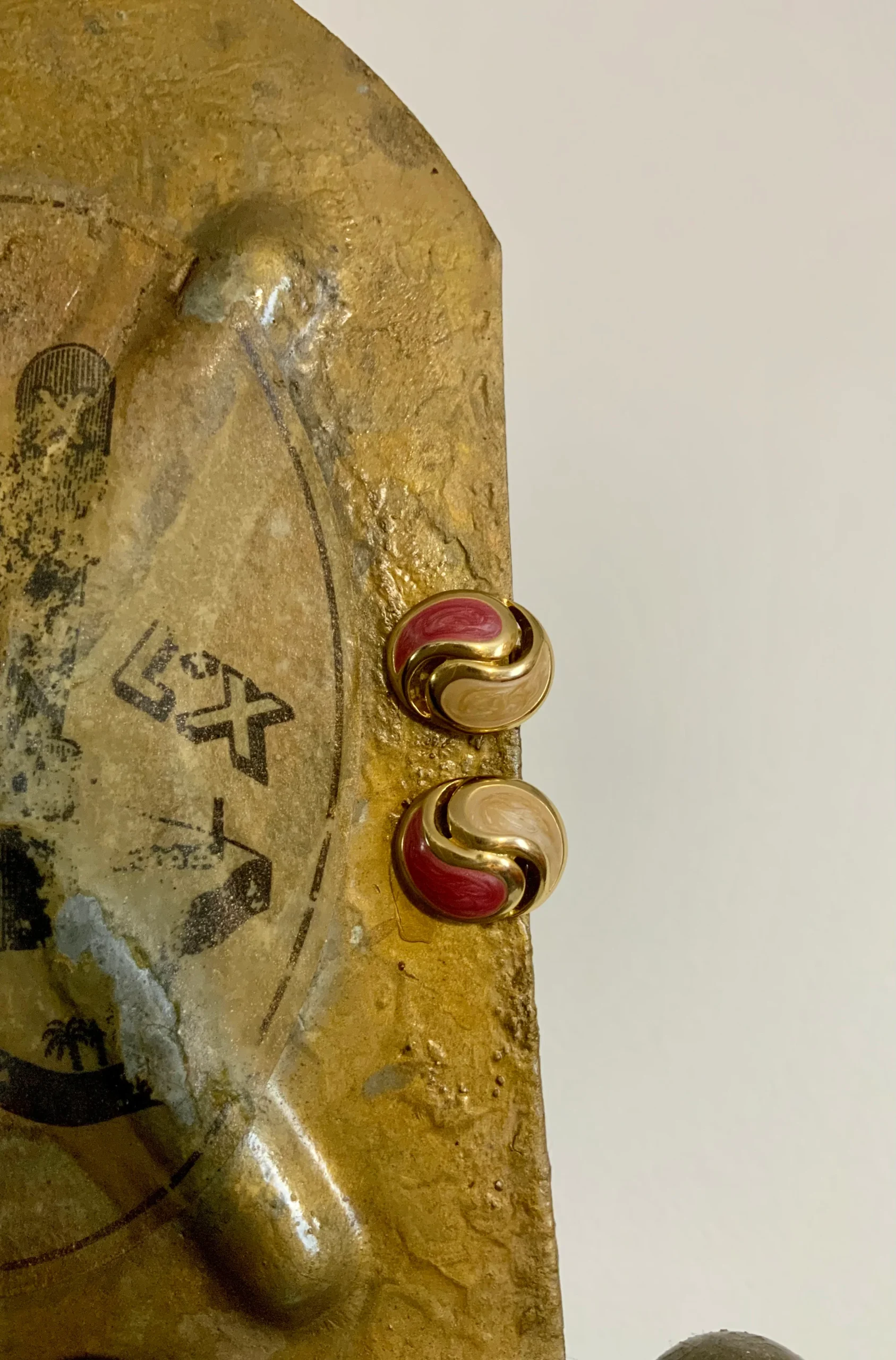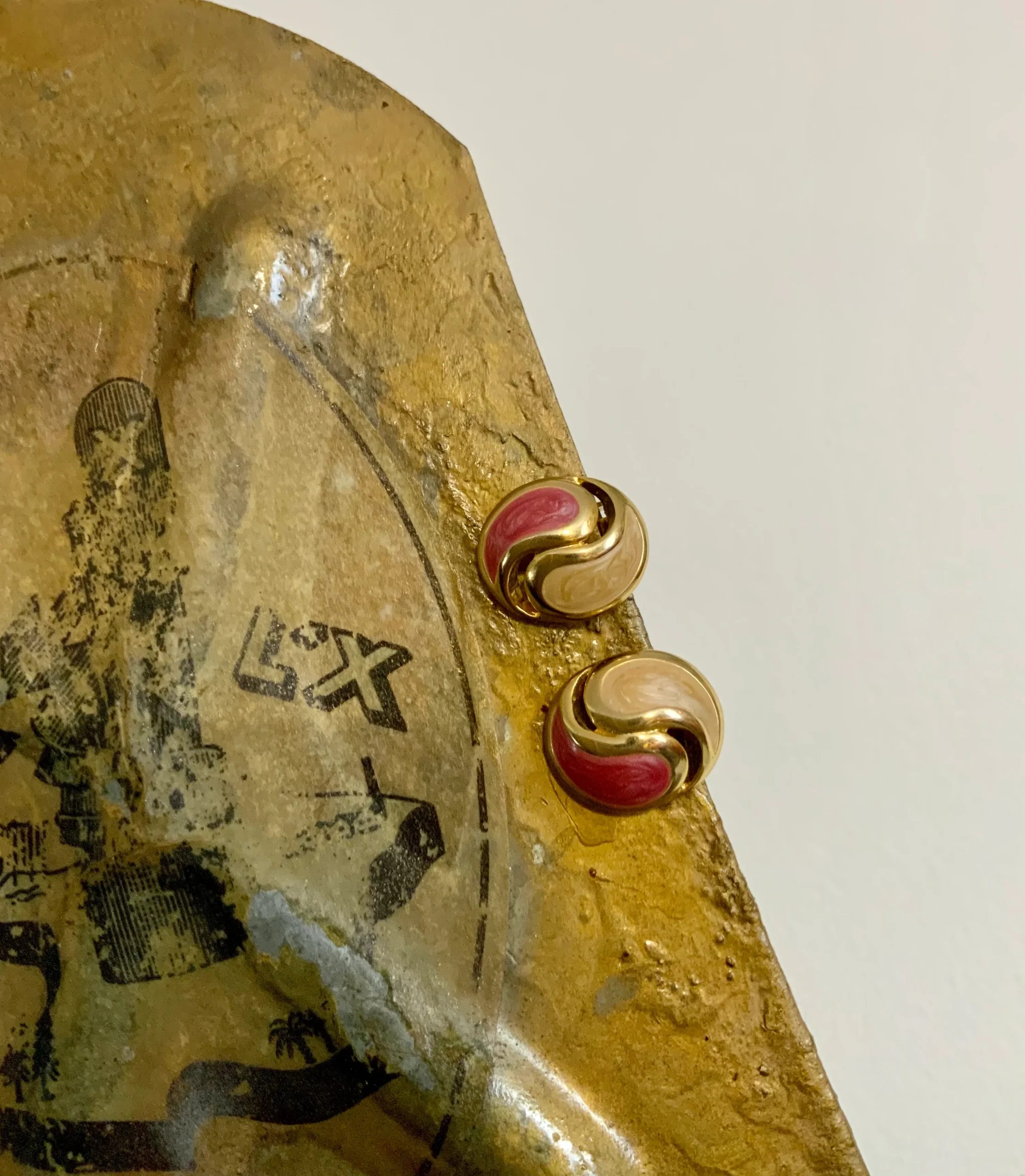 Ravissantes boucles d’oreilles Vintage des années 1980/90 en métal doré peintes nacrées tons rosés – Excellent état – À Clips.