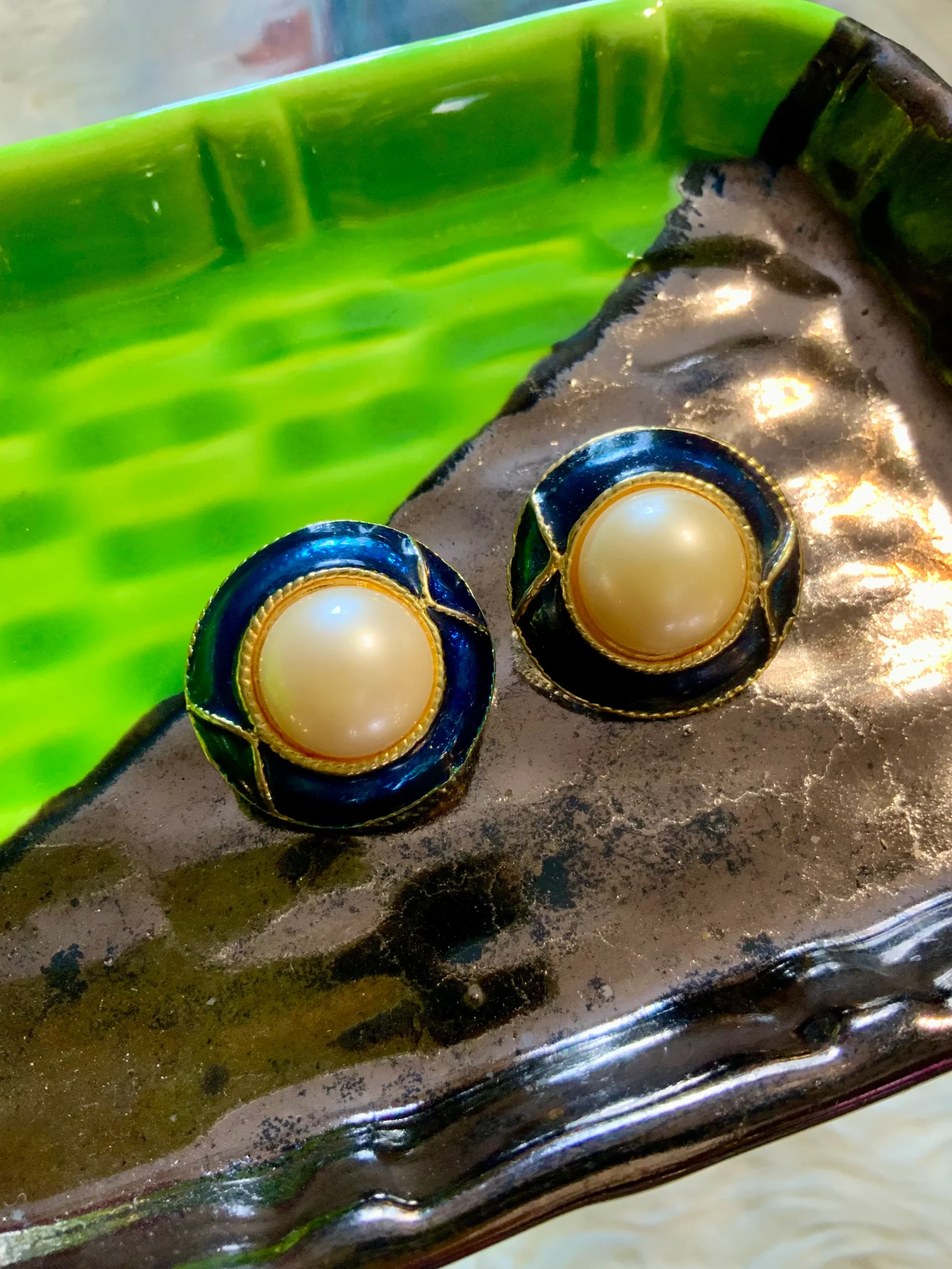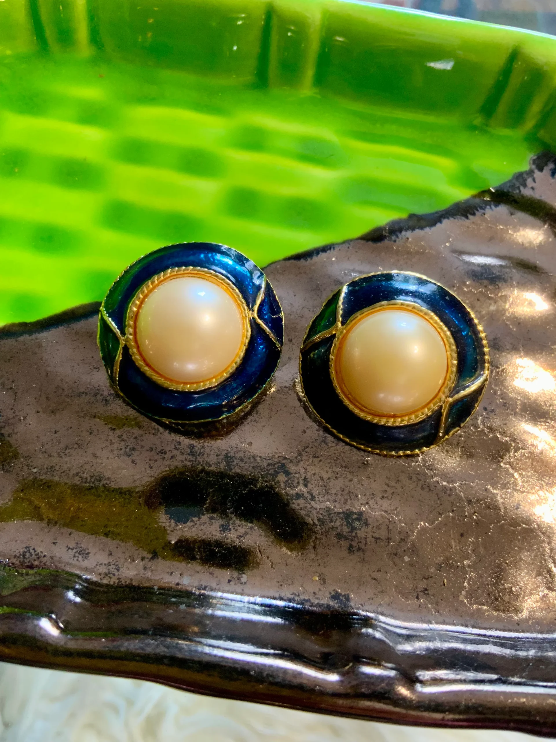 Boucles d’oreilles vintage rondes avec grosse perle et émail bleu autour – Excellent état juste à bien nettoyer dos – Tout métal doré.
