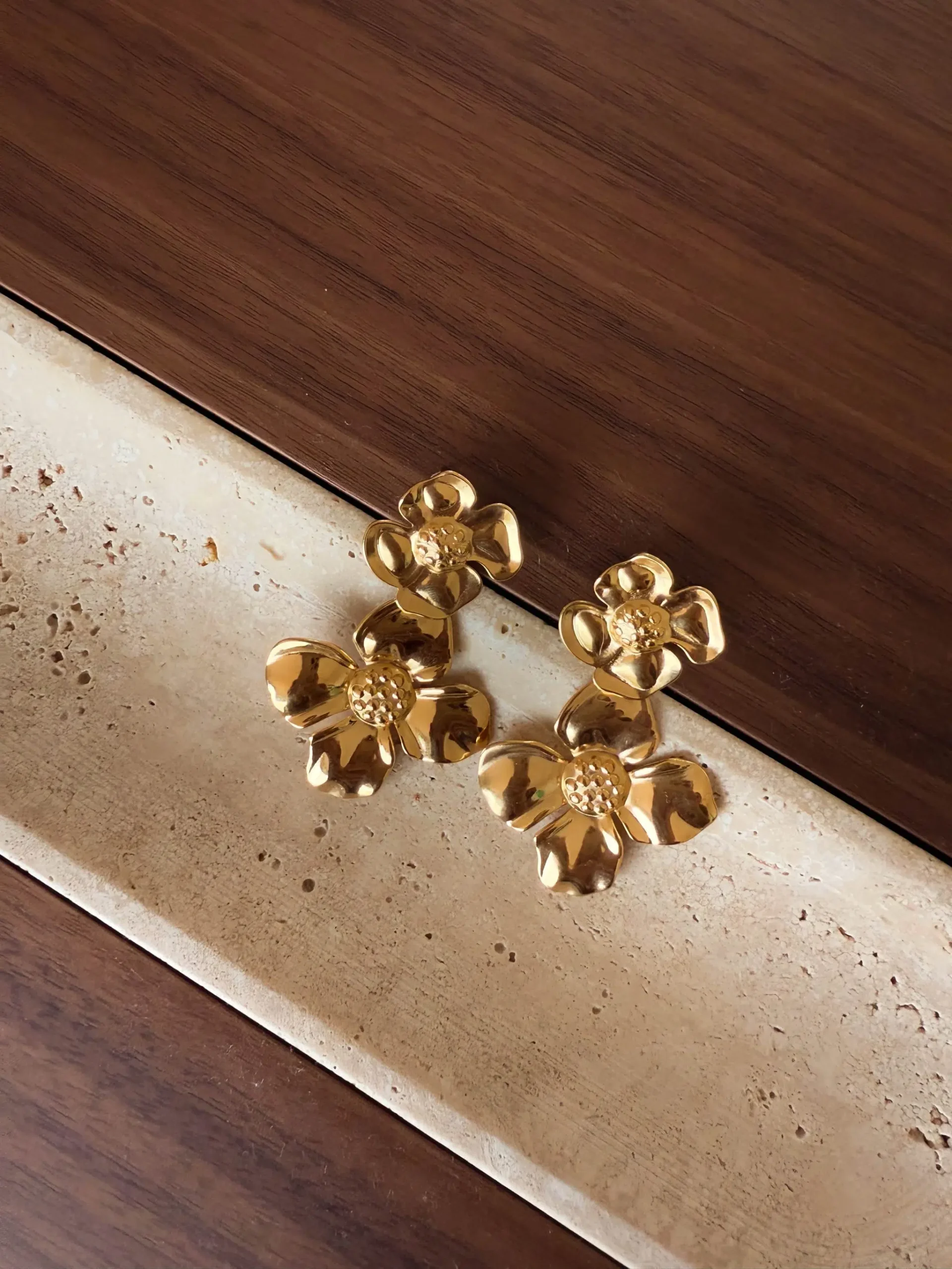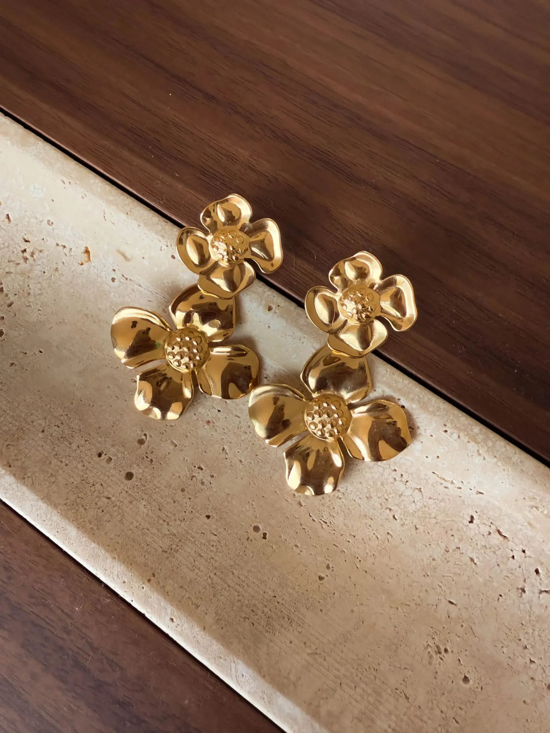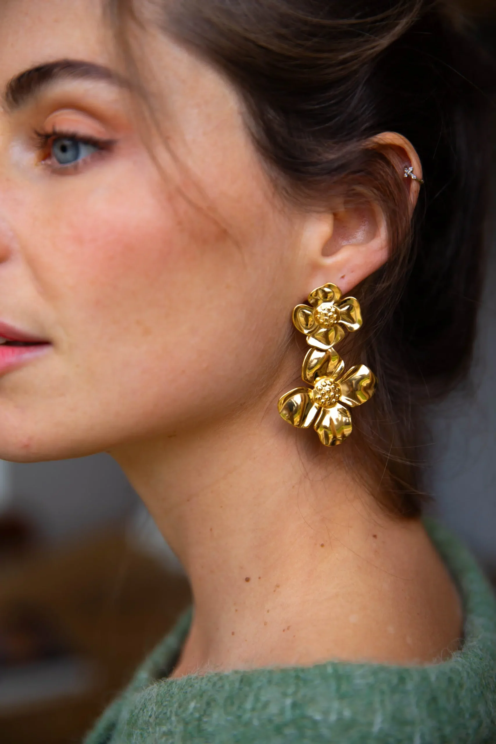 – Boucles d’oreilles pendantes – Pour oreilles percées – Deux fleurs par boucle – Dorée – Acier inoxydable