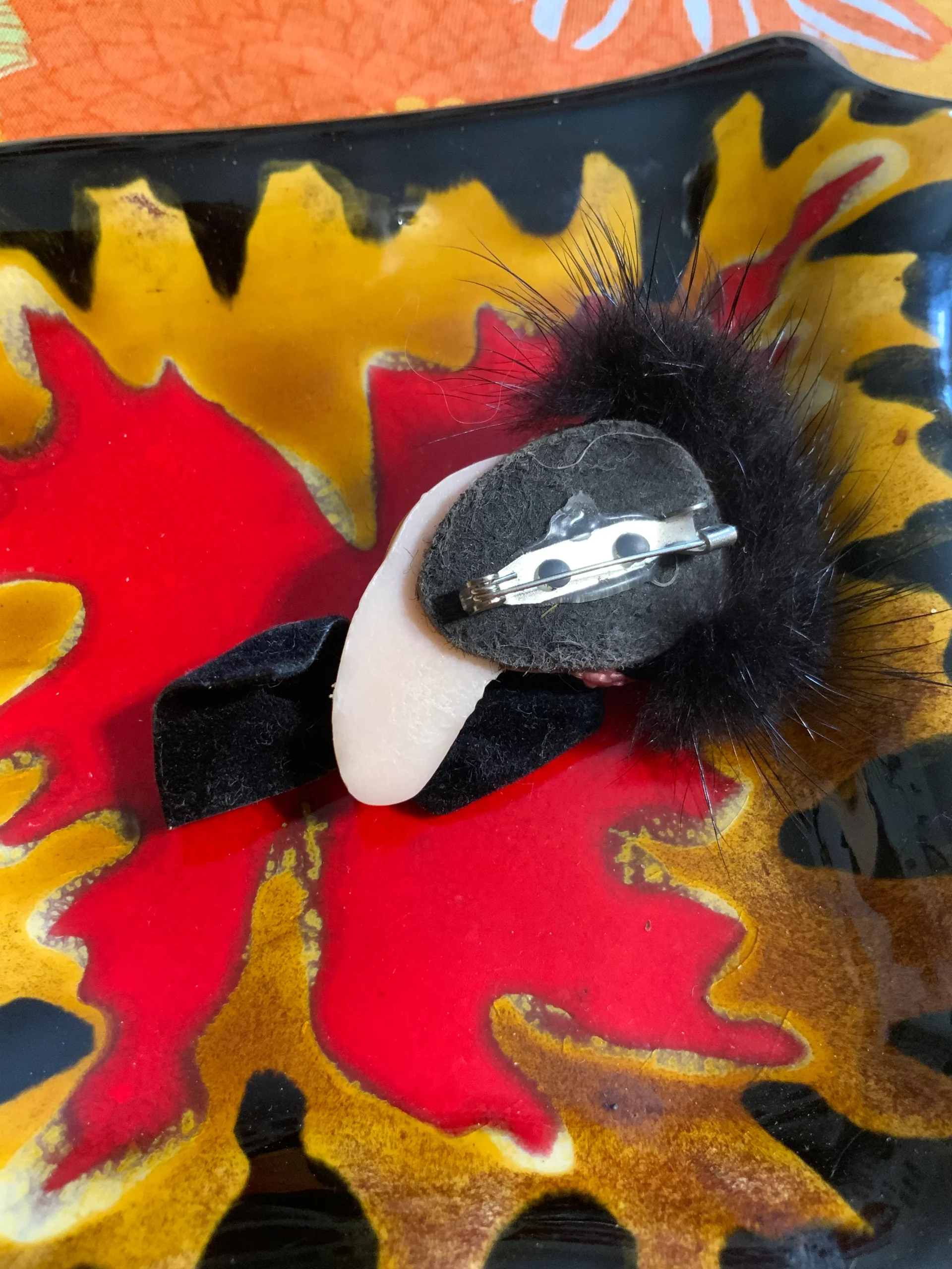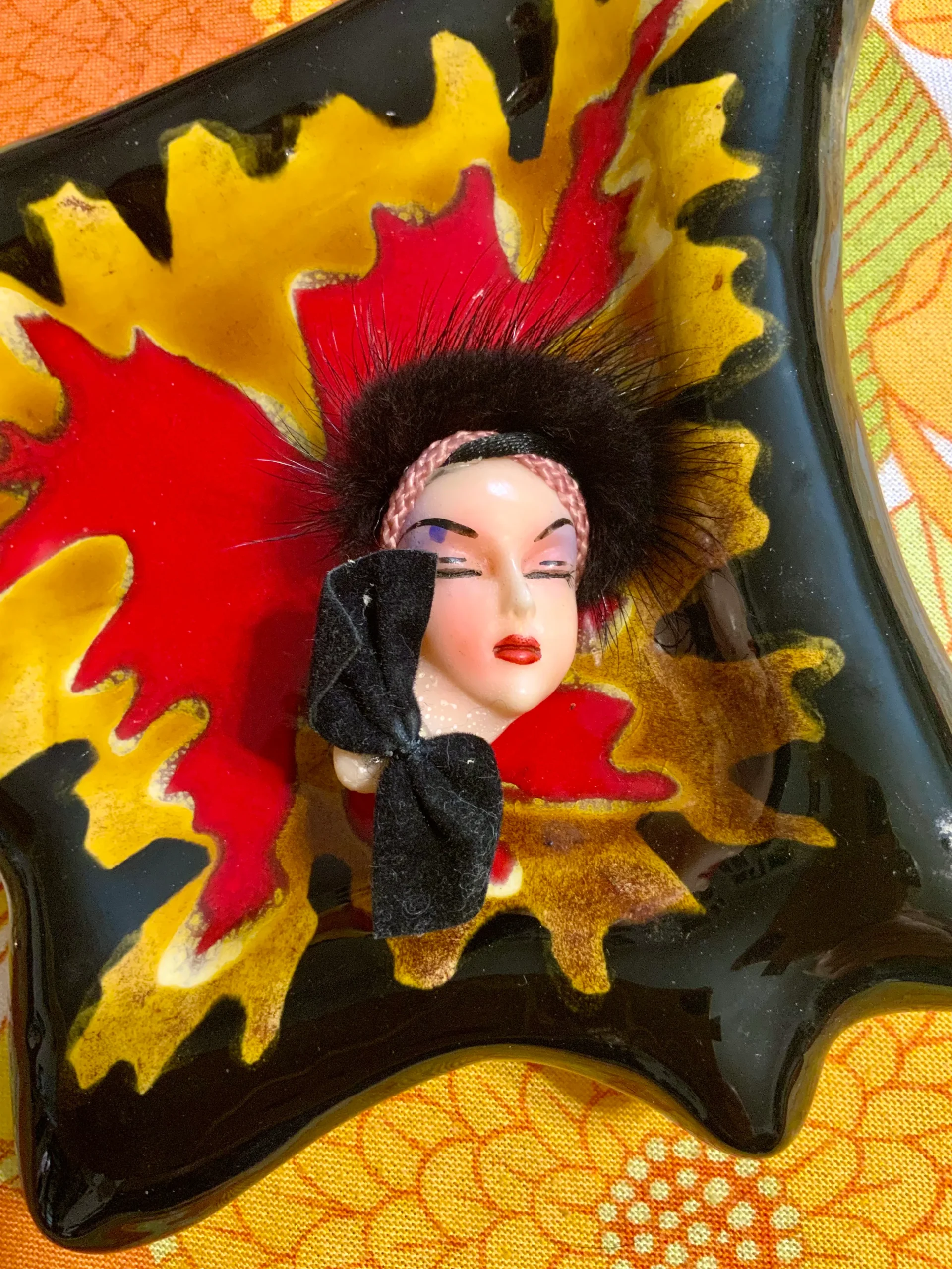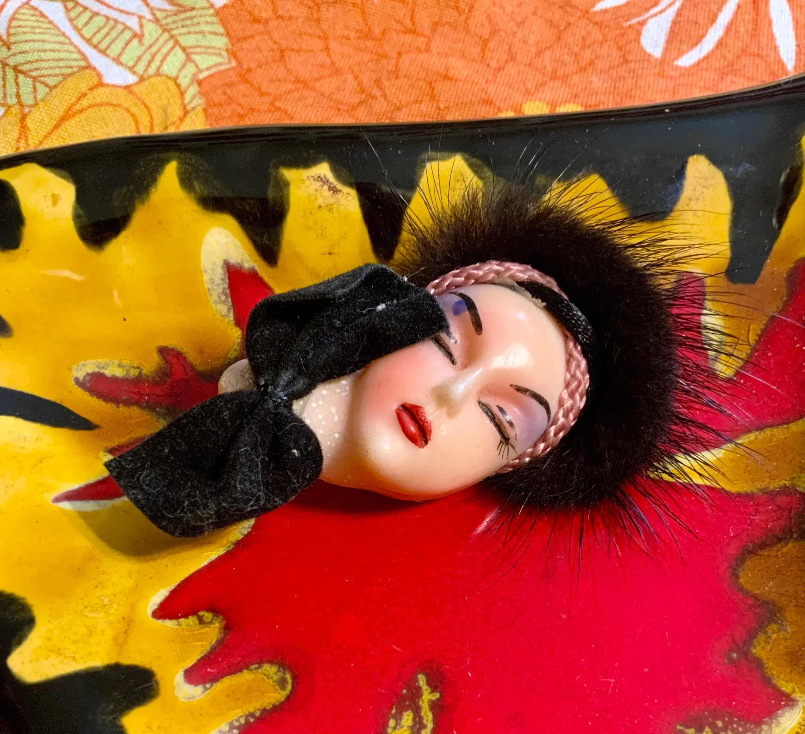 Tres belle broche personnage tête de femme avec fourrure Vintage Ancien 1950/60- Léger points blancs si le cou masqué avec le petit Noeud en velours, sinon excellent état.