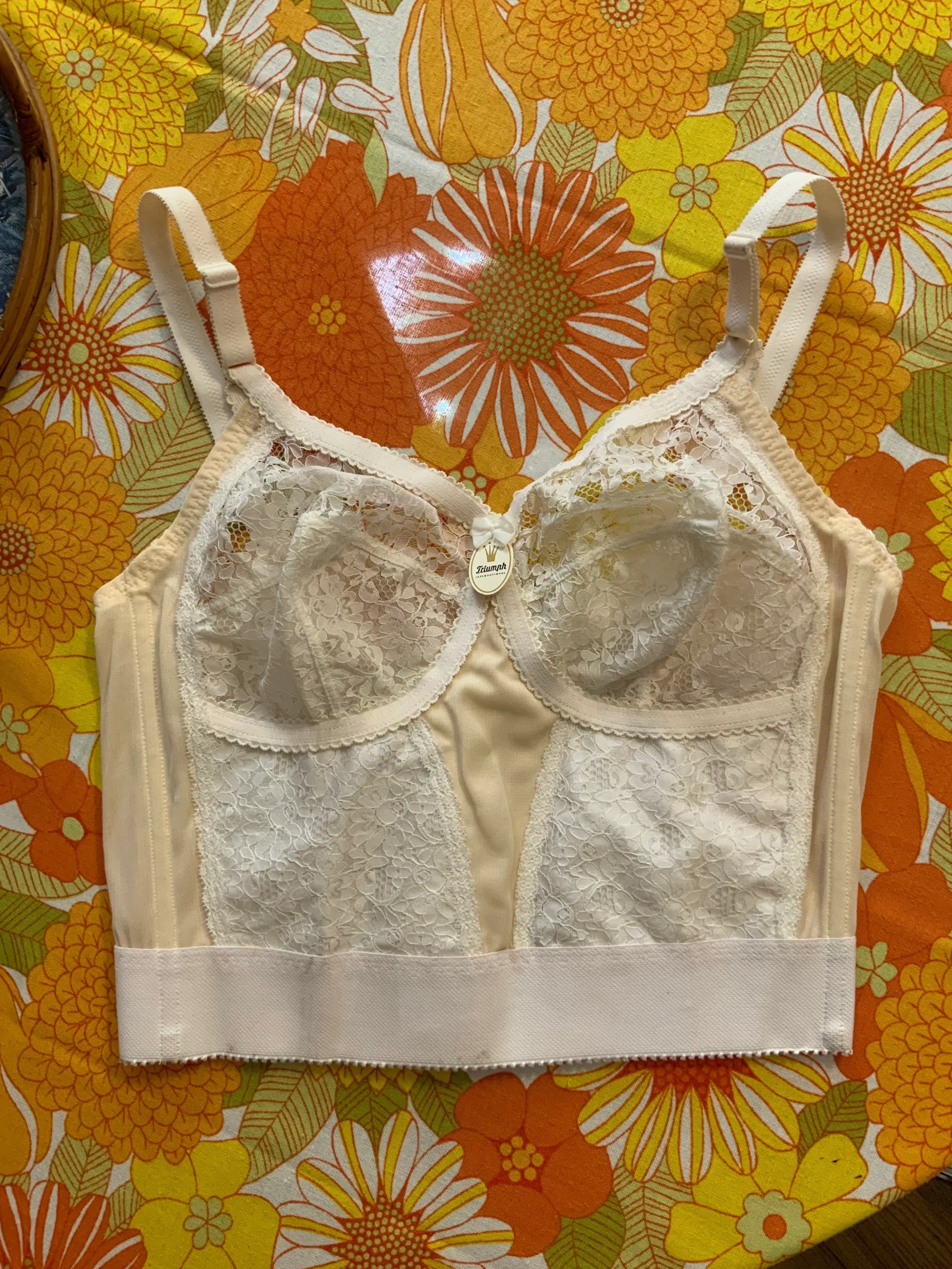 Dentelle Blanche motifs Fleurs Vintage Neuf 1970 – 0 défaut Taille indique Large 2 rangs agrafes dos réglables.