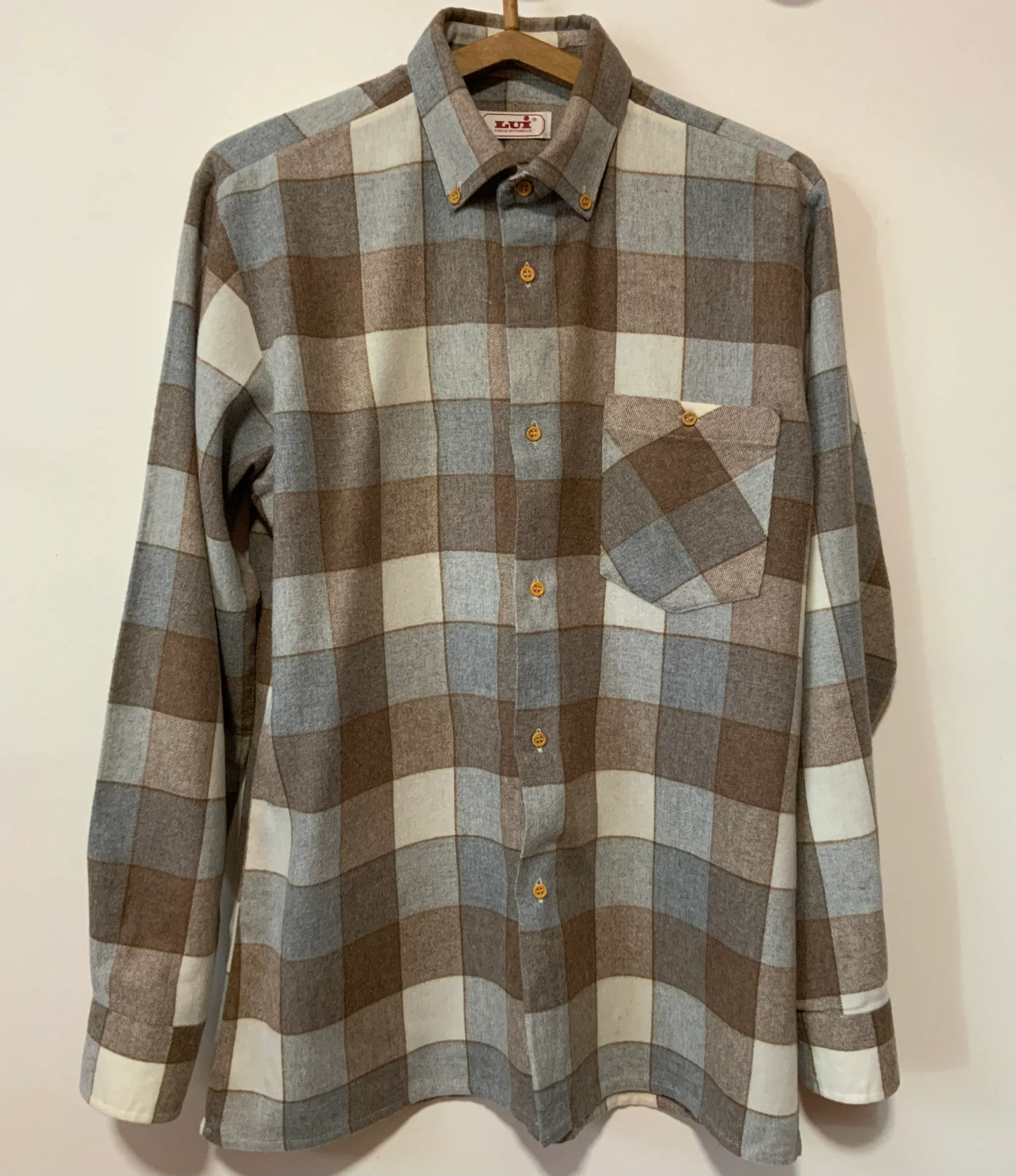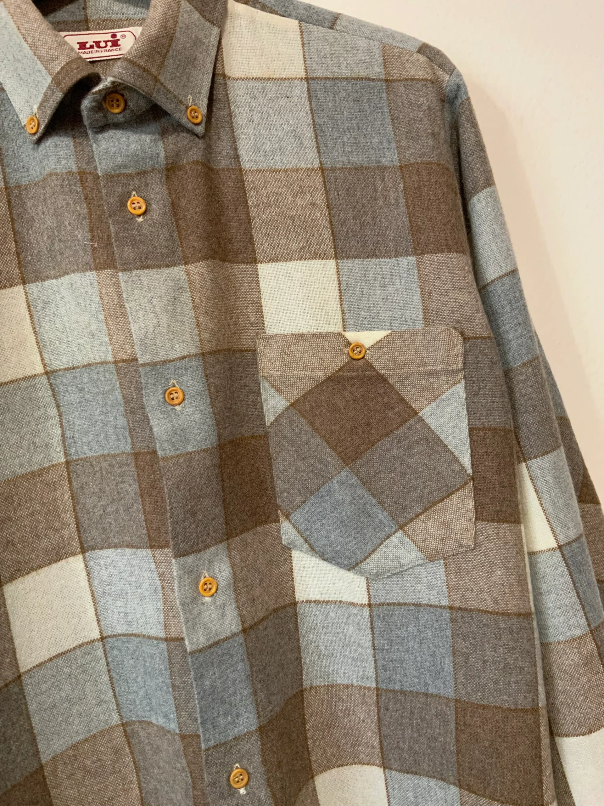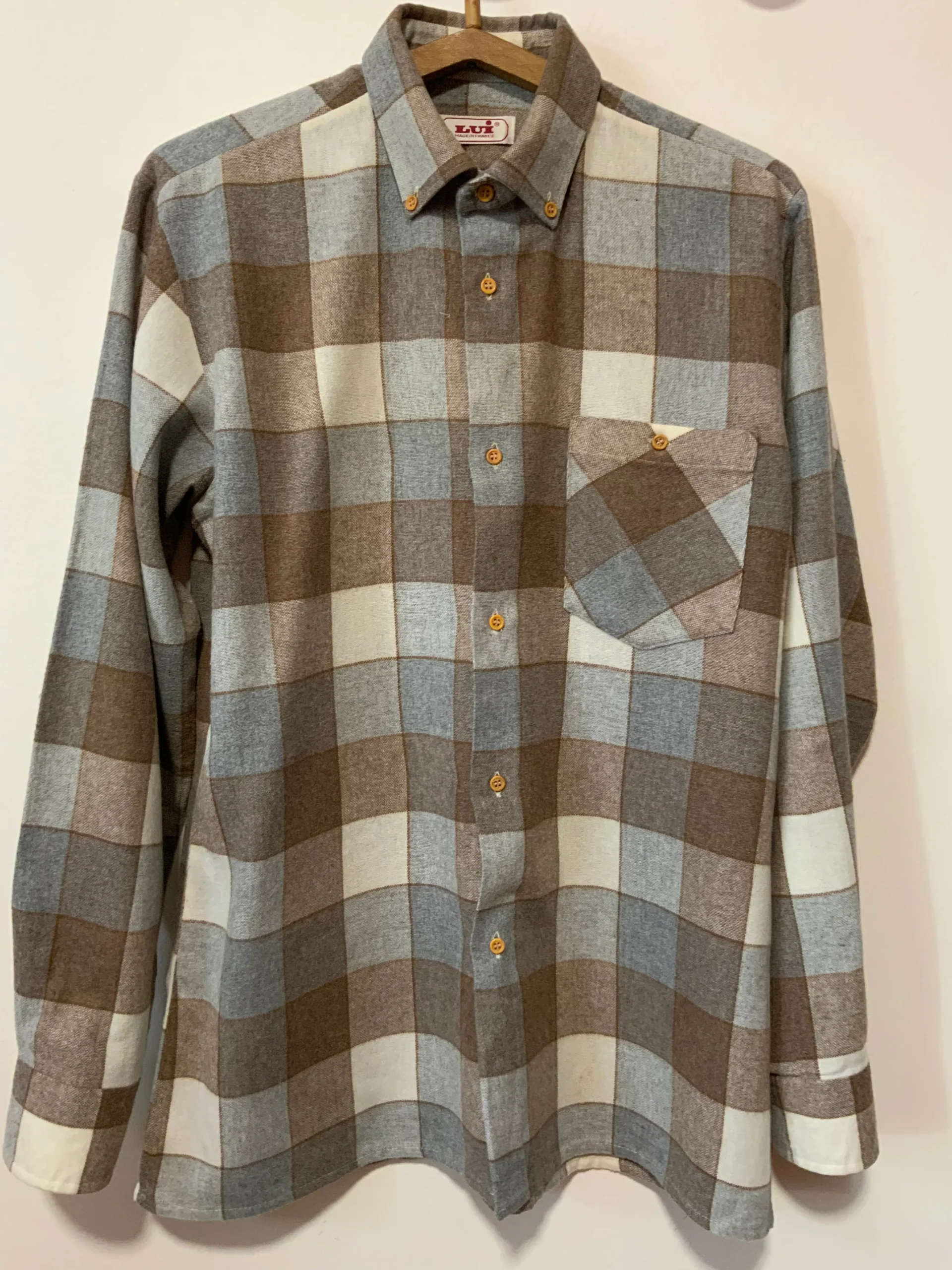 Ravissante chemise chic vintage 1980 Marque Lui Fabriquée en France – Neuve DeadStock 1980 jamais portée – Tons élégants beige marron gris.