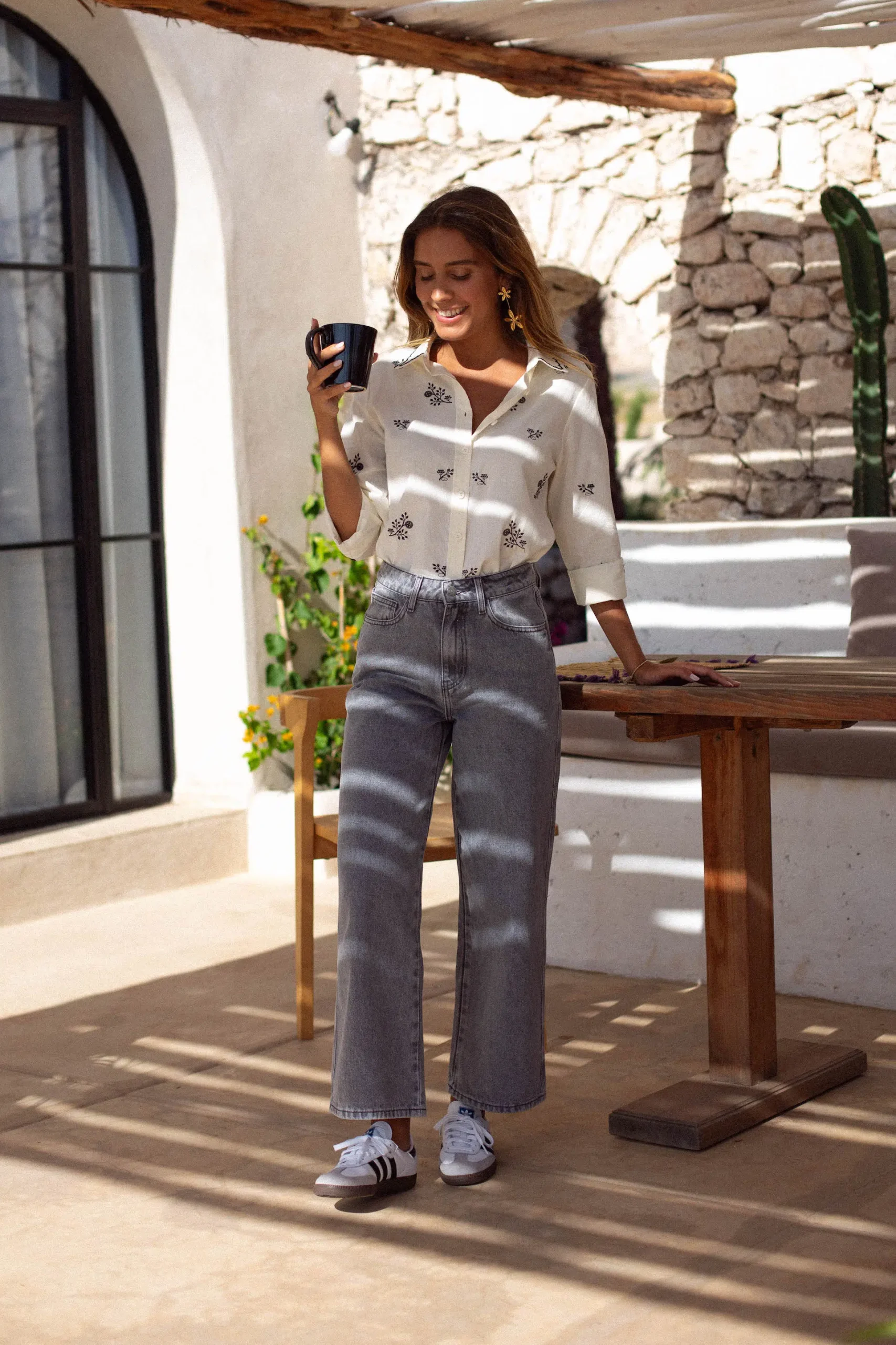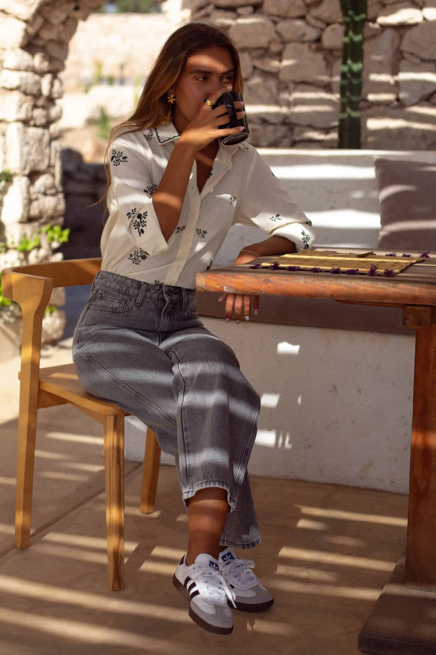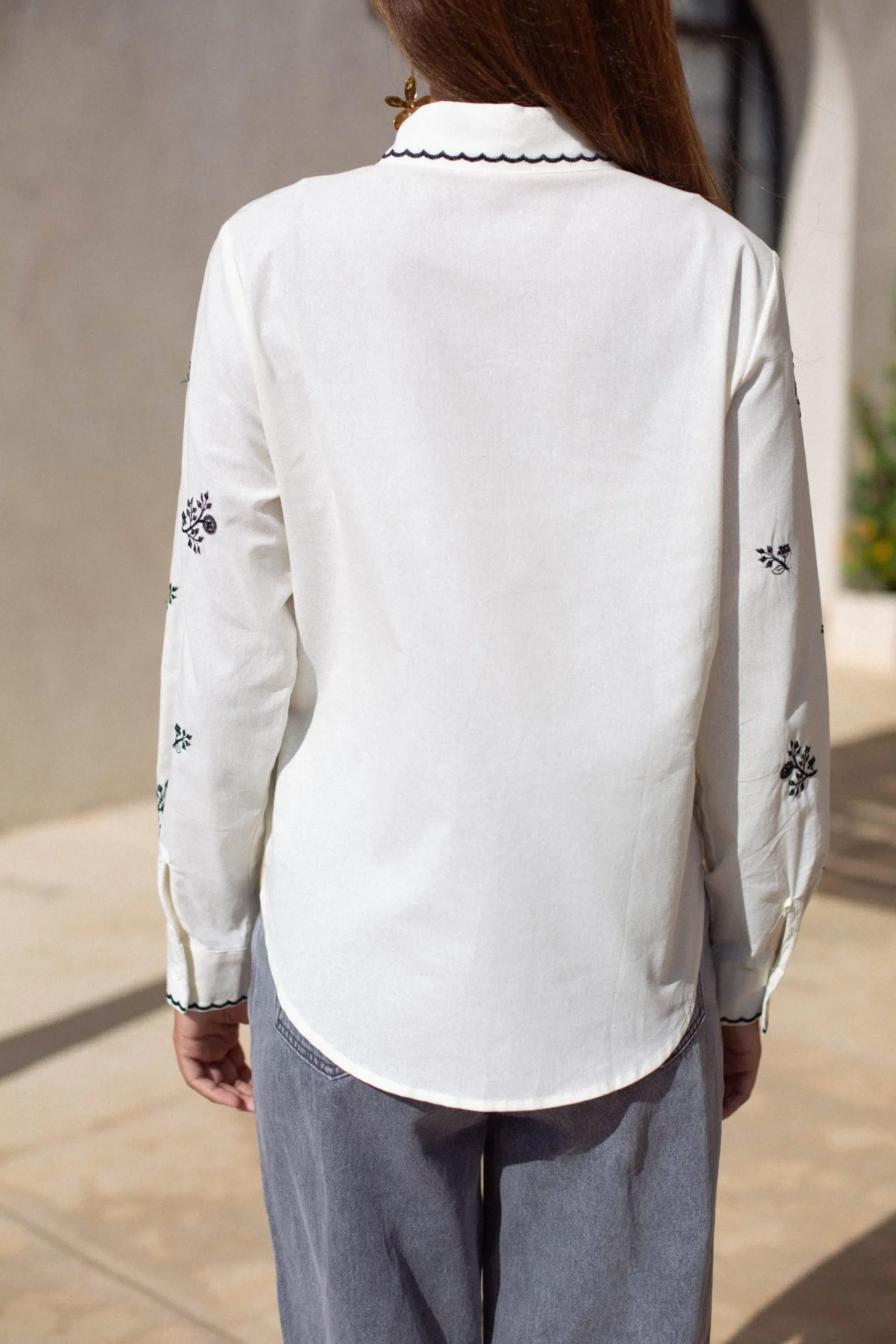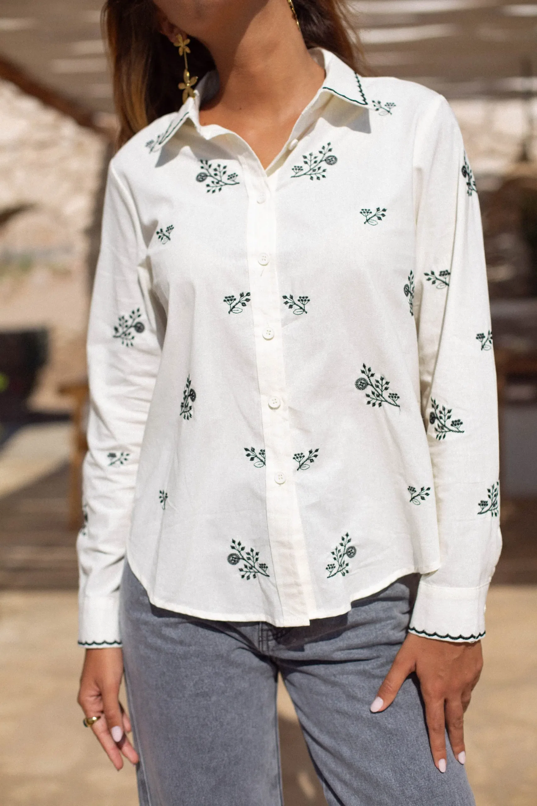 – Manches longues resserrées aux poignets – Fermeture par boutons à l’avant – Broderies fleuries noires – Couleur : écru et noir
