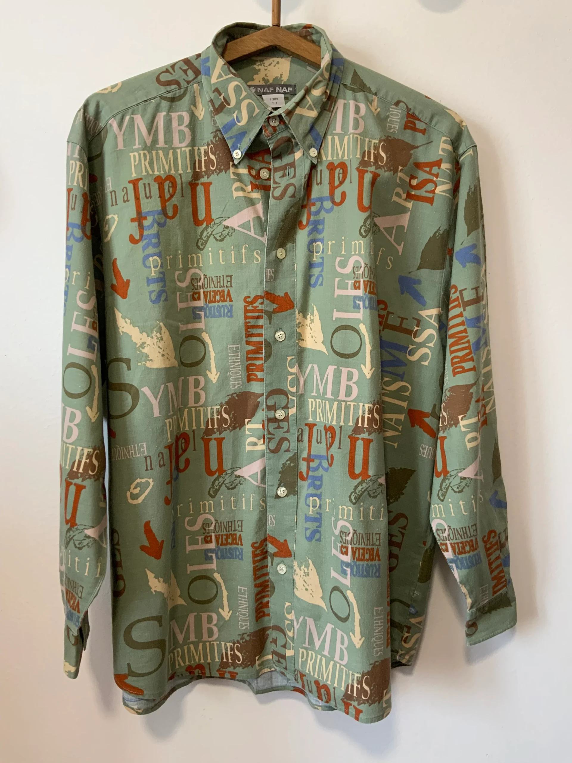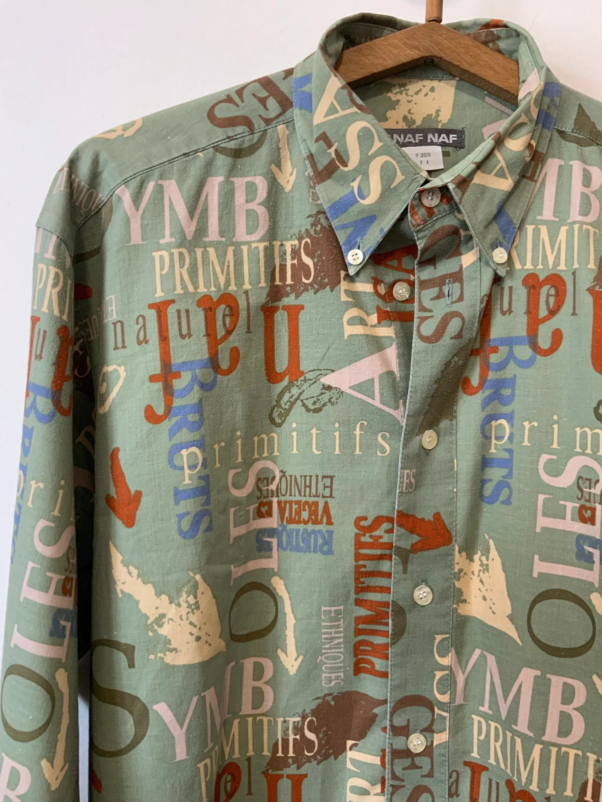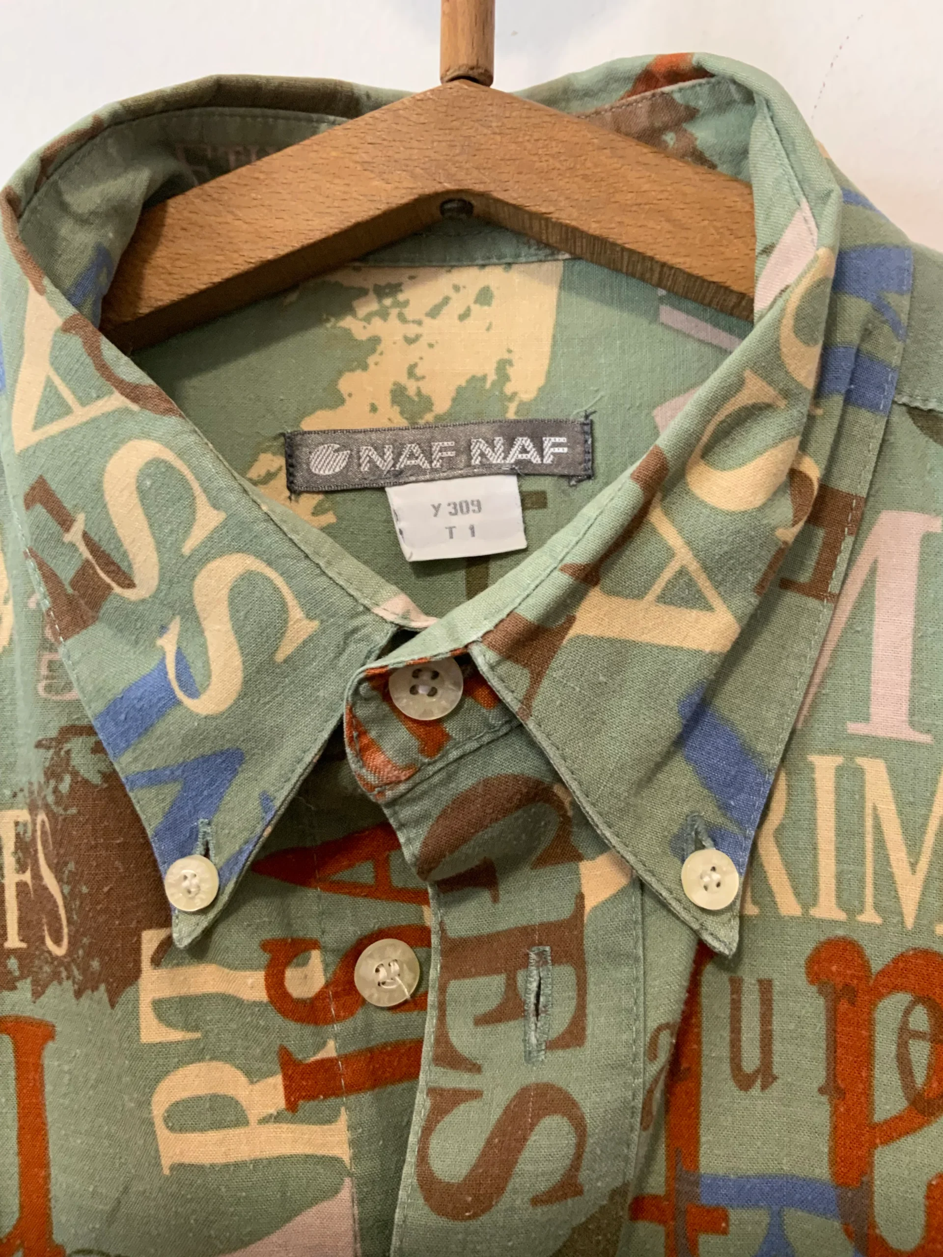 Chemise Naf Naf 1990 Kaki avec écritures Multicouleurs.