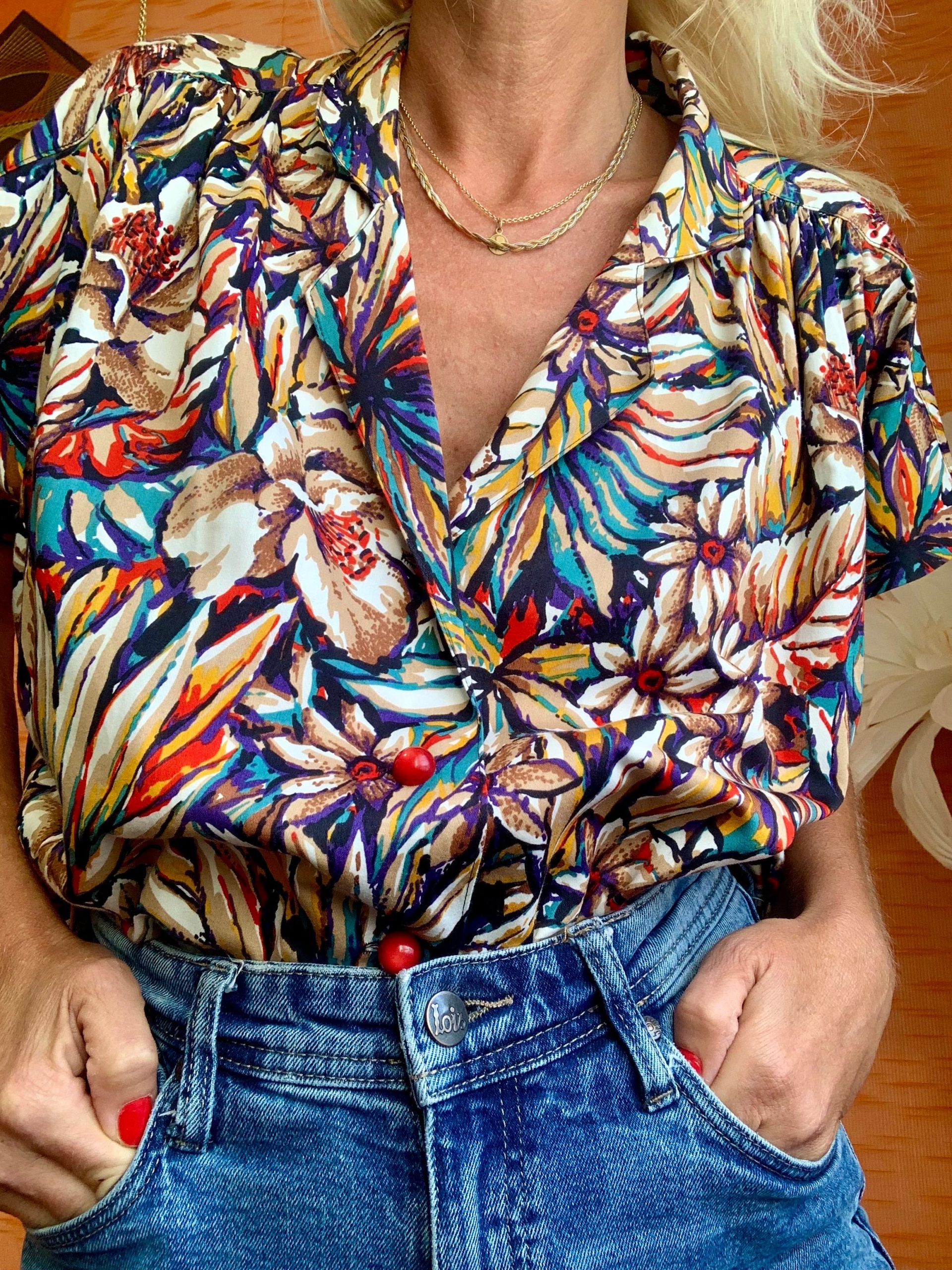 Ravissant Chemisier Création Vintage à fleurs avec petits boutons boules rouges – Entièrement confectionné main et en excellent état – Larges épaules plissées a effet volume carré – Coton.