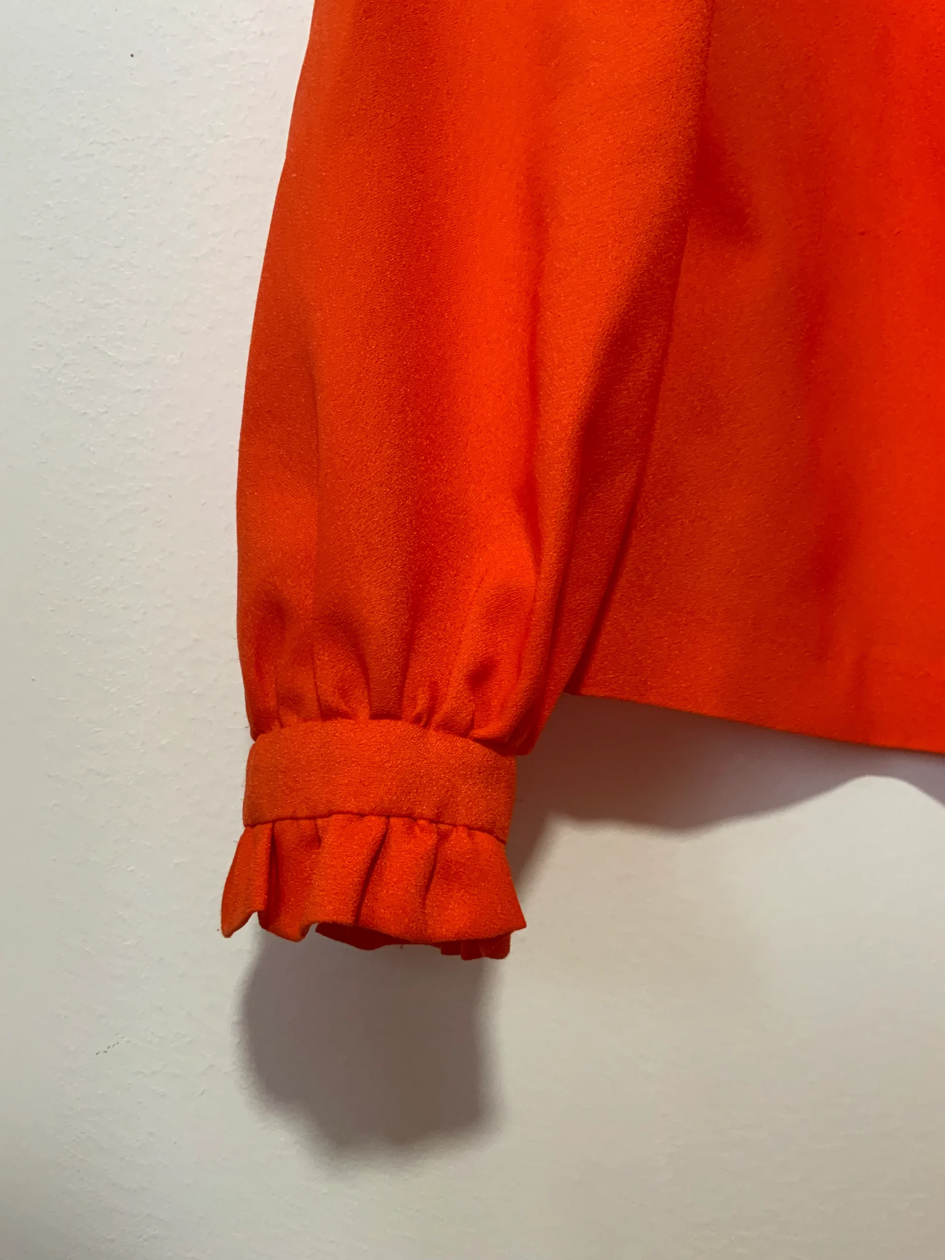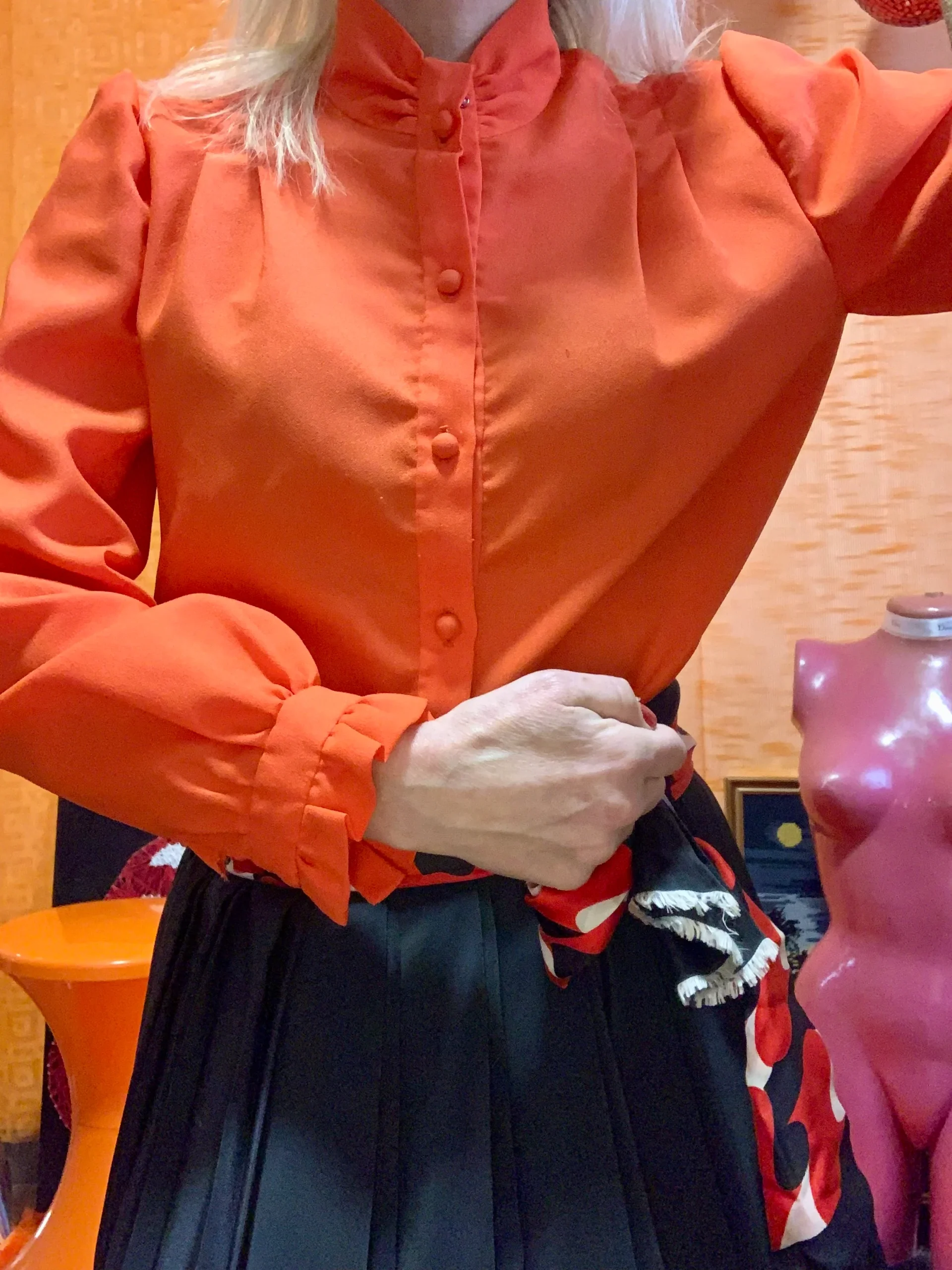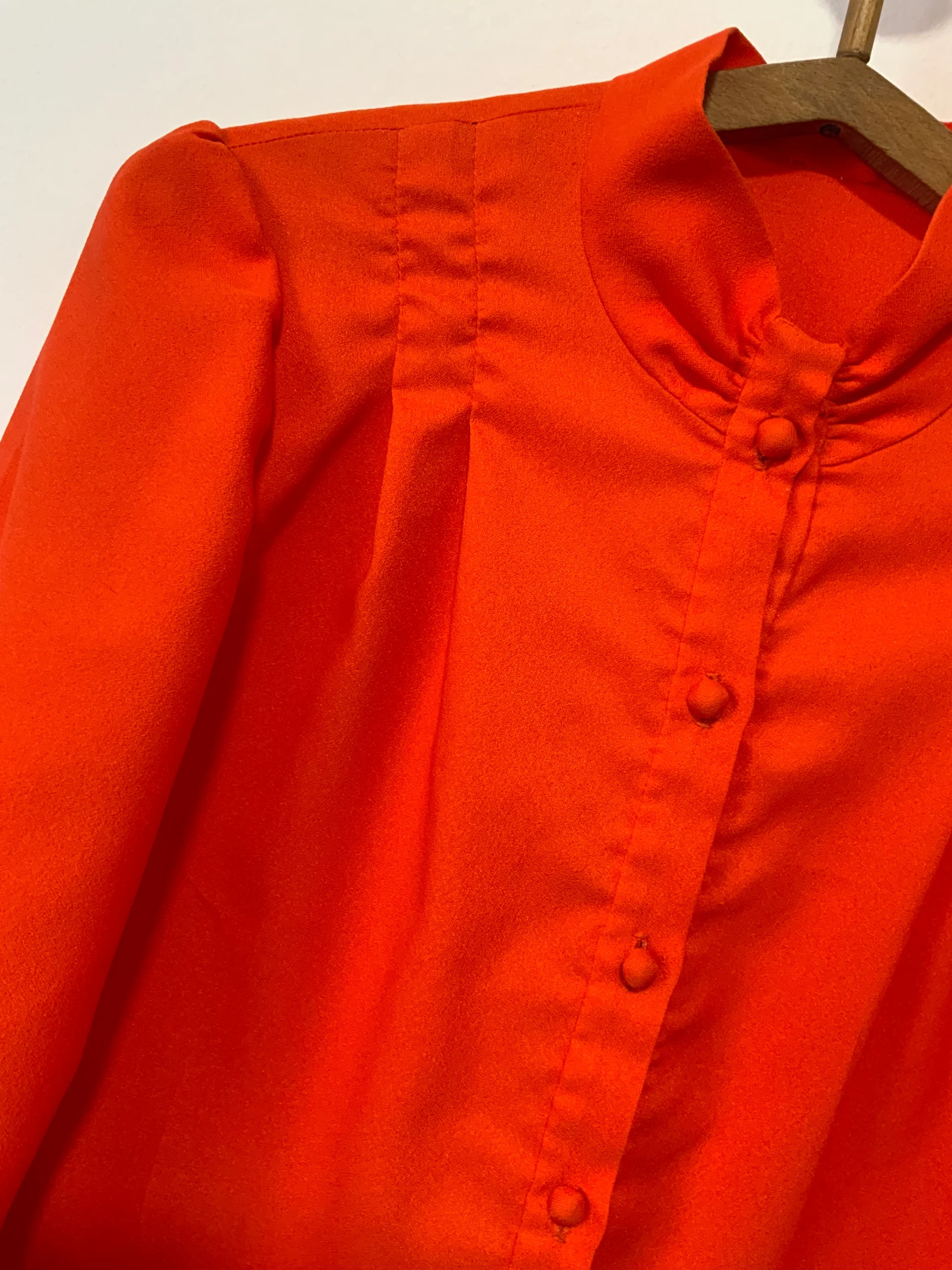 Charmant chemisier orange entièrement confectionné à la main Vintage 1970/80- Frous Frous au bas de manches, petits boutons ronds recouverts du même tissus, col montant Frous Frous, Épaules plissées petit effet volume.
