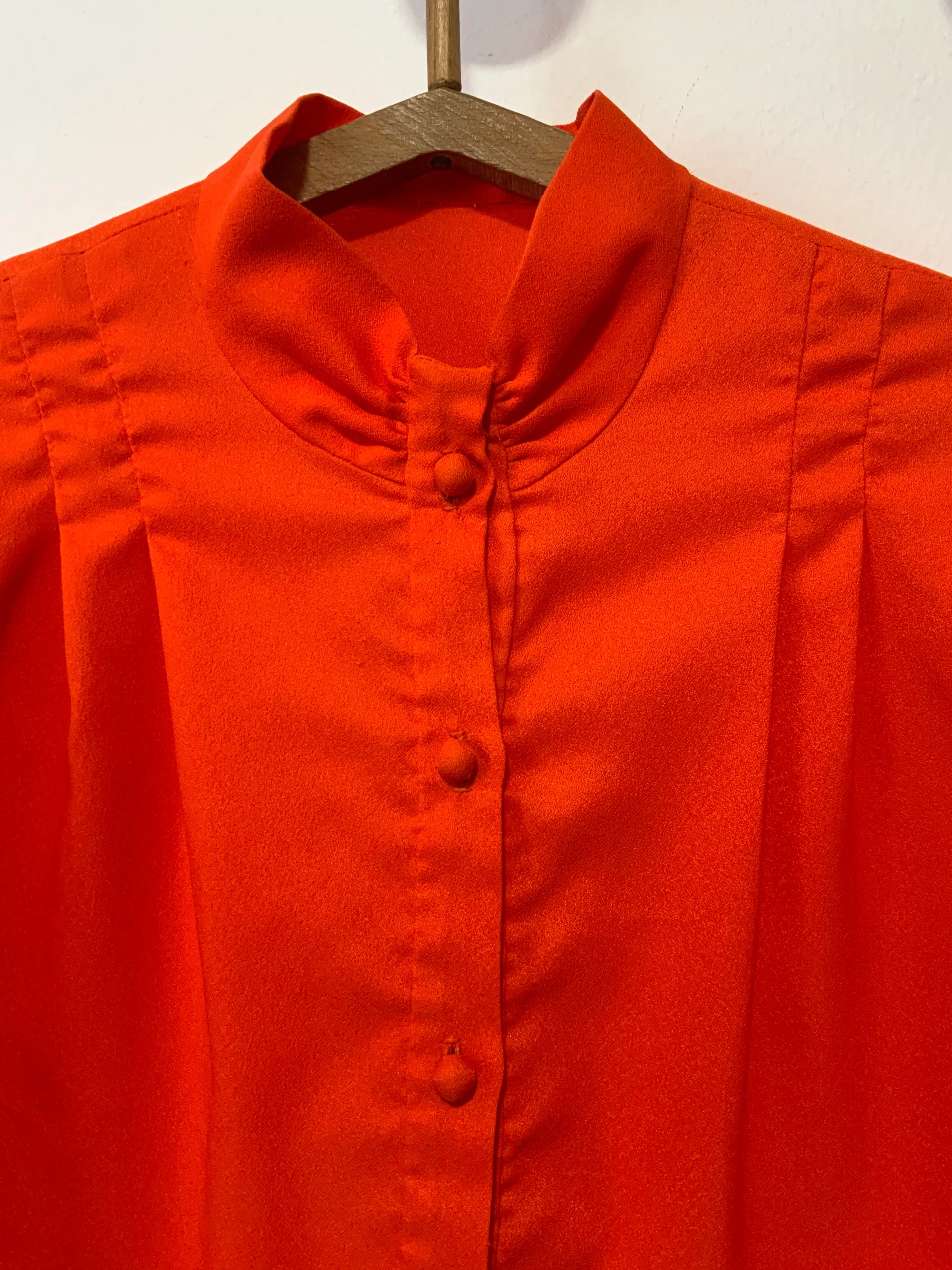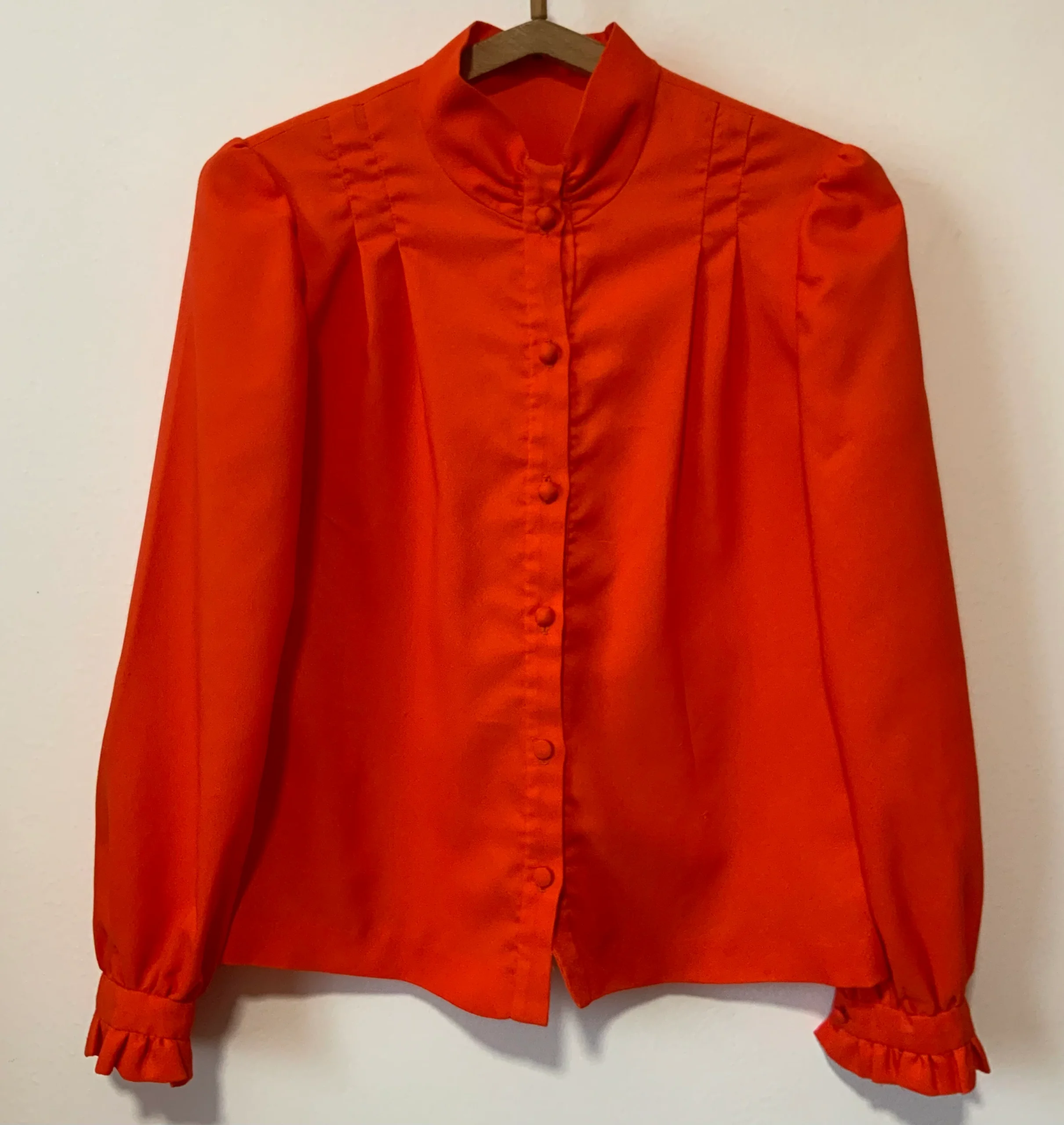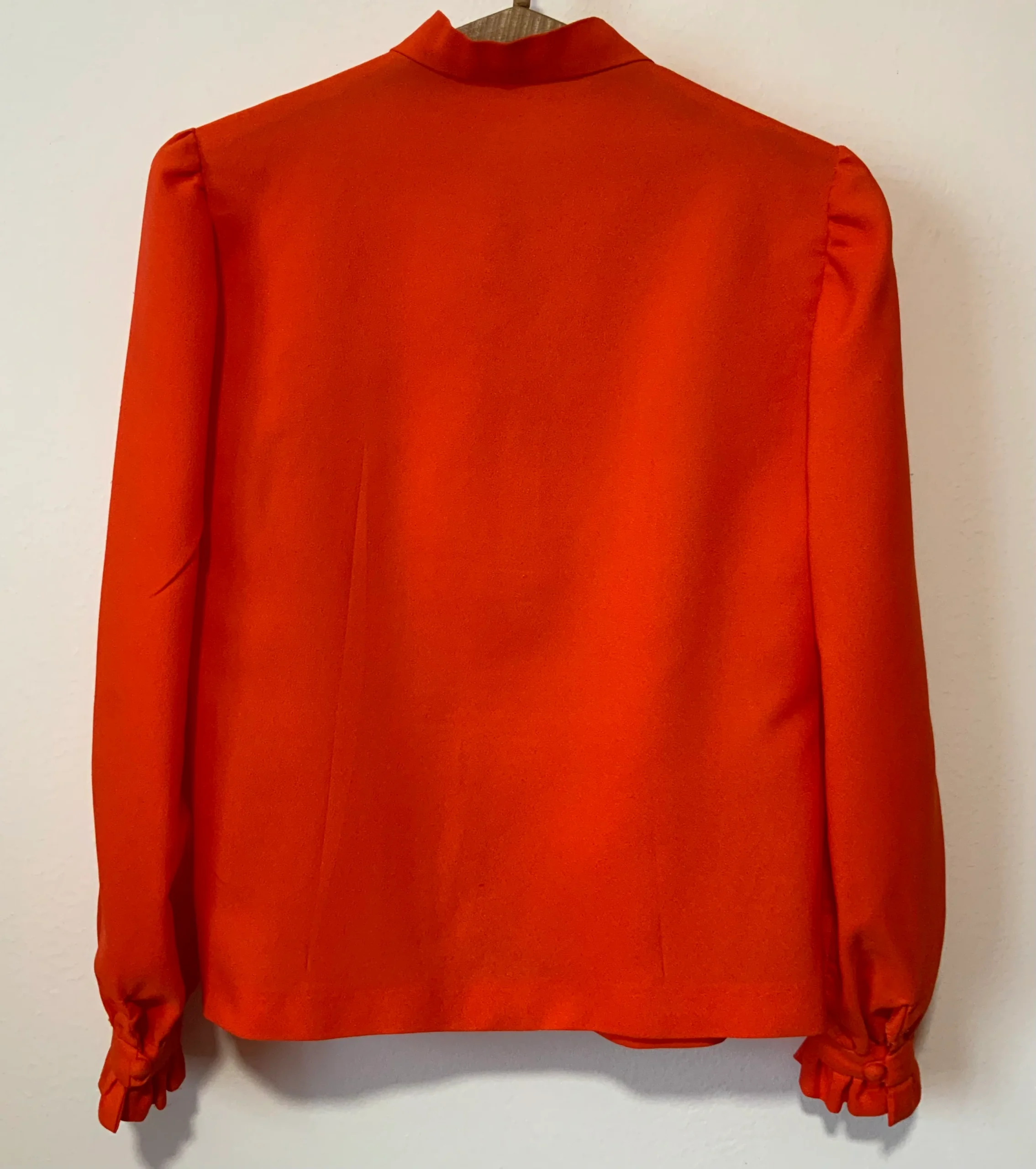 Charmant chemisier orange entièrement confectionné à la main Vintage 1970/80- Frous Frous au bas de manches, petits boutons ronds recouverts du même tissus, col montant Frous Frous, Épaules plissées petit effet volume.