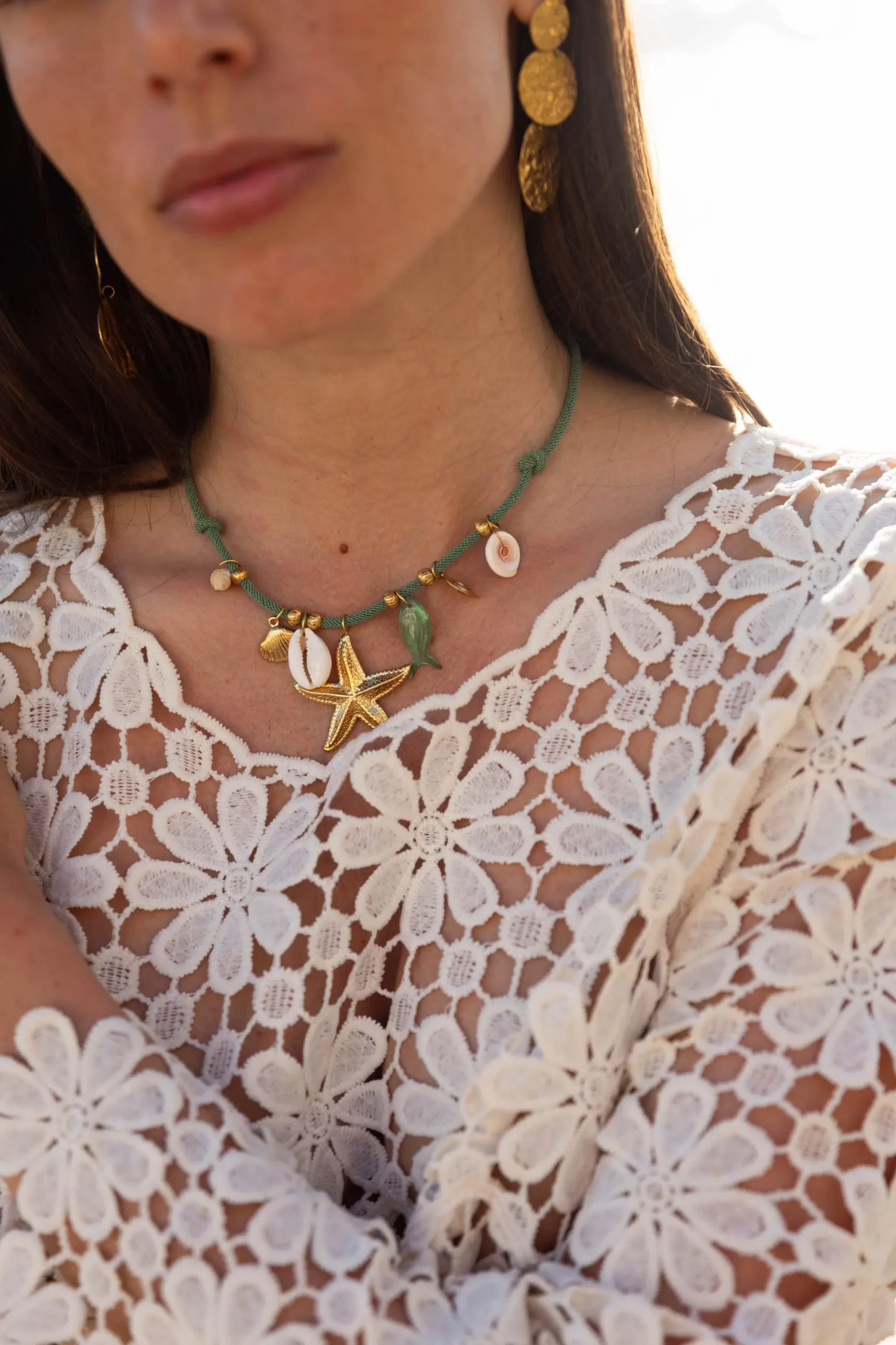 – Collier ajustable – Cordon en tissu – Charms coquillages, poisson, étoile de mer – fermoir mousqueton – Acier inoxydable – Couleur: doré, blanc, vert