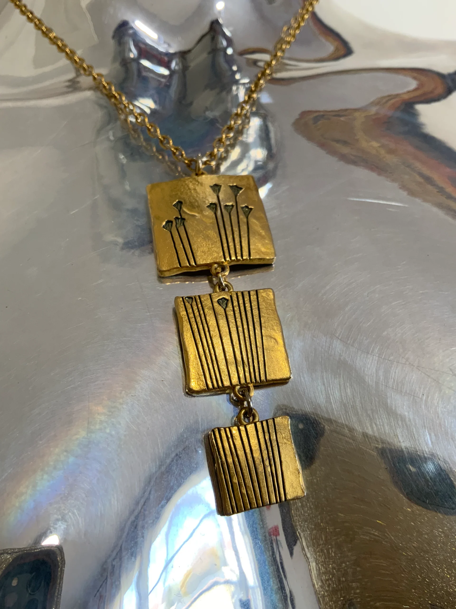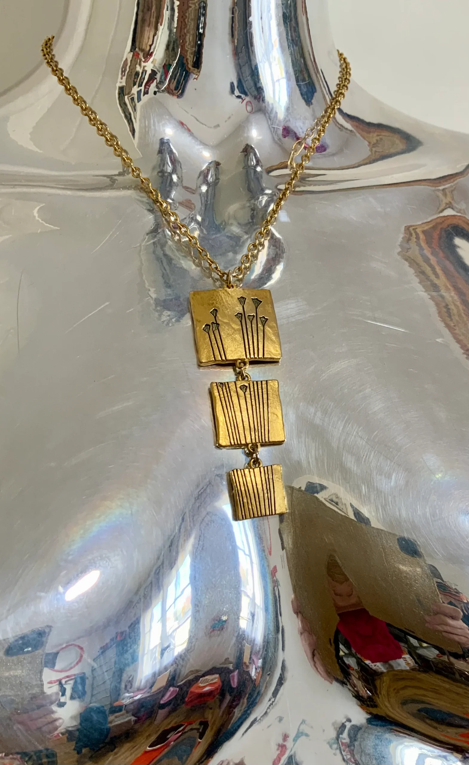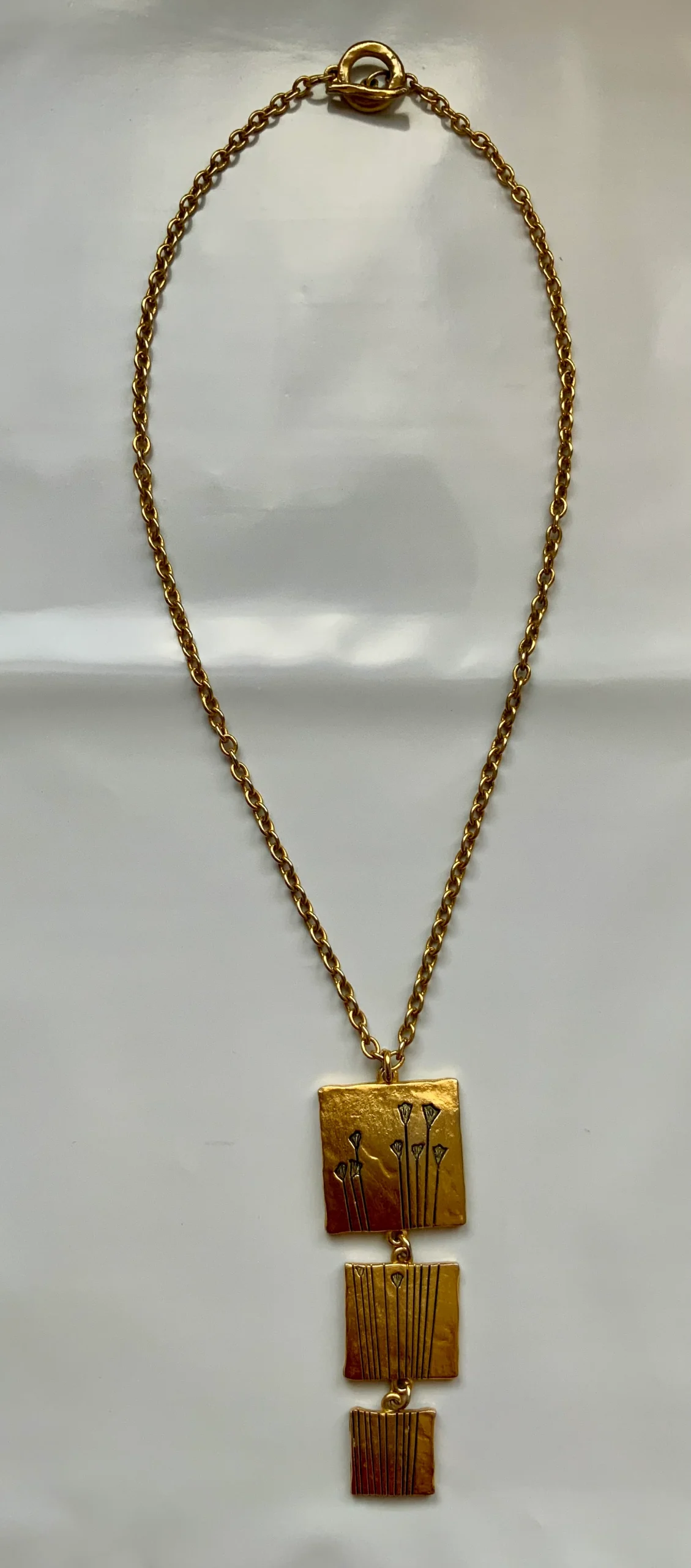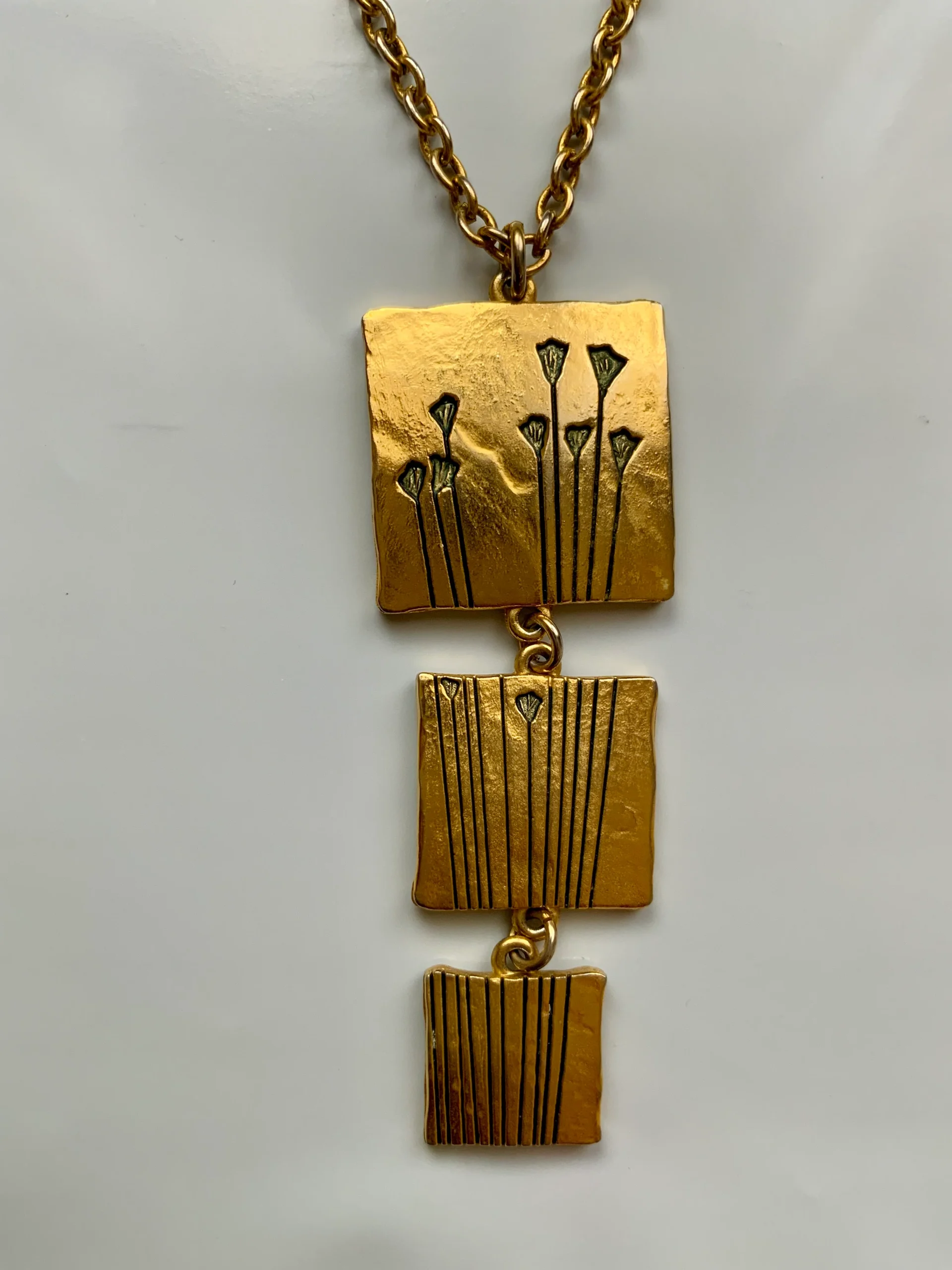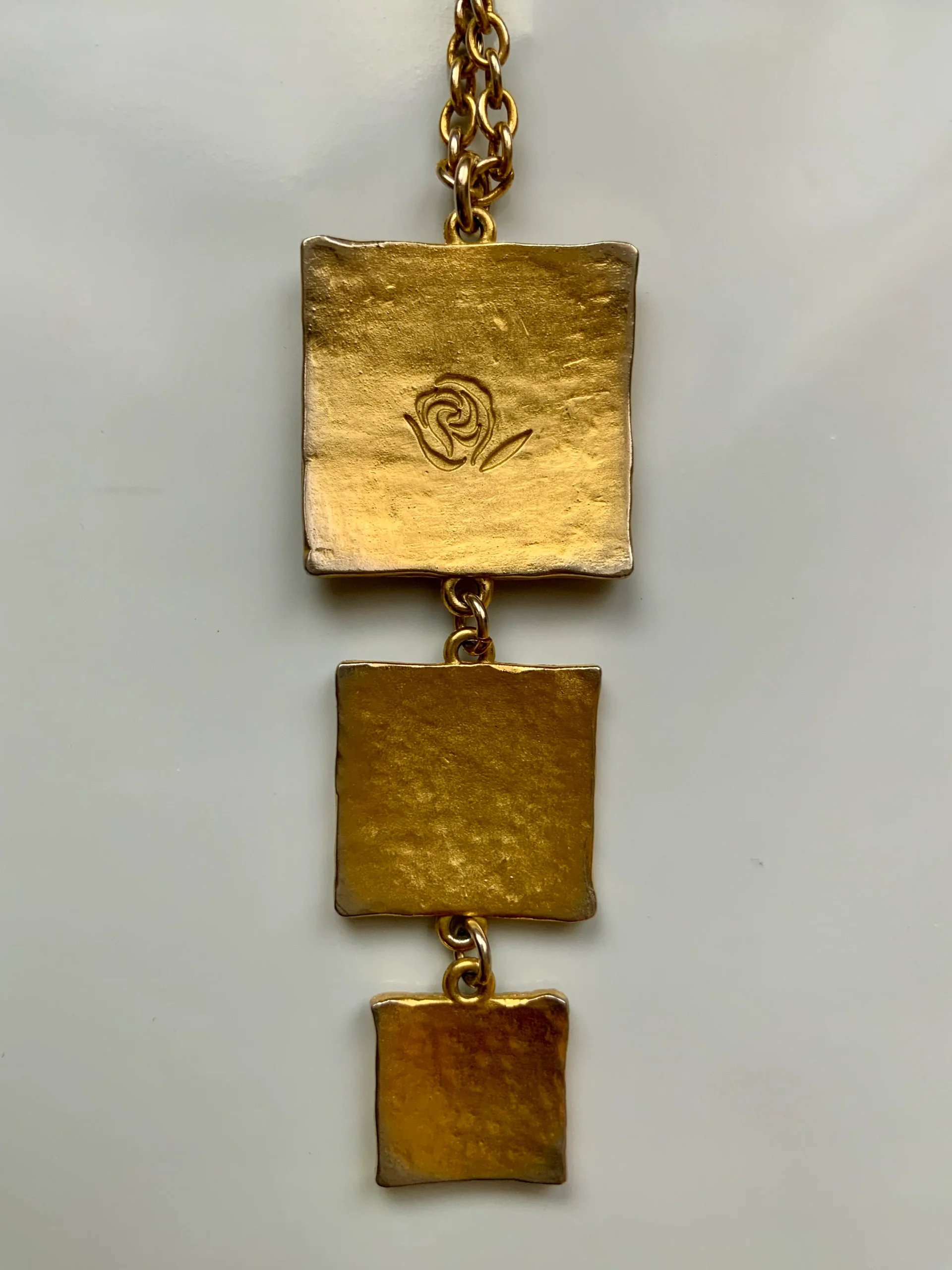 Collier LANCÔME métal doré estampillé dos 3 carrés articulés représentant des fleurs à grandes tiges – Légère usure couleur dos.