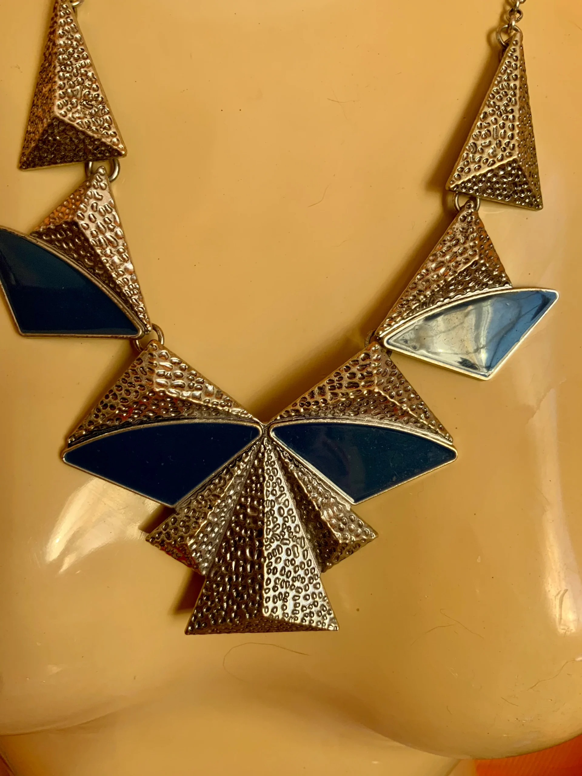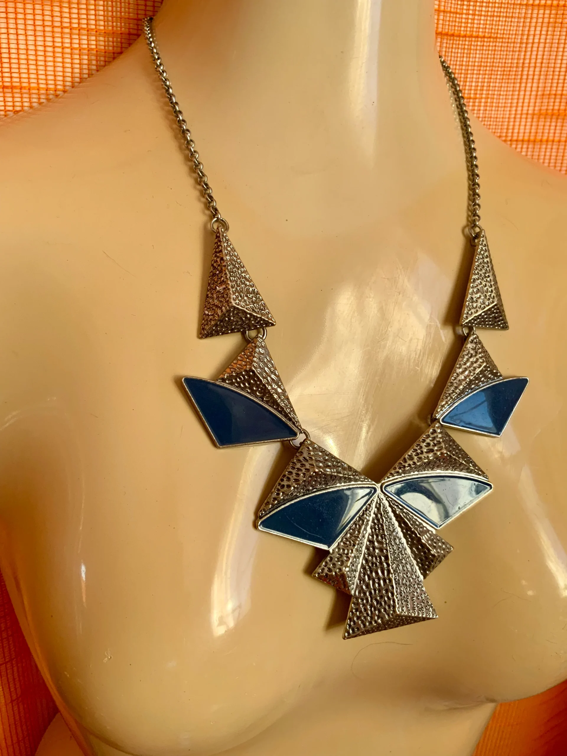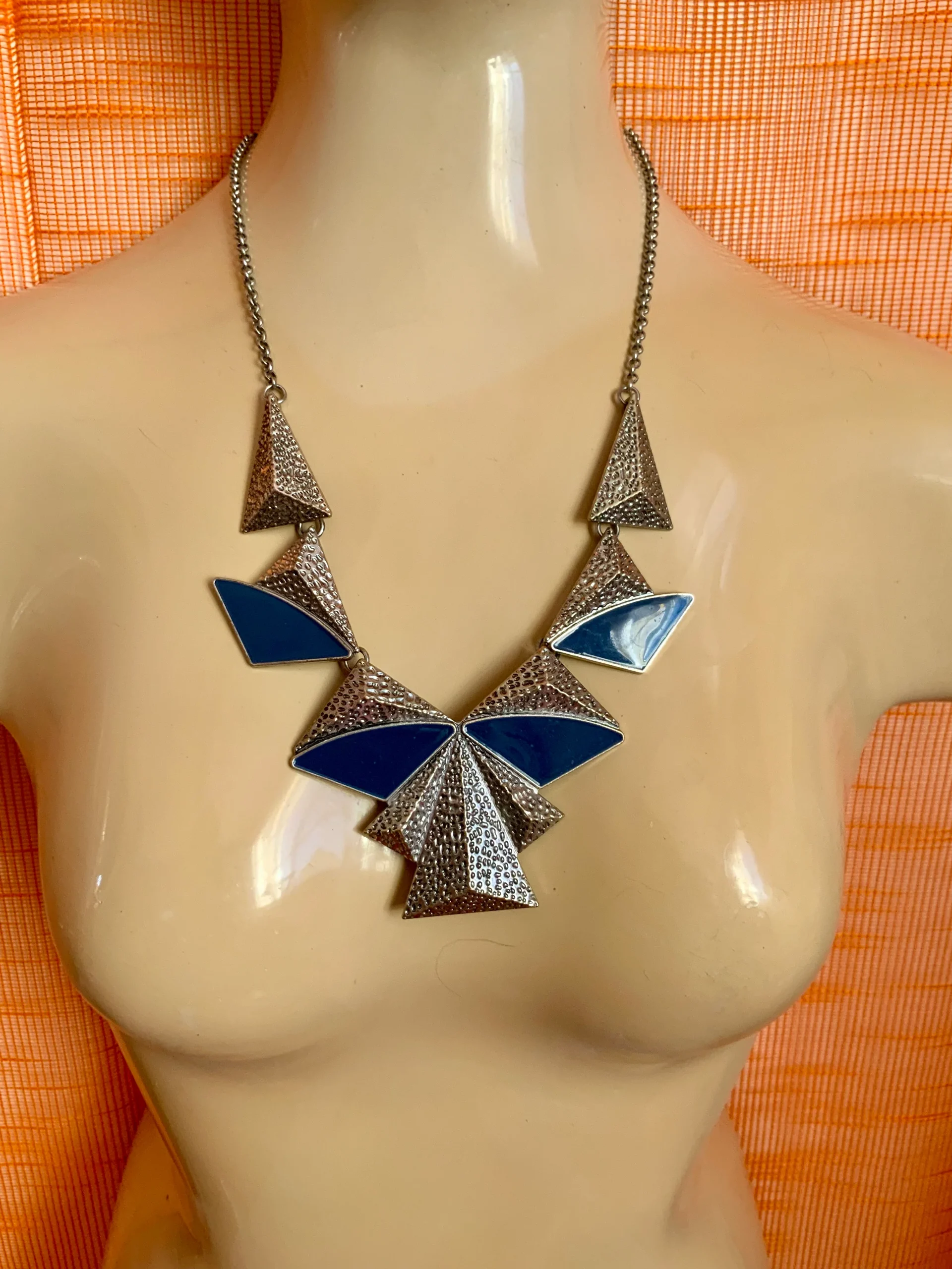 Collier en métal argenté et bleu Vintage 2000 Façon Eighties de Camaïeu.