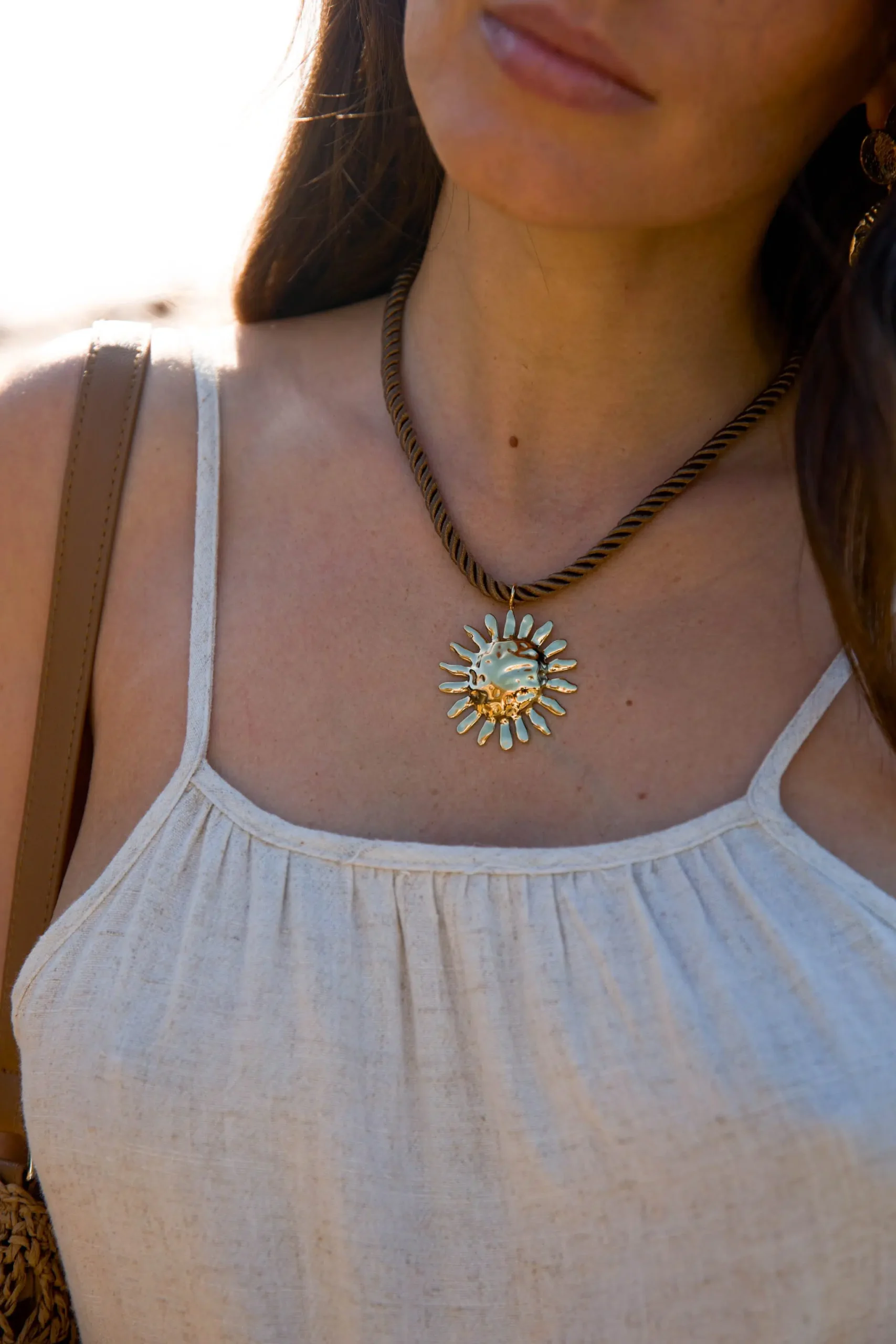 – Collier en acier inoxydable – Pendentif soleil doré – Cordon torsadé effet satiné – Taille réglable – Couleur : doré et marron