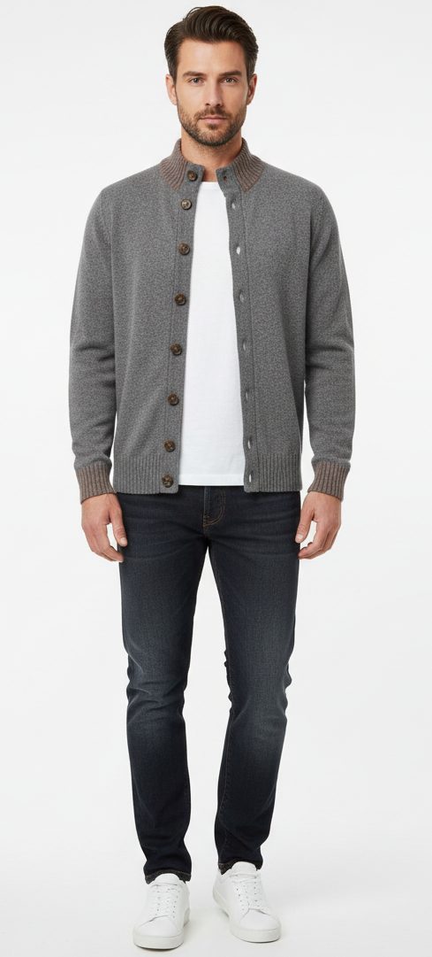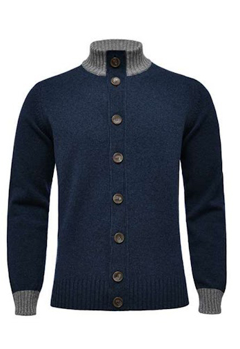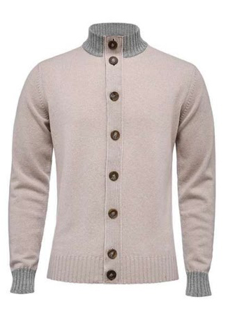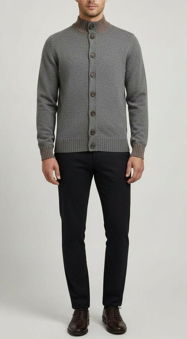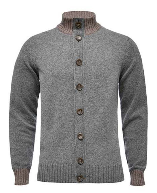 Ce cardigan moderne en mérinos et cachemire est doté de boutons en corne et d’un col montant pour une élégance et un confort ultimes.
