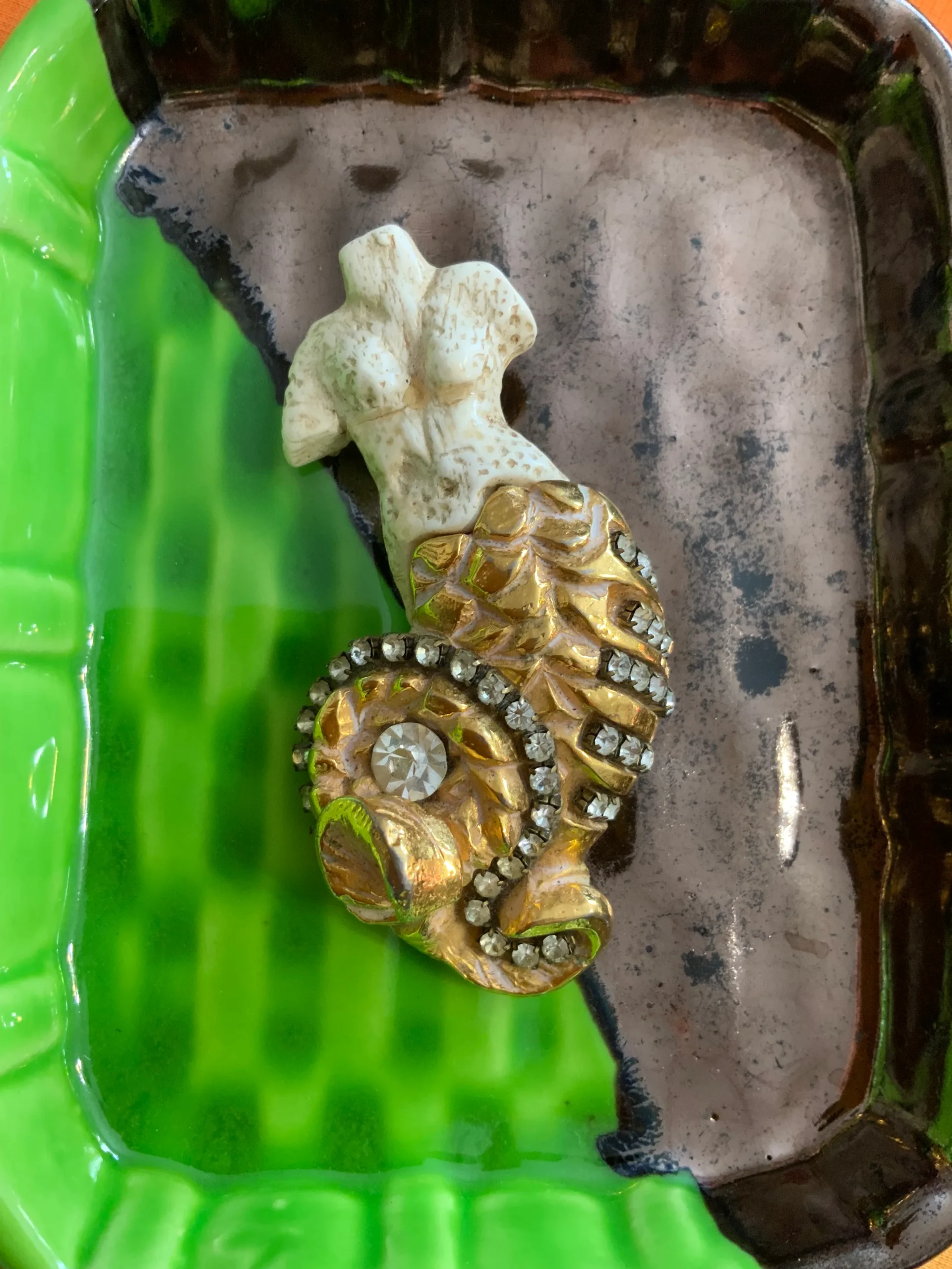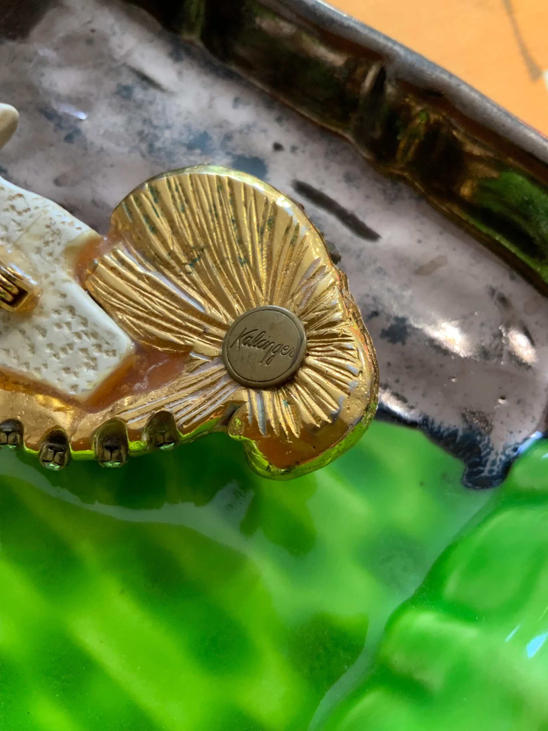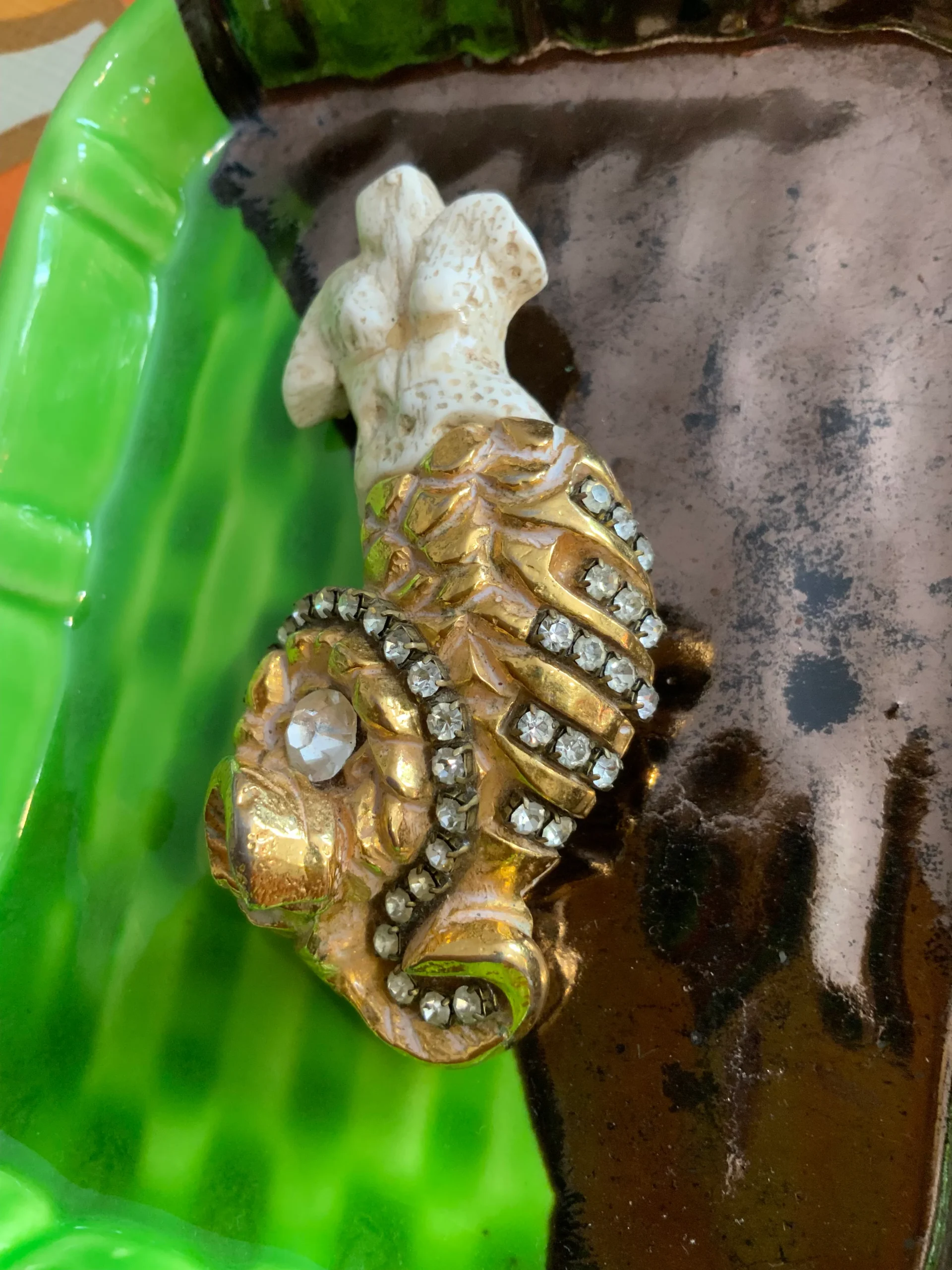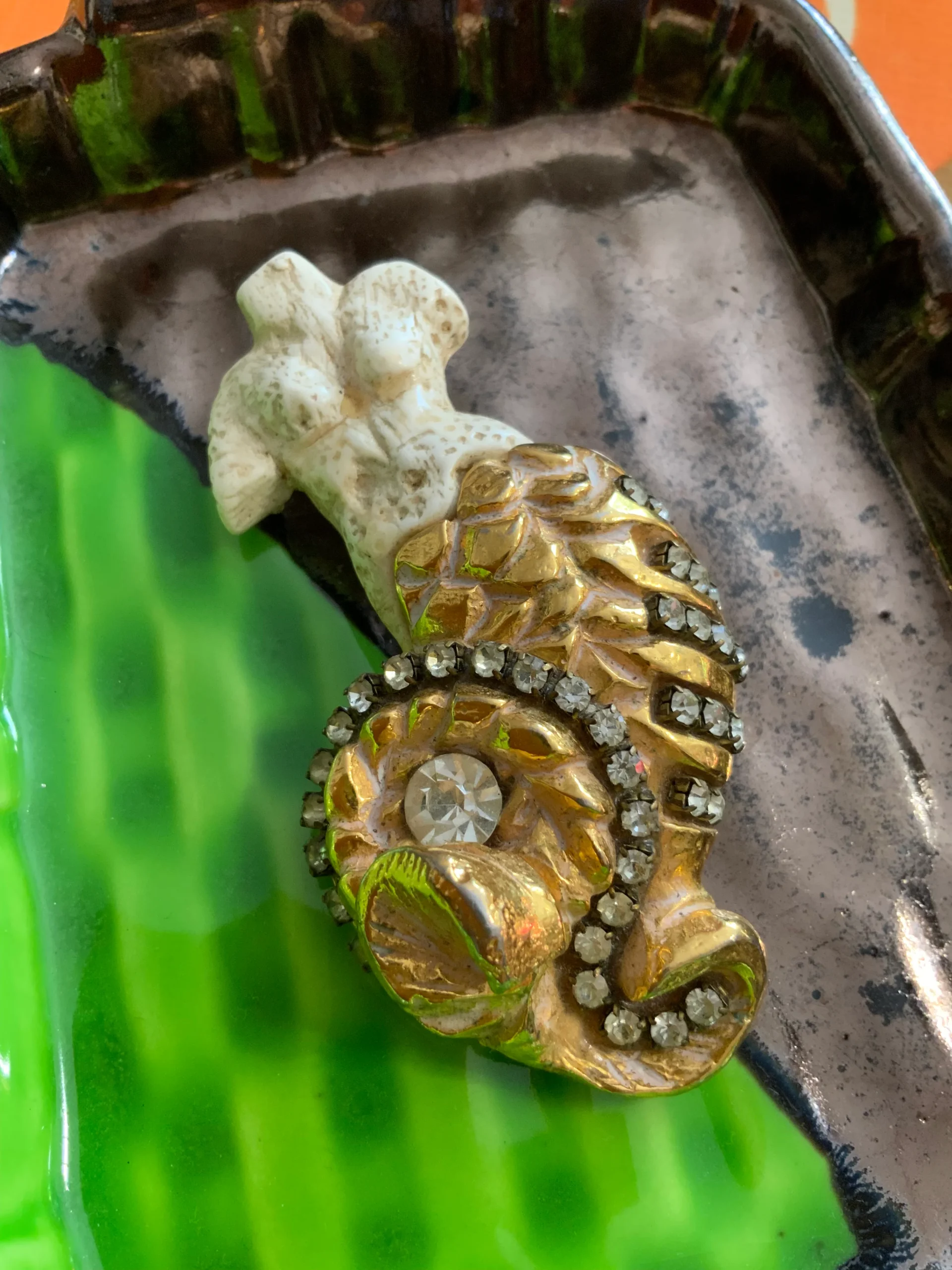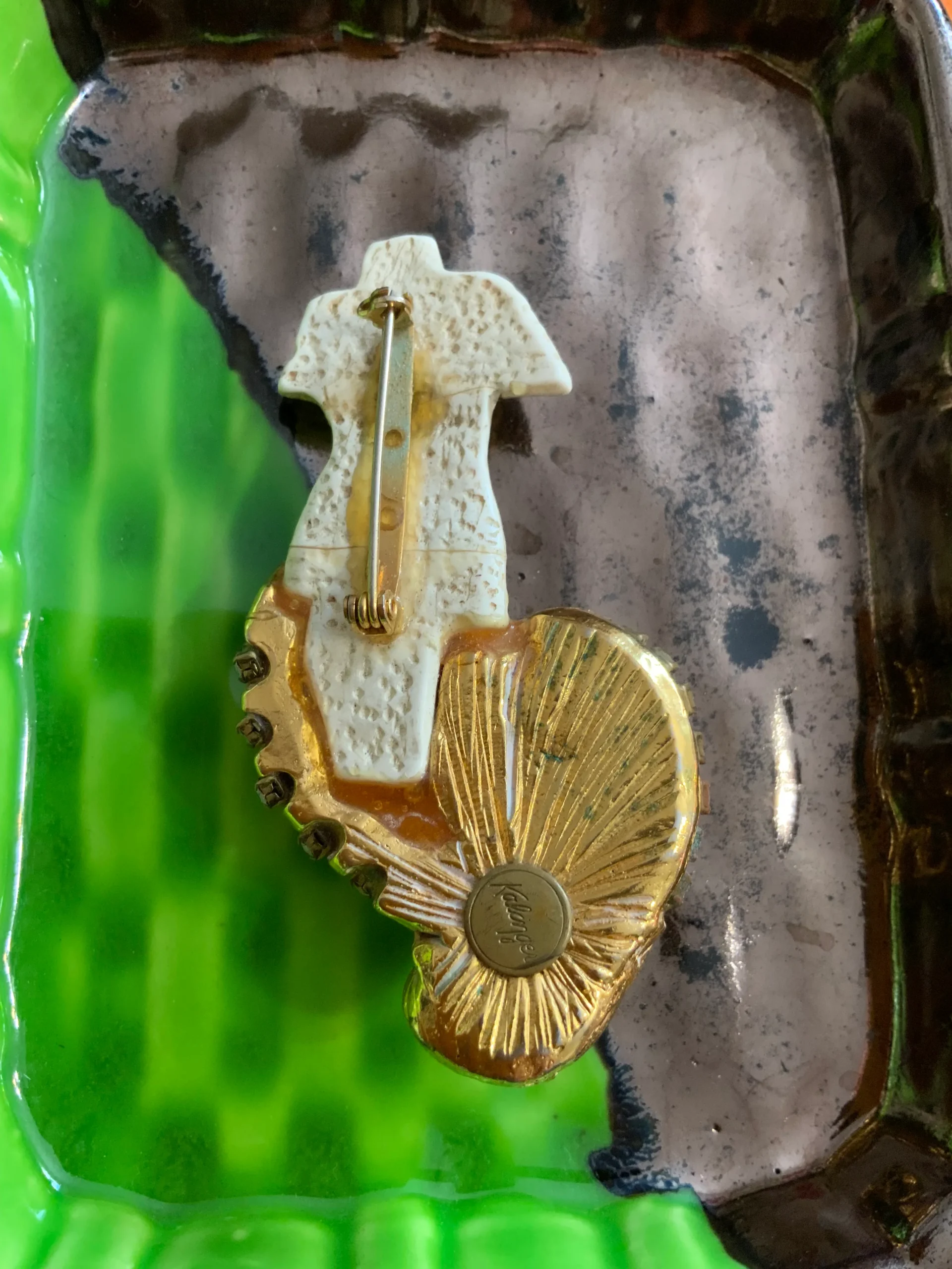 Superbe et grande Broche Années 30 Kalinger Sirène Vintage Pierres Metal doré et pierres strass.