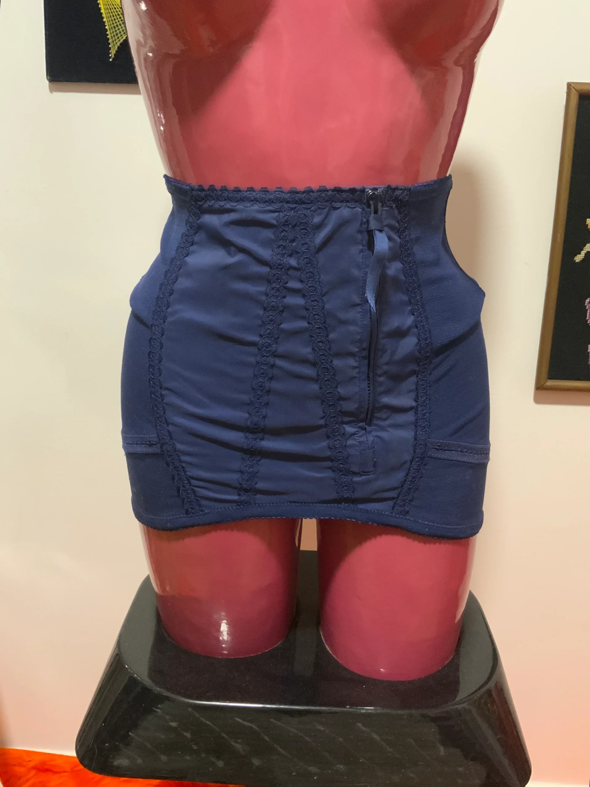 Superbe gaine de la Marque Boléro Fabriqué en France couleur bleu marine avec satin et liserés dentelle- Grande fermeture éclair avec agrafes – Breveté SGDG ! Sexy vintage.