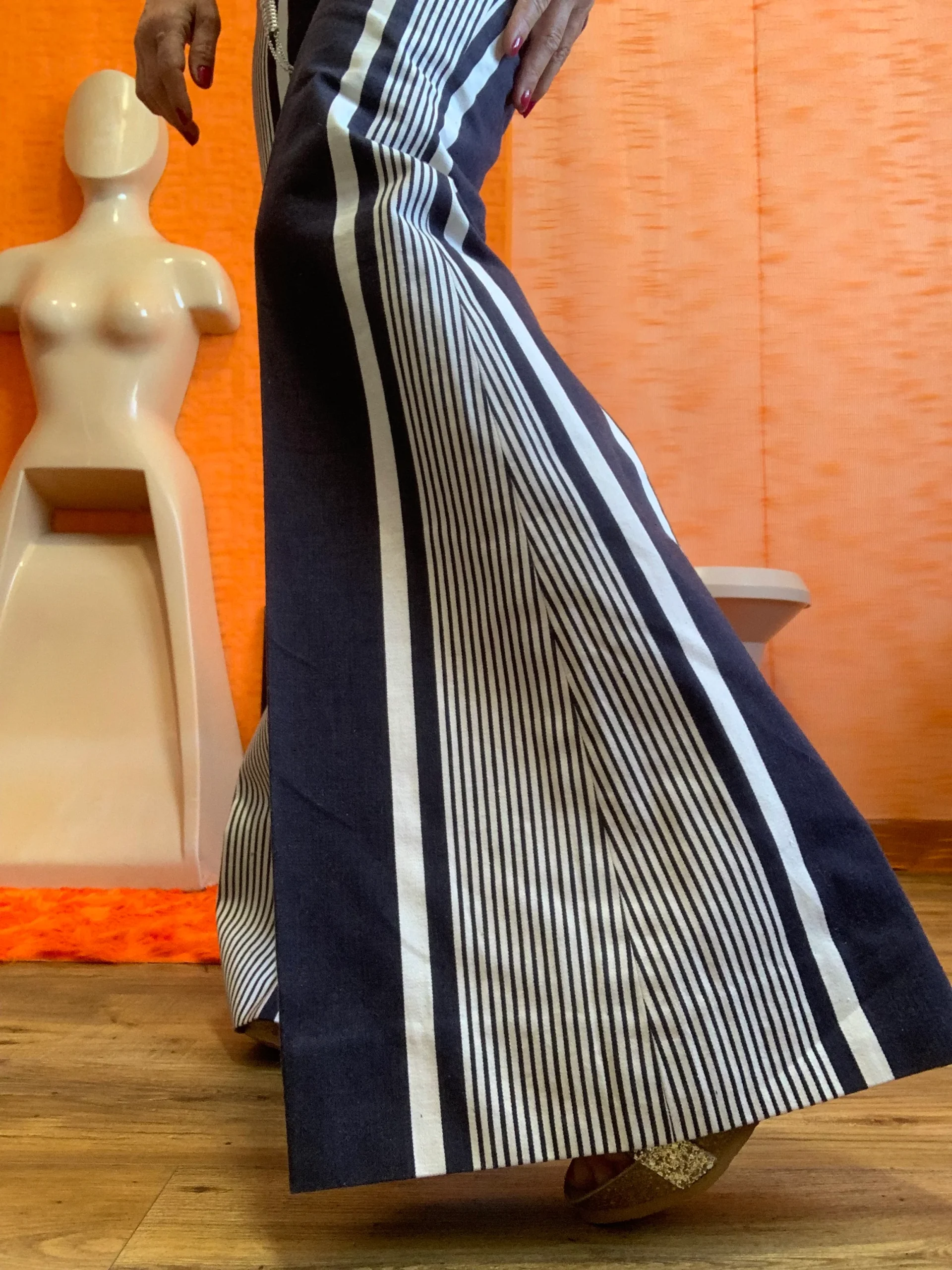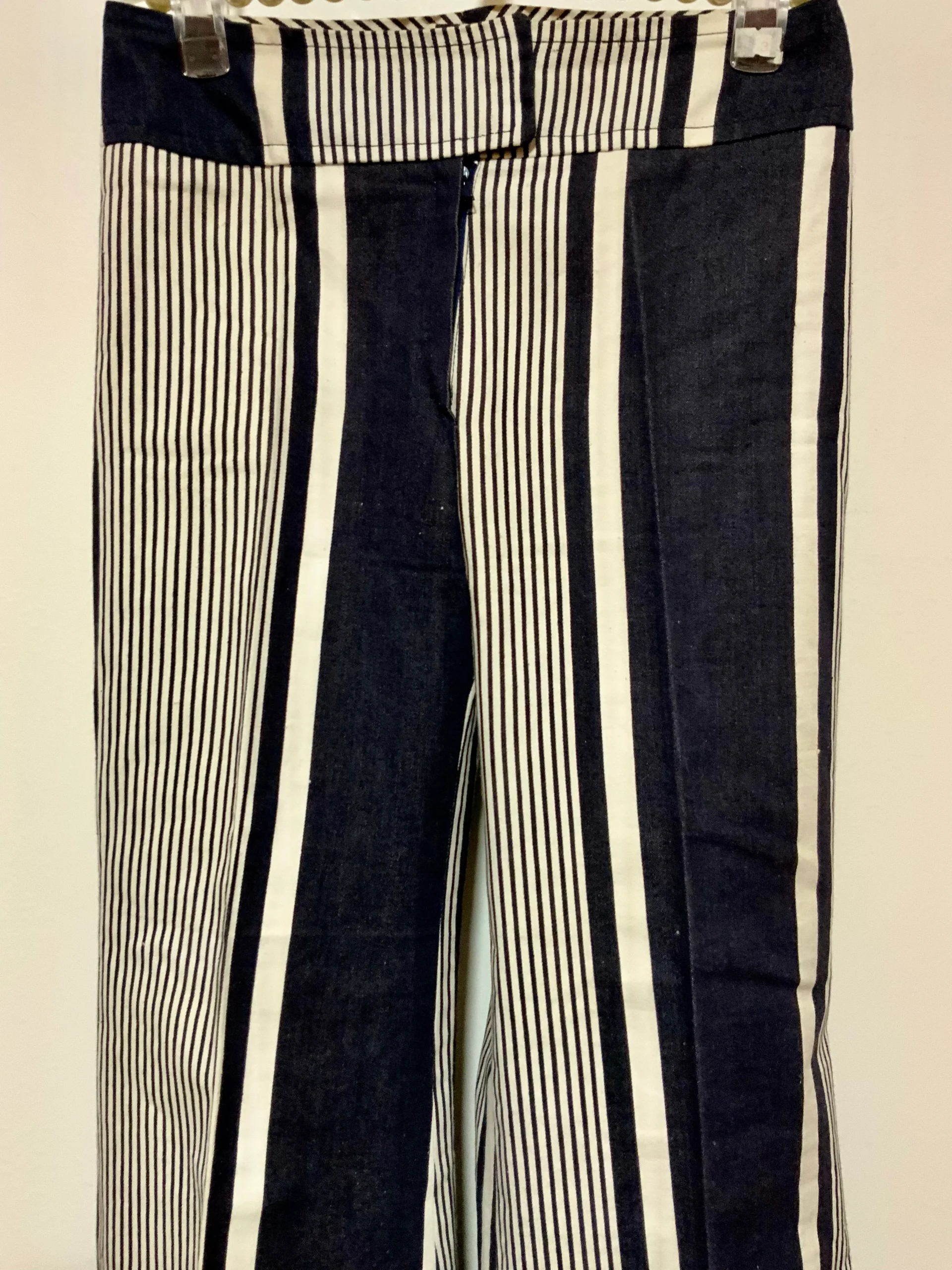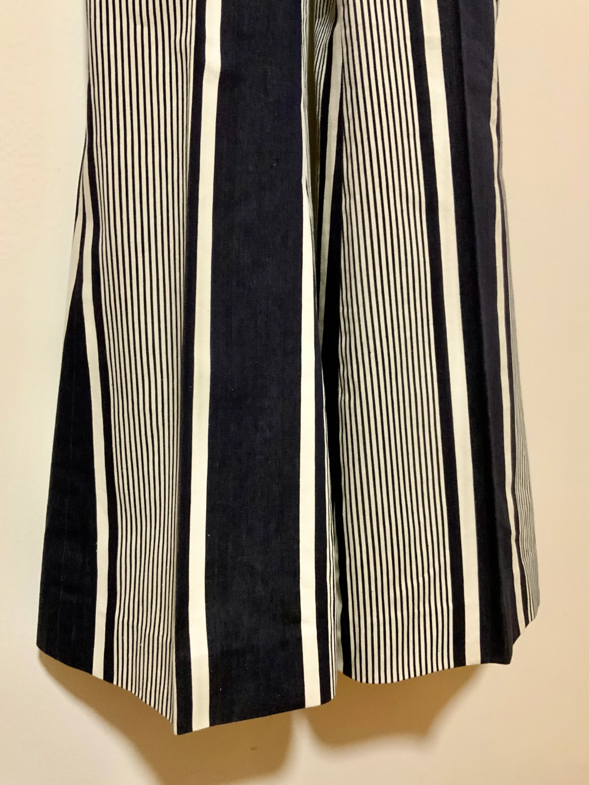 Pantalon Pattes d’éléphant 1970 Vintage Modèle unique confection à la machine à coudre – Fait main ! Denim blanc et bleu marine à rayures coton- De la Maison Max Librati France Paris.