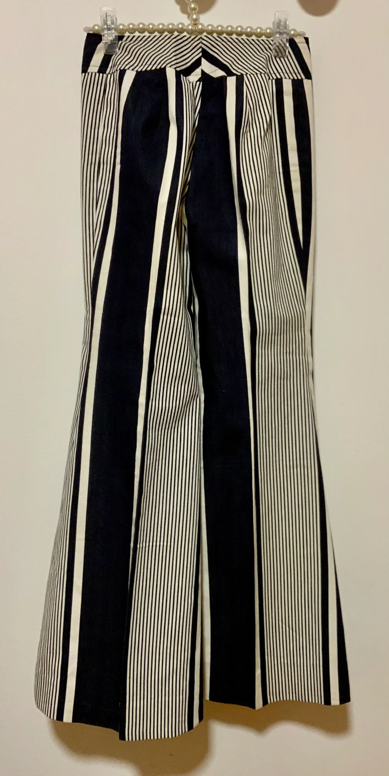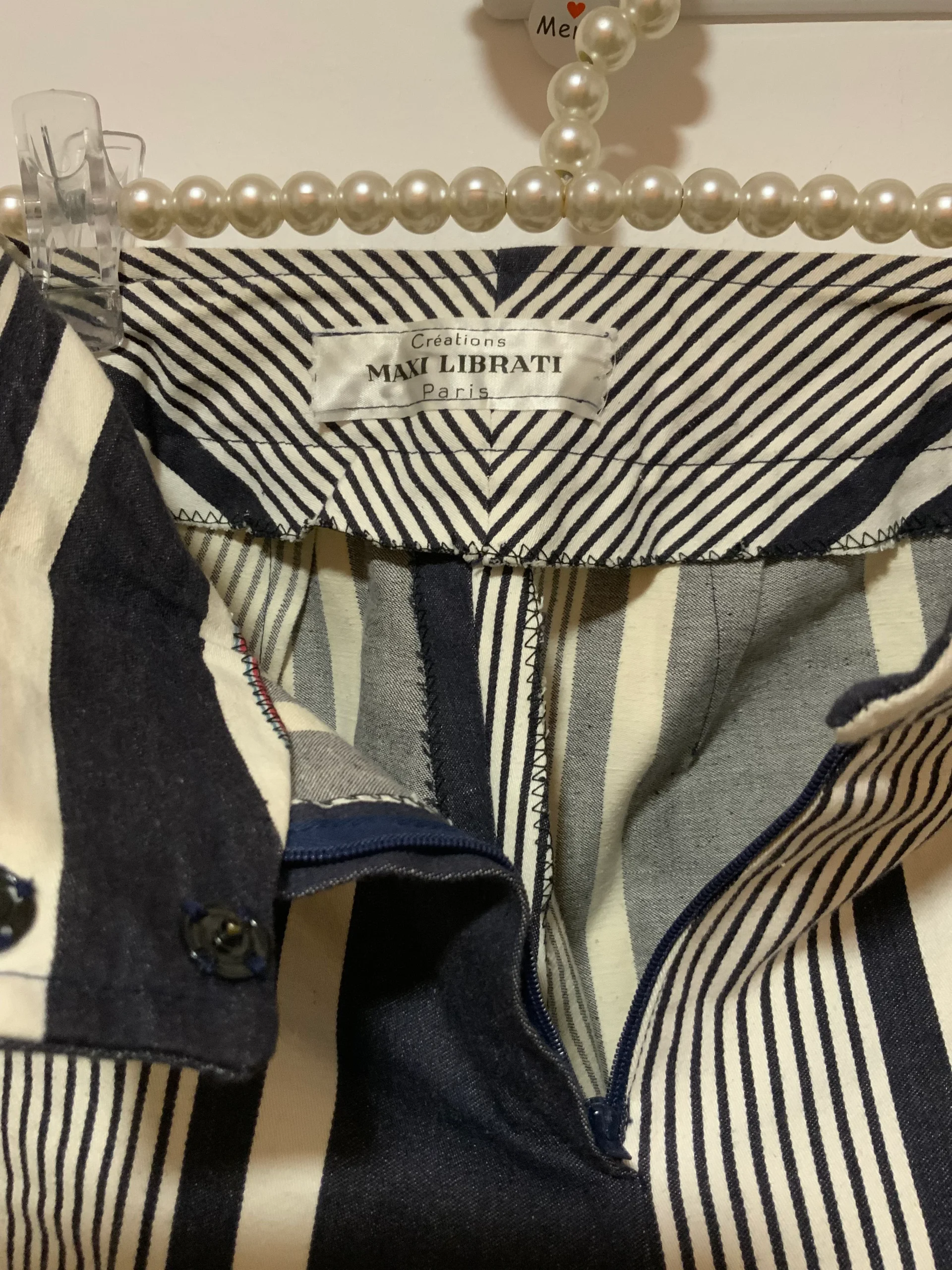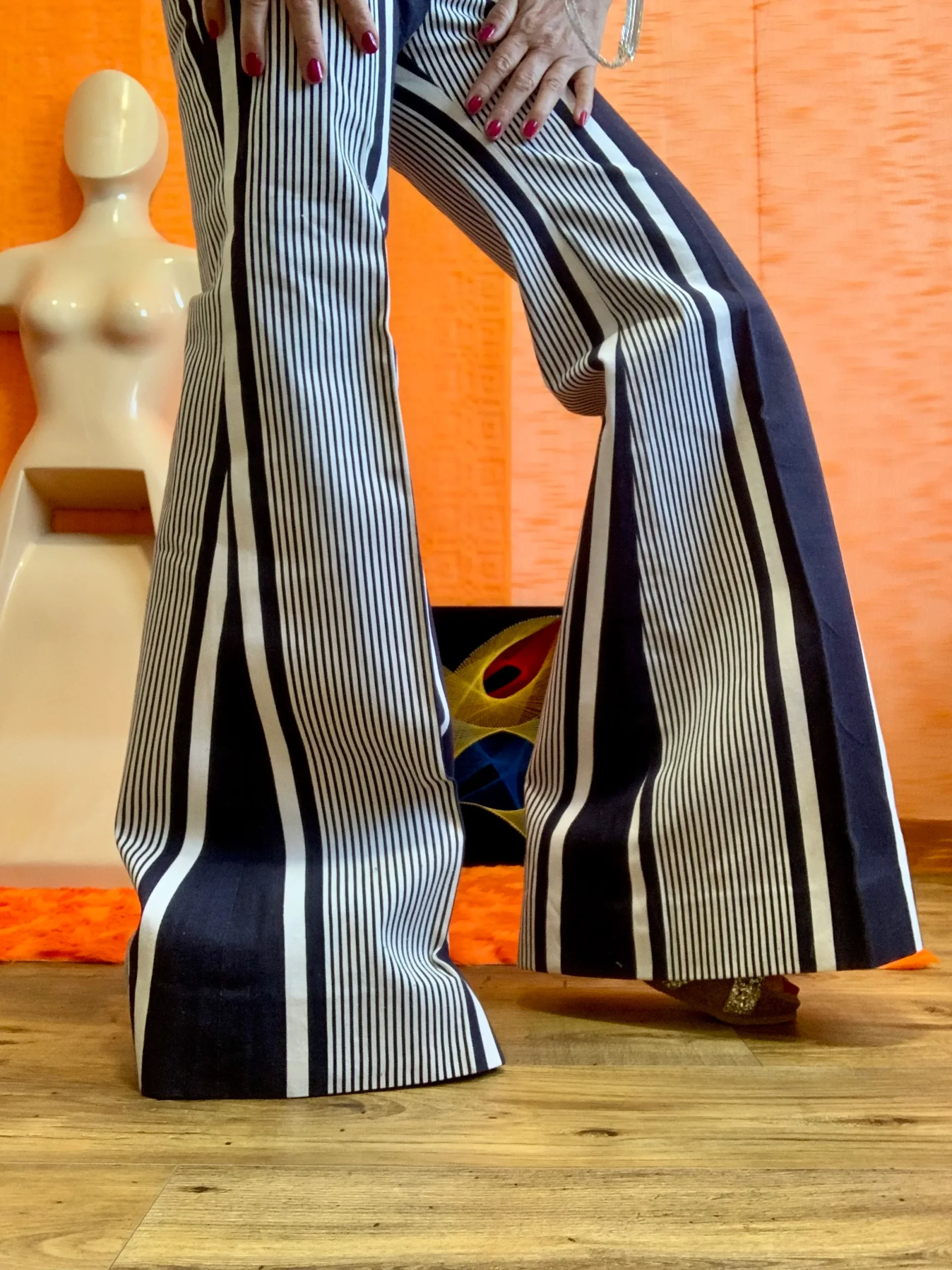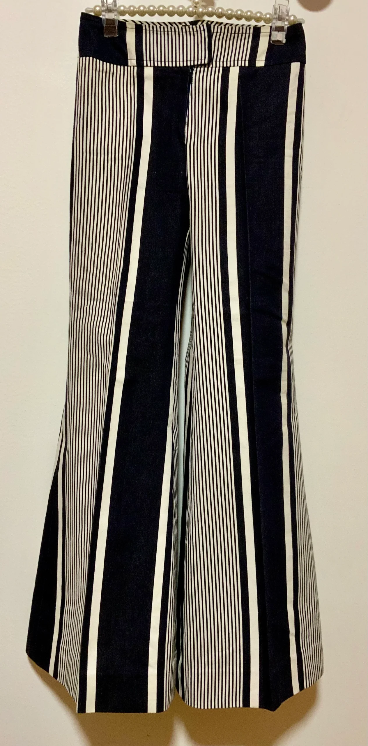Pantalon Pattes d’éléphant 1970 Vintage Modèle unique confection à la machine à coudre – Fait main ! Denim blanc et bleu marine à rayures coton- De la Maison Max Librati France Paris.