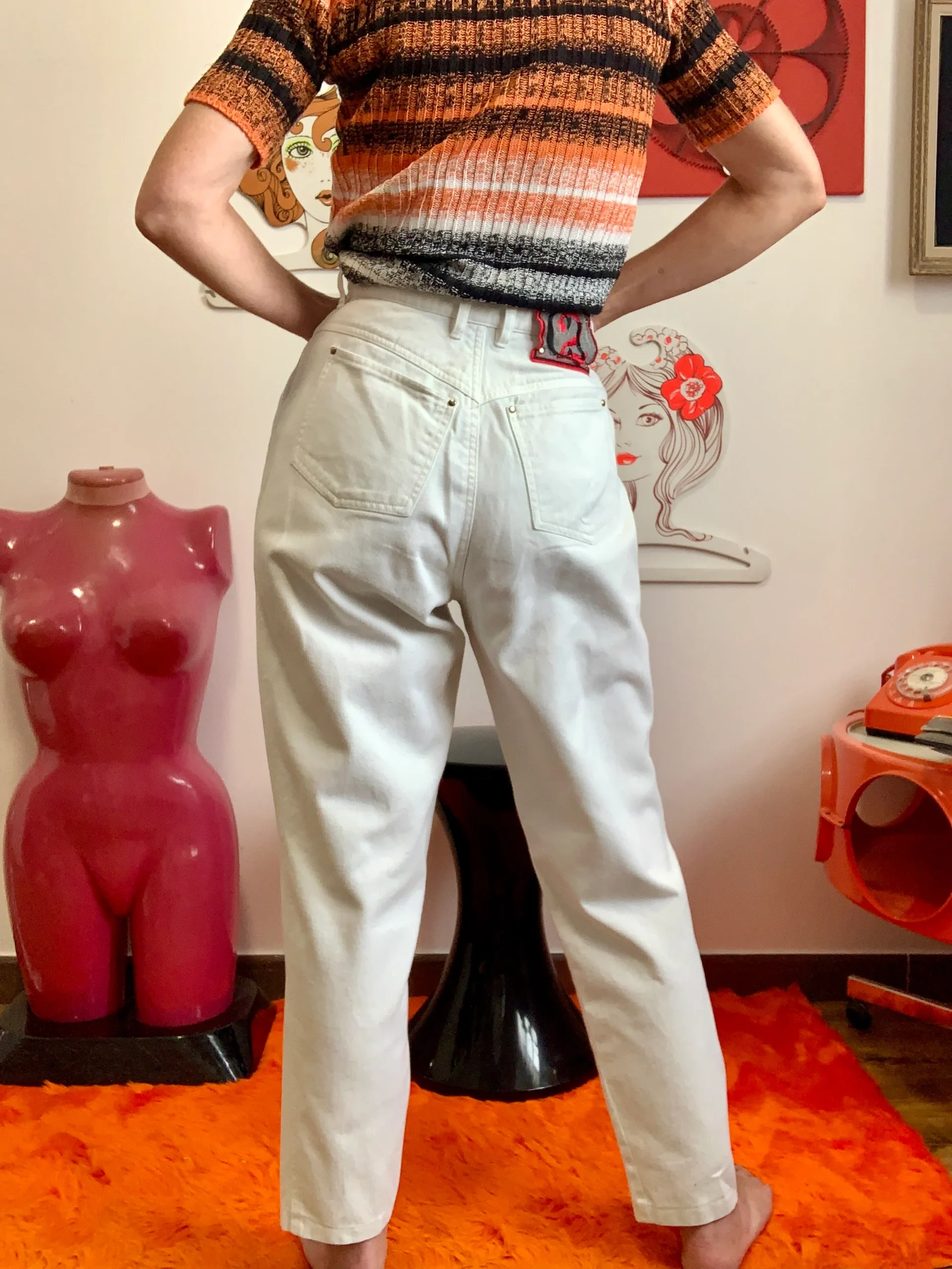 Taille 38/40 Taille haute (malgré une taille 42 d’indiquée se fier aux mesures )- Ses mesures à plat = Taille 37 Hanches 86 Longueur 93 L de l’entrejambe 66 centimètres.