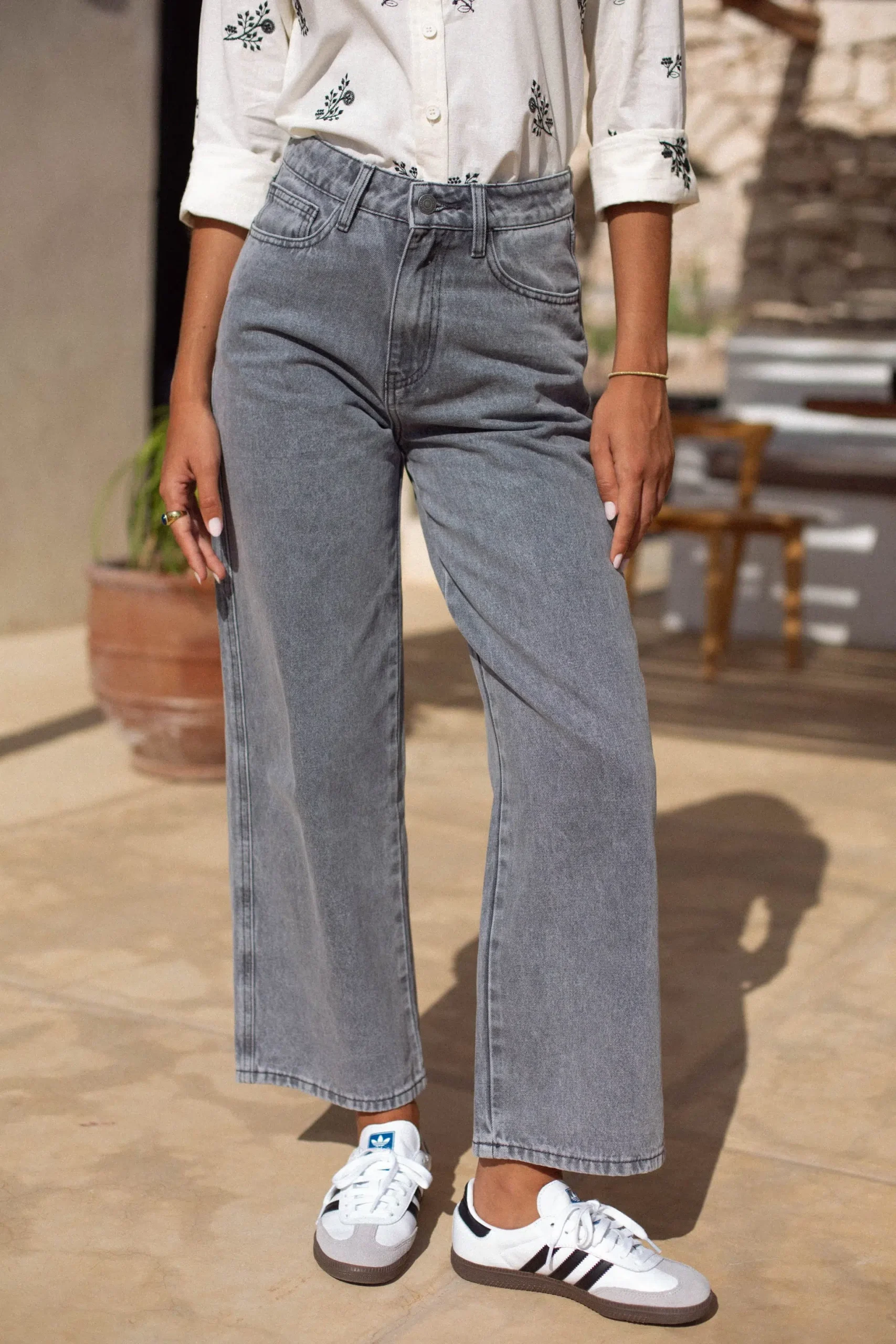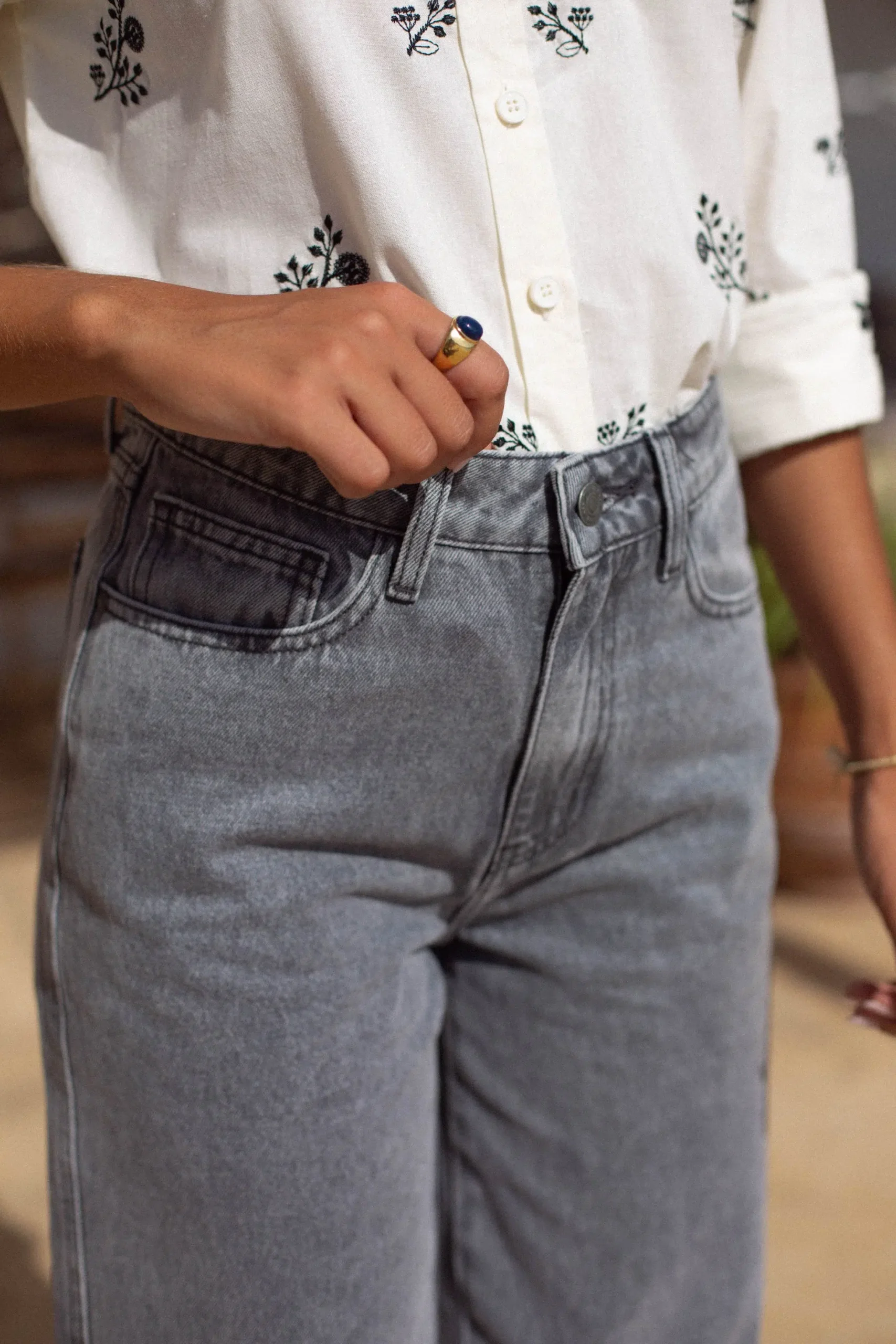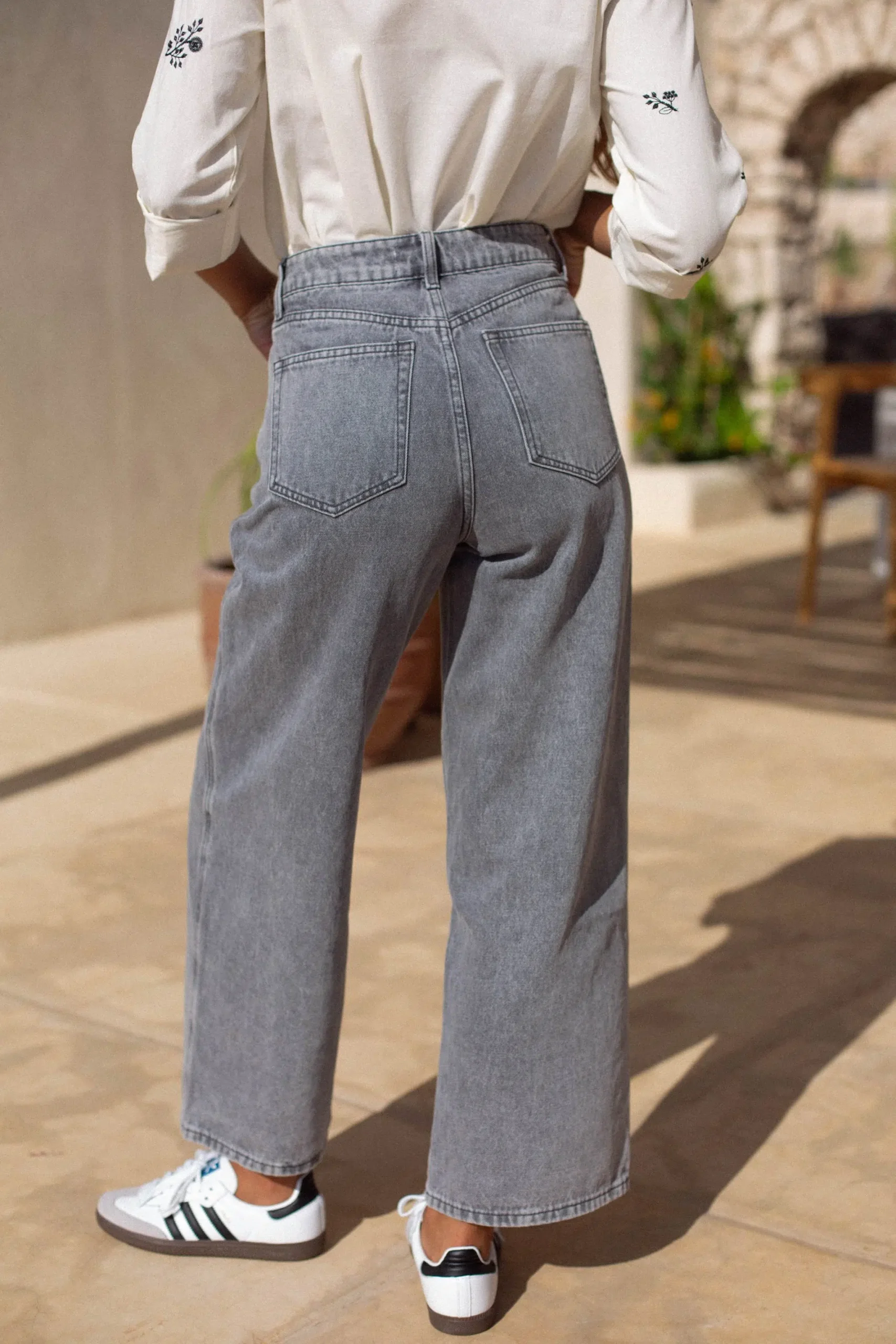 – Jean taille haute – Deux poches avant – Deux poches arrière – Coupe courte évasée – Couleur : gris