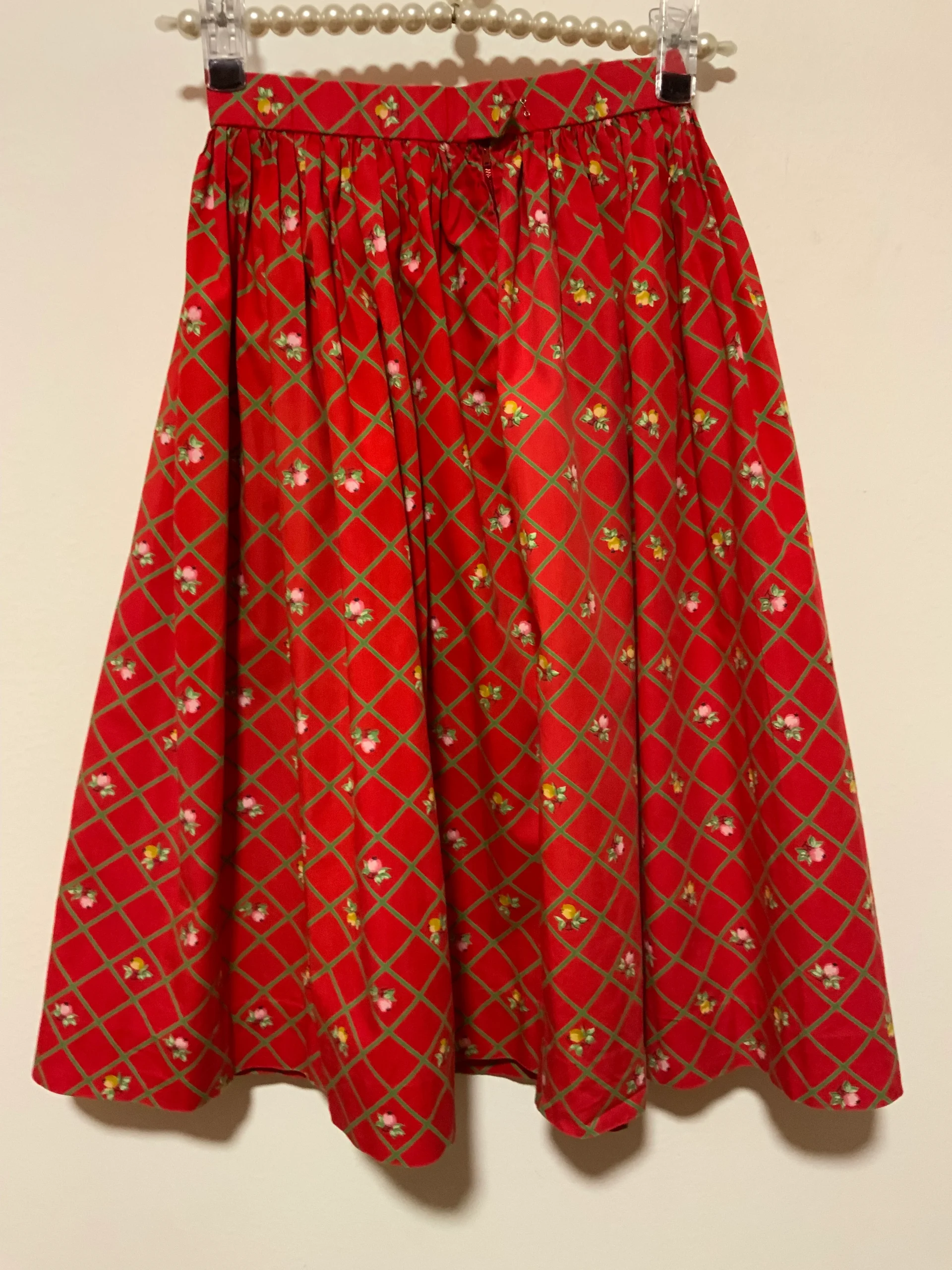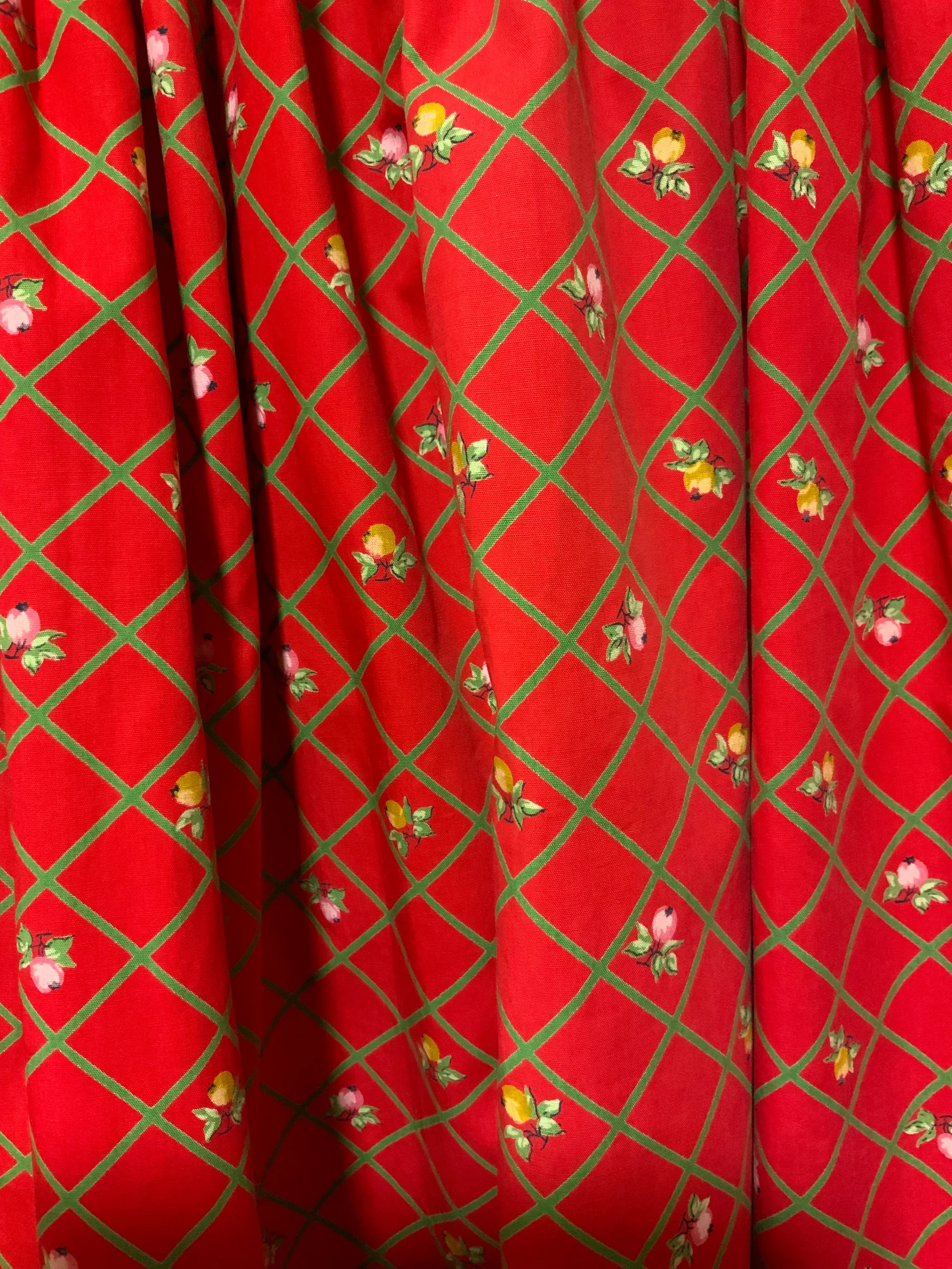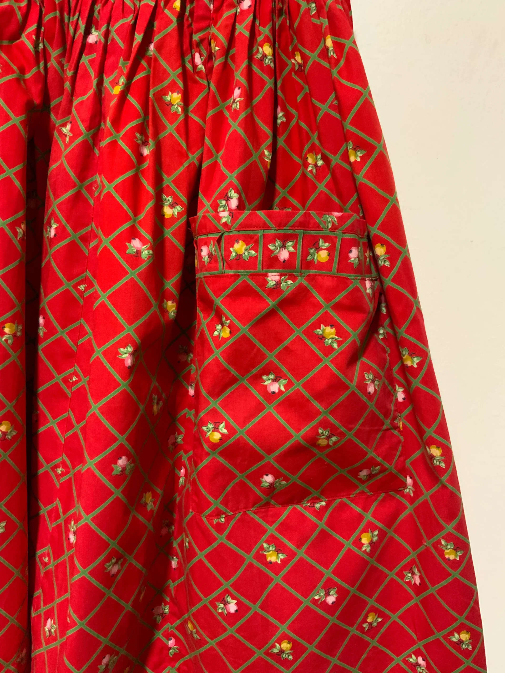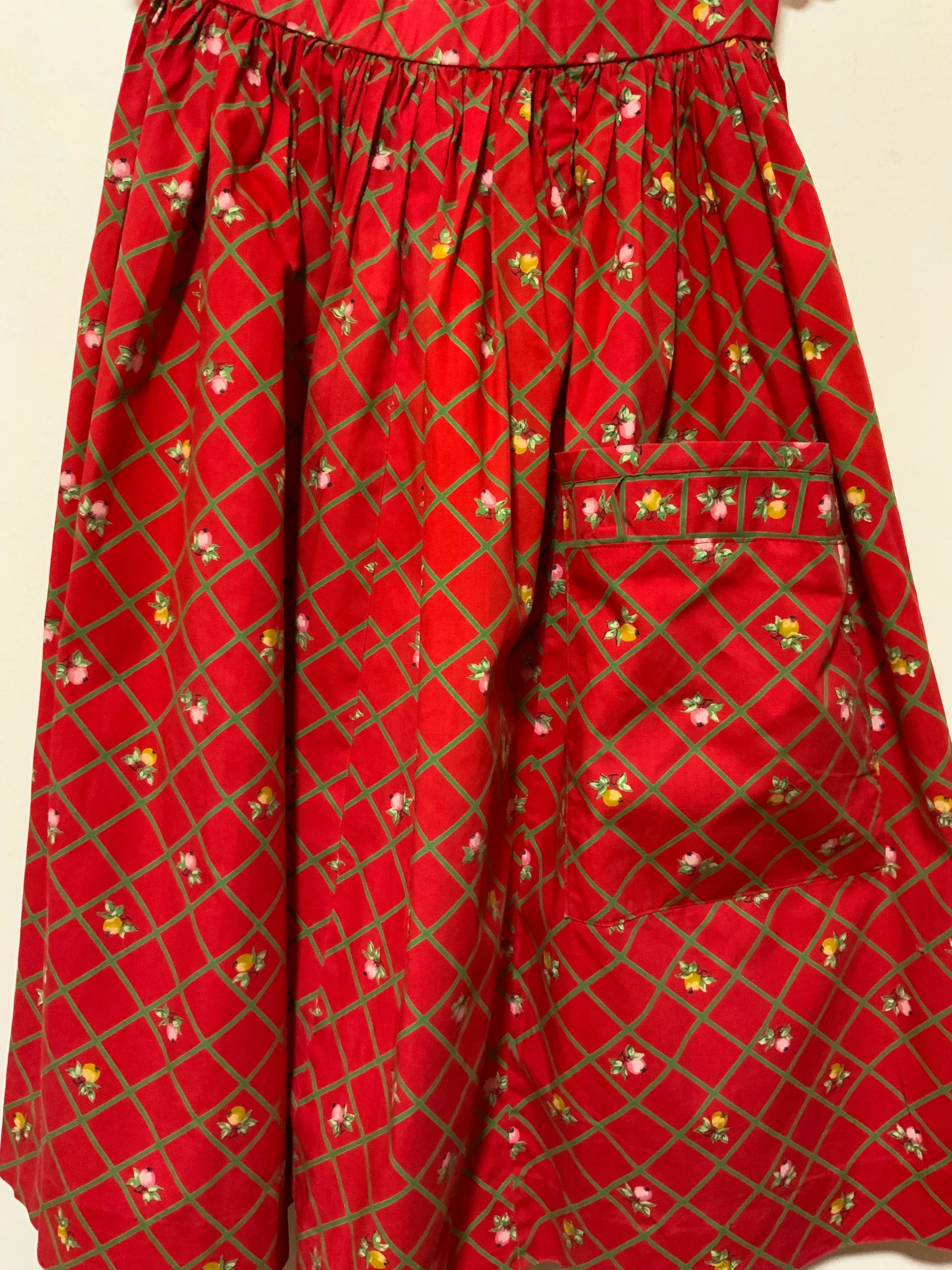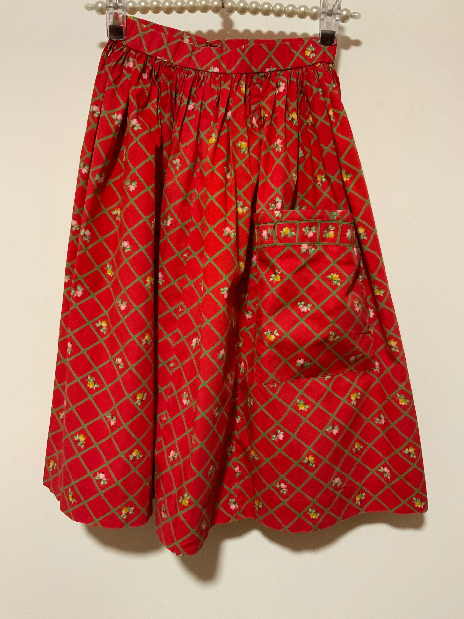 Jupe à fleurs et carreaux Vintage 1970 entièrement confectionnée main – État excellent rouge et verte en coton, une petite attache a rajouter au dos même si elle s attache tout de même.