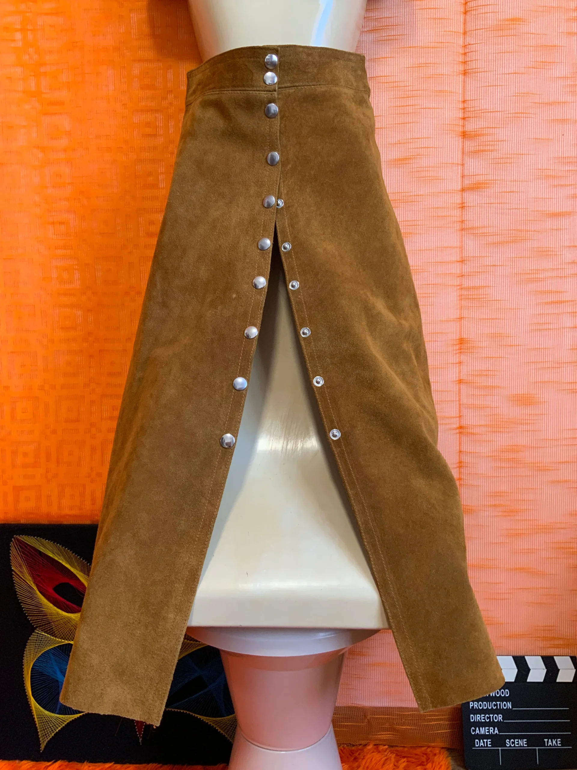 Jupe boutonnée pressions en cuir daim camel Iconique 1970 Vintage Authentique Neuve Création par un Fourreur écriture dans la pièce intérieure daim 1 trou ne se voit dans daim intérieur ceinture doublée – État exceptionnel elle n’a jamais été portée Jupe Neuve 1970- Daim épais et solide— Taille haute.