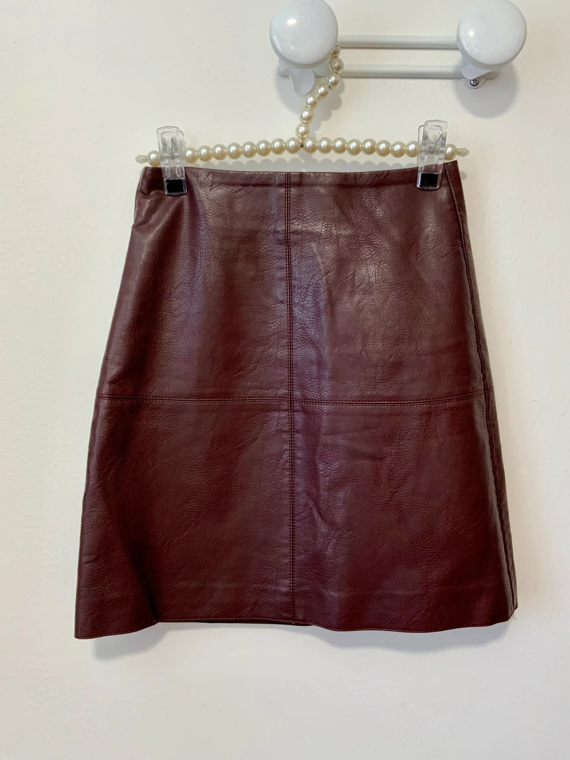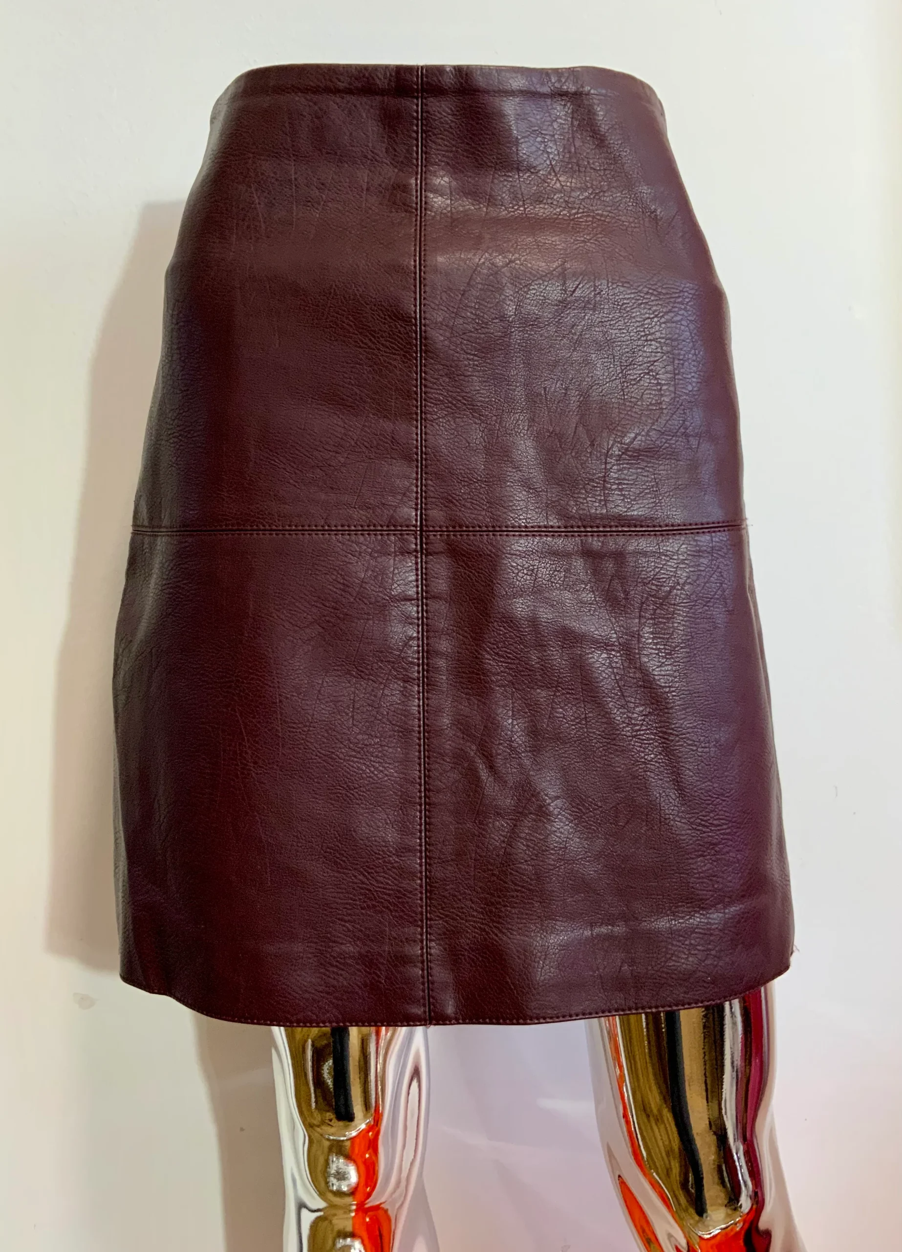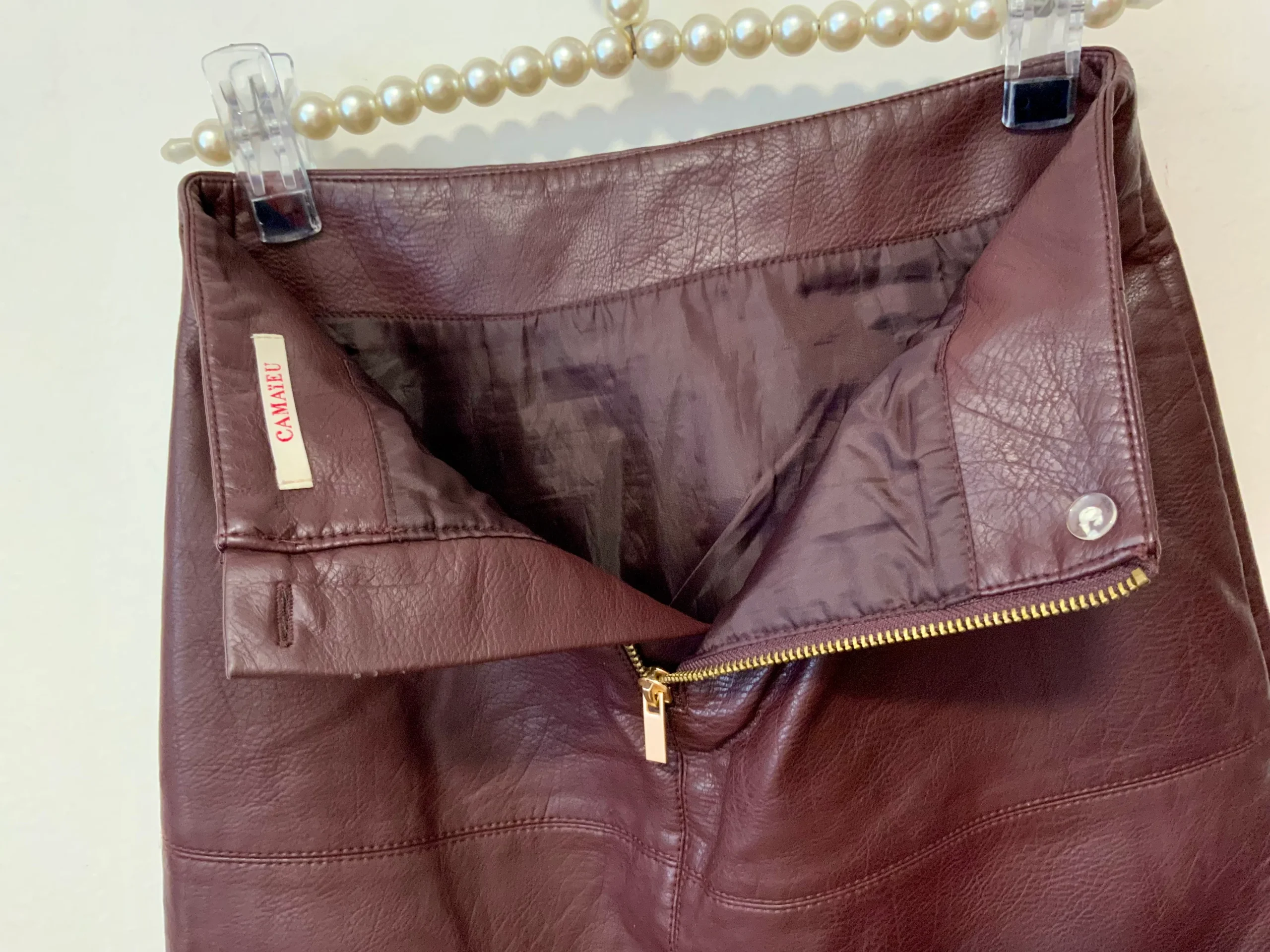 Jupe courte en simili cuir marron bordeaux Vintage Marque Camaïeu 1990- Fermeture éclair doré dos et doublure satinée complète.