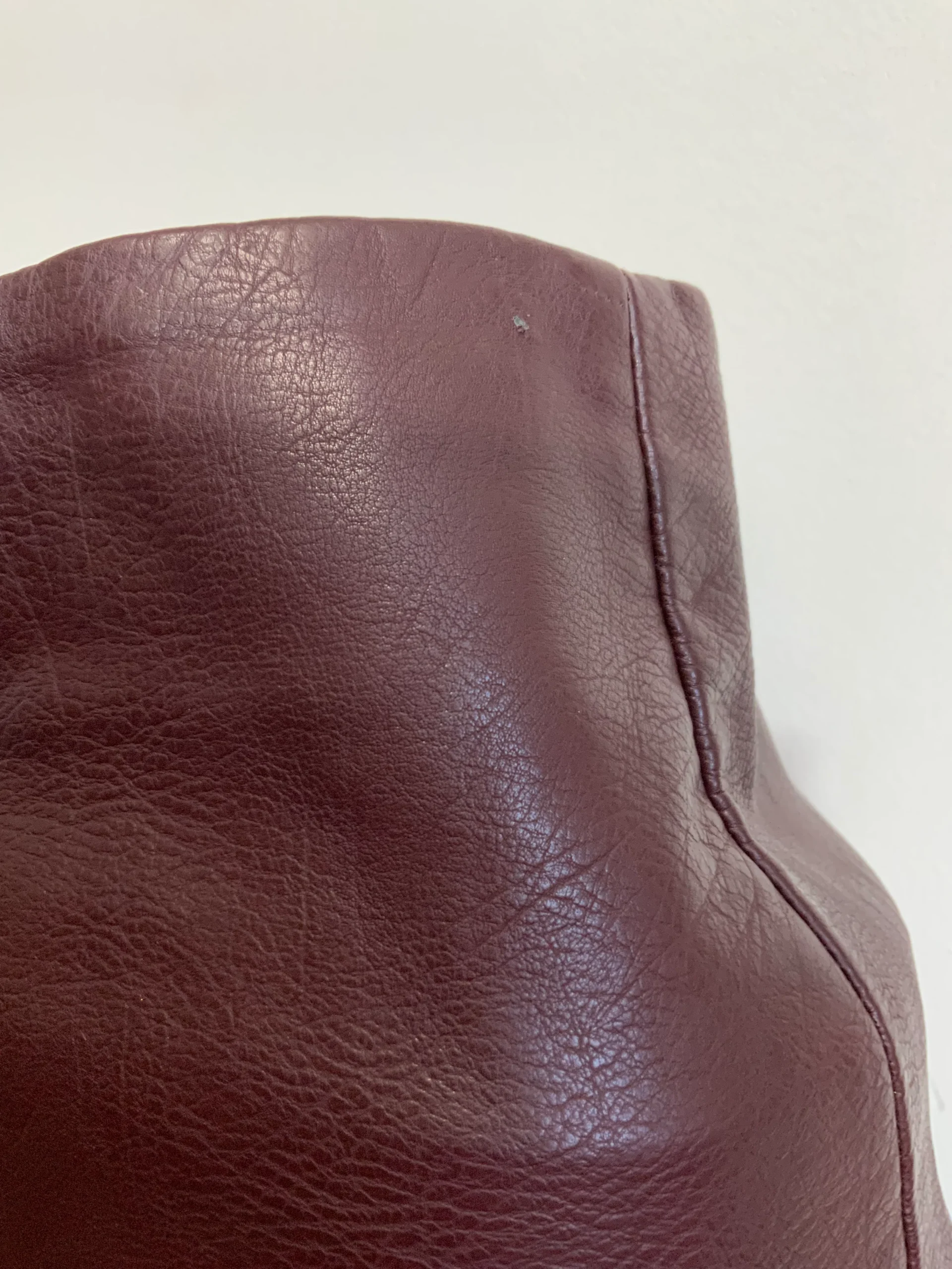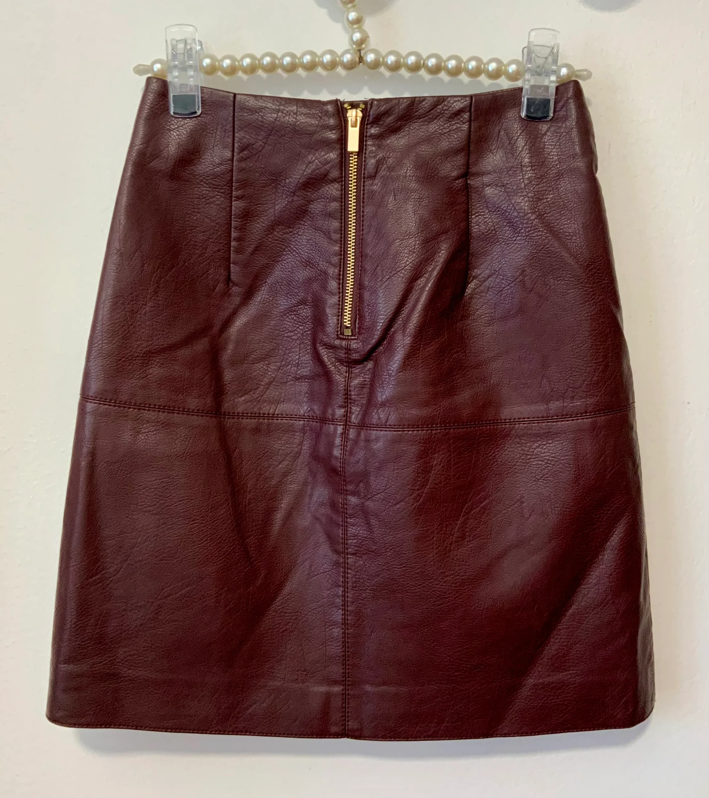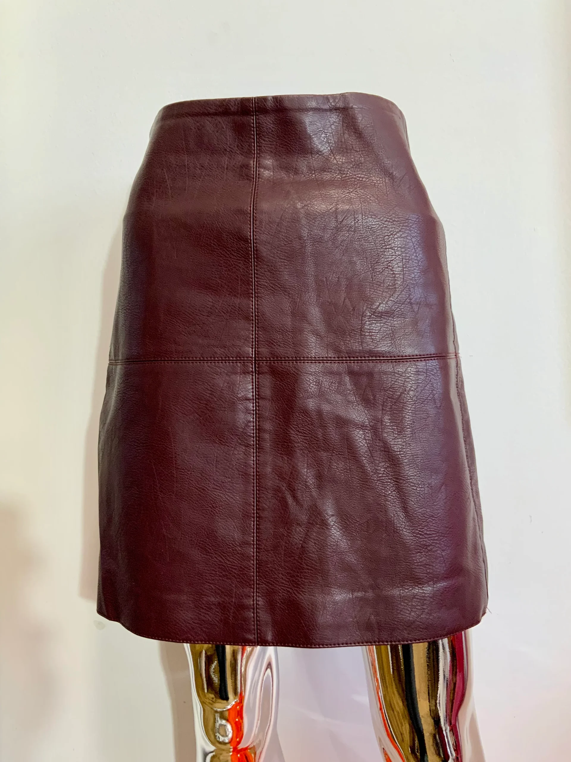 Jupe courte en simili cuir marron bordeaux Vintage Marque Camaïeu 1990- Fermeture éclair doré dos et doublure satinée complète.