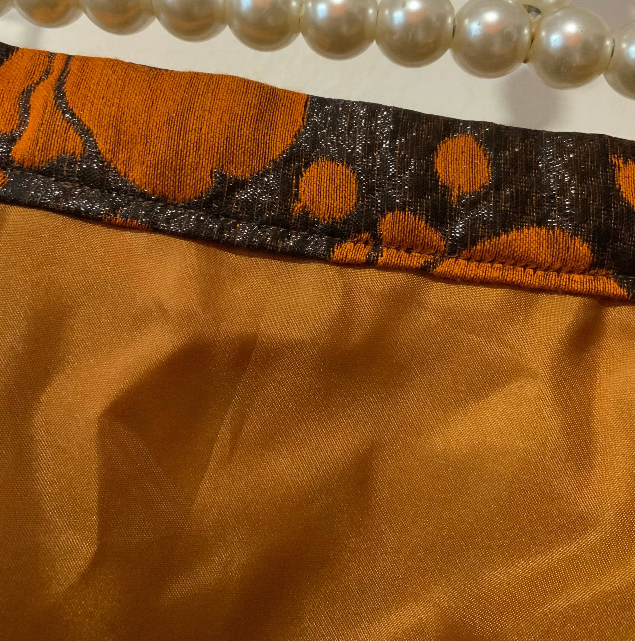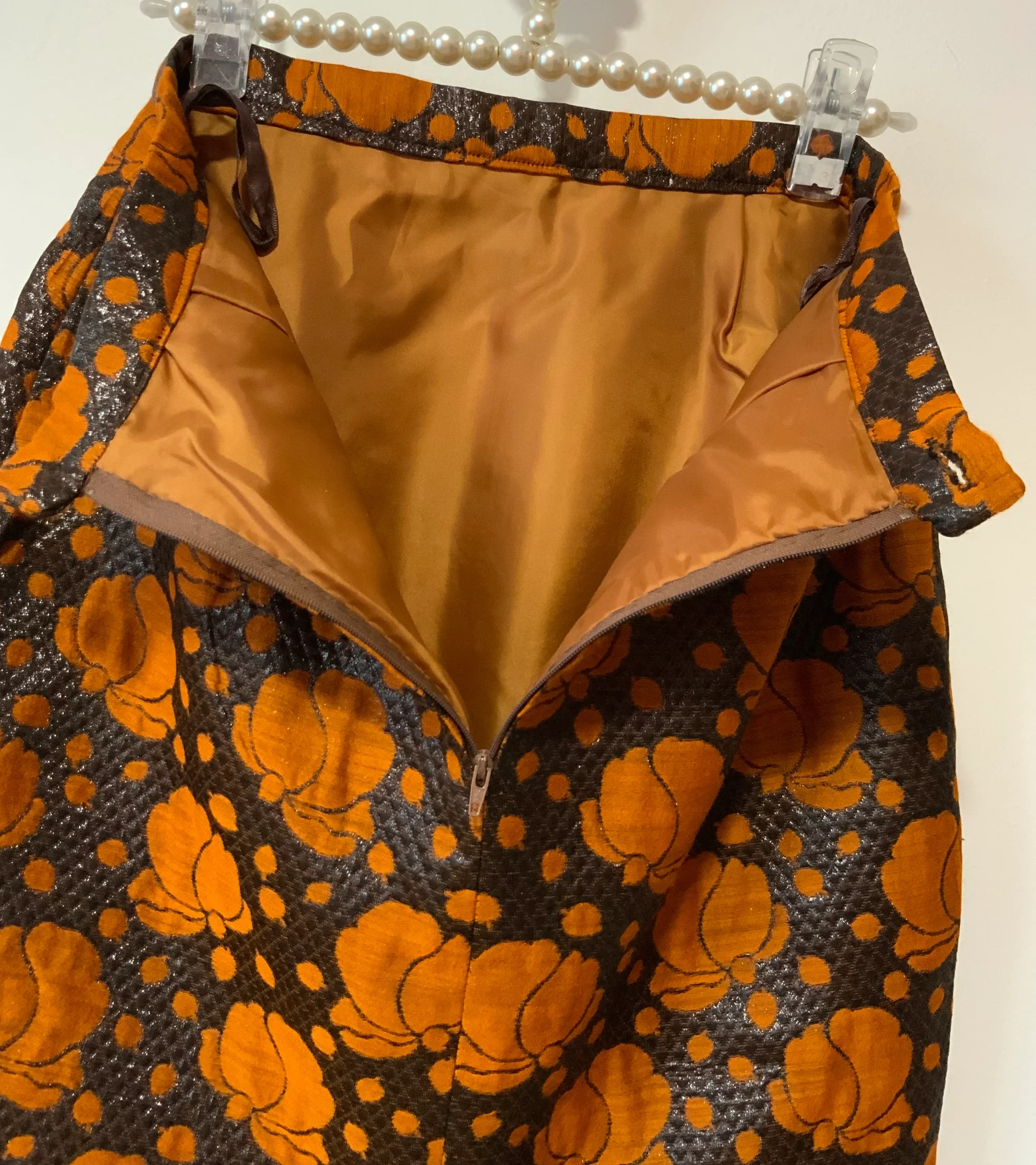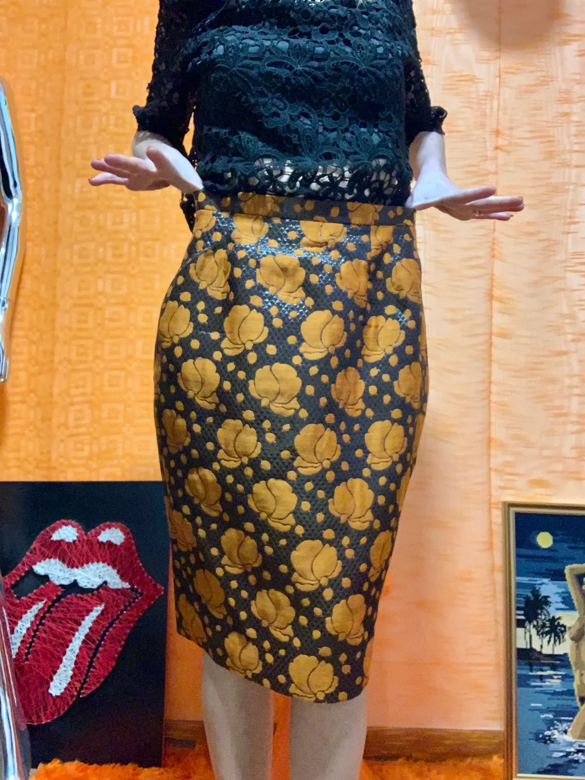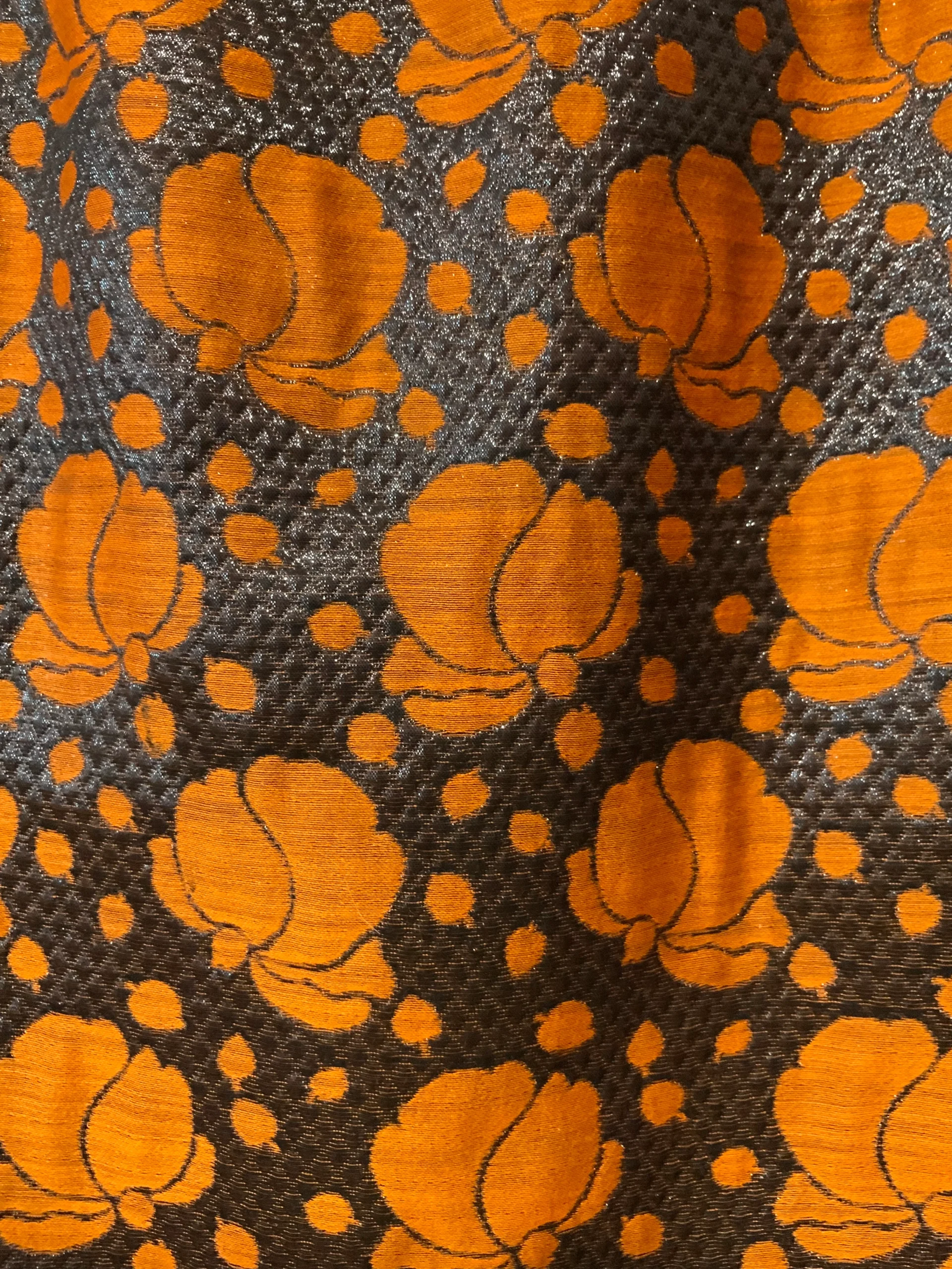 Création Jupe droite Vintage Confection main – Matière noire brillante et fleurs oranges – Tres chic.