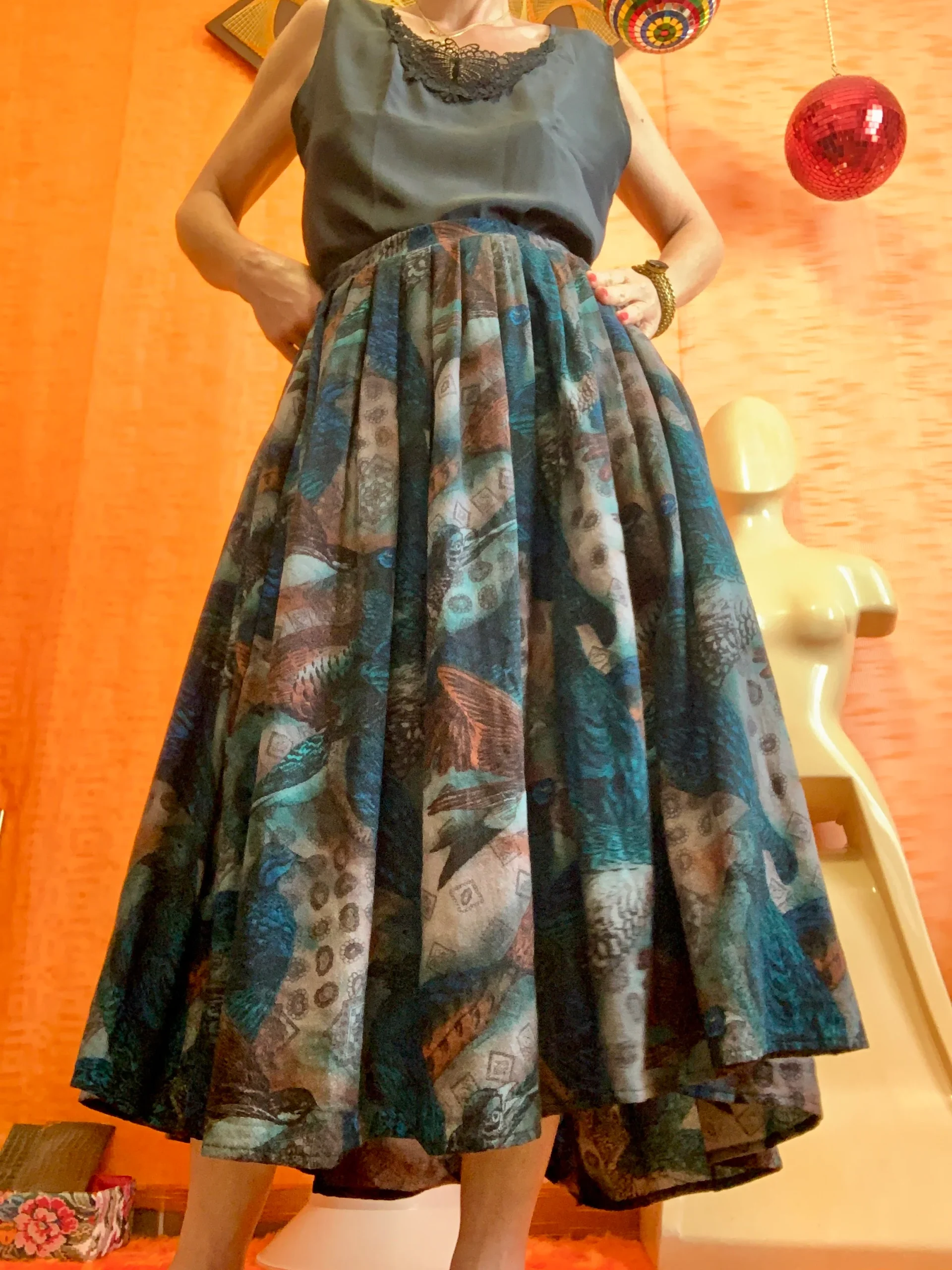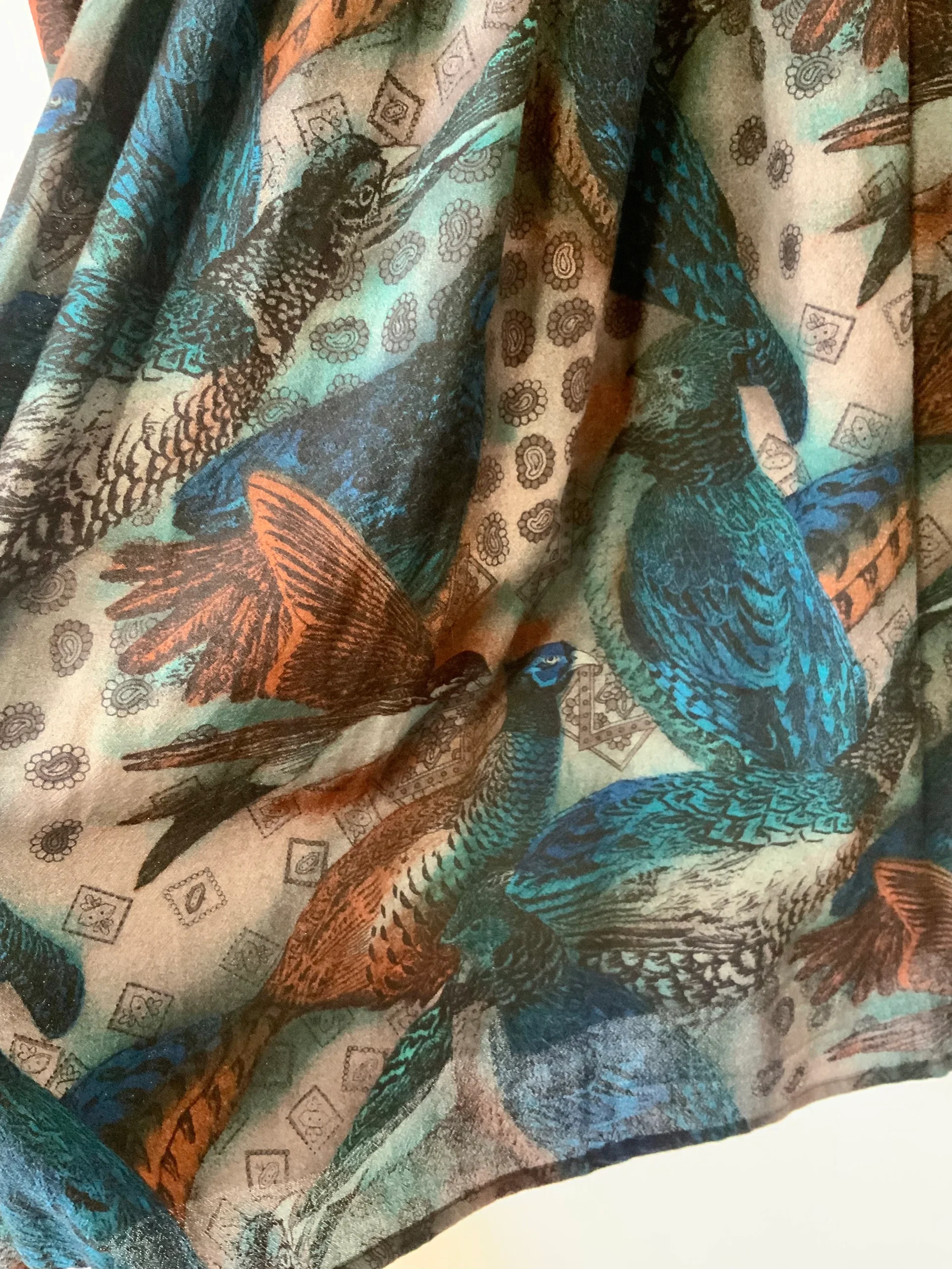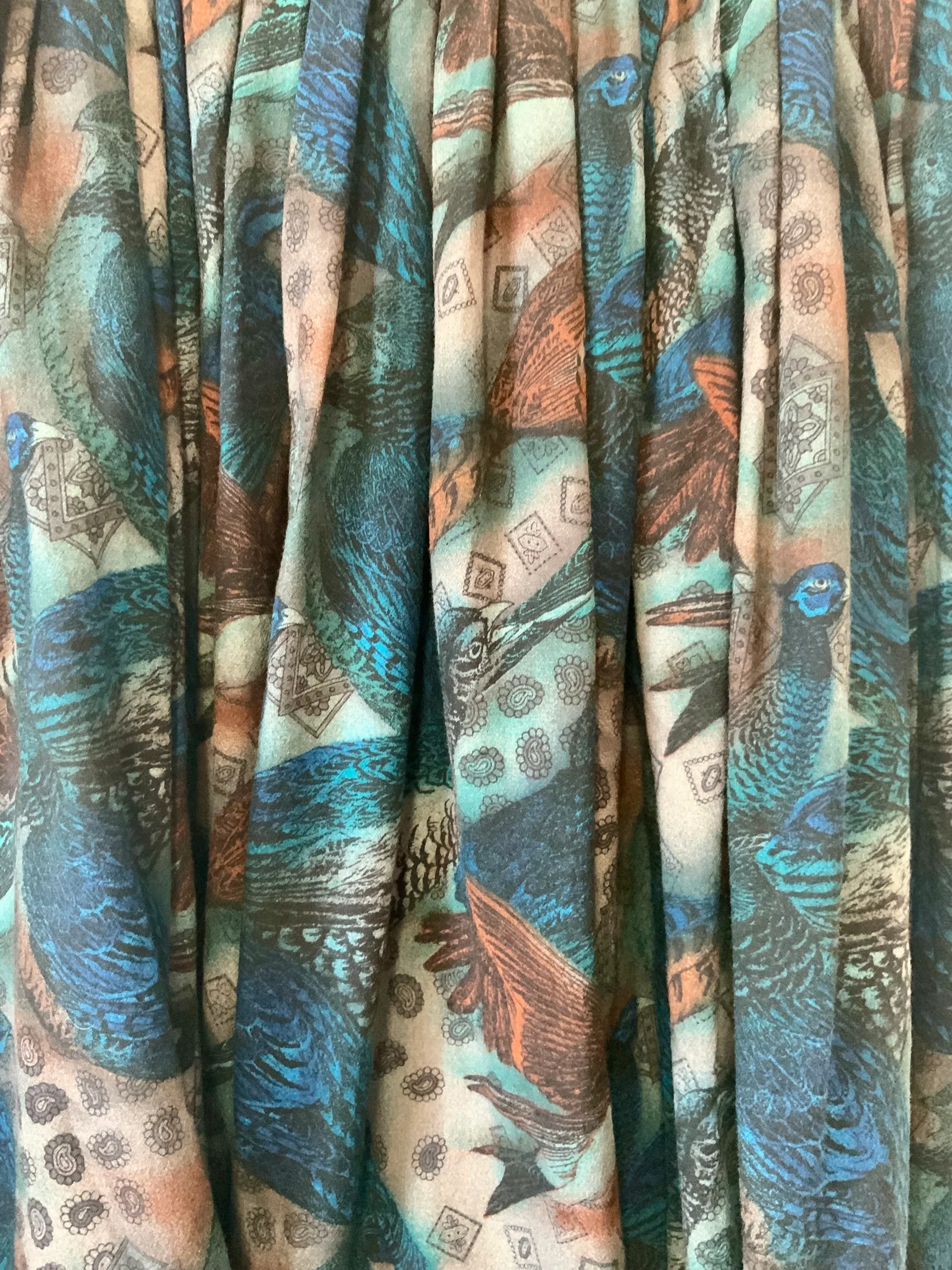 Très chic robe Made in France Marque Saint Charles Vintage – Taille élastique motifs paisley/cachemires et oiseaux, couleurs couleurs bleues foncées –
