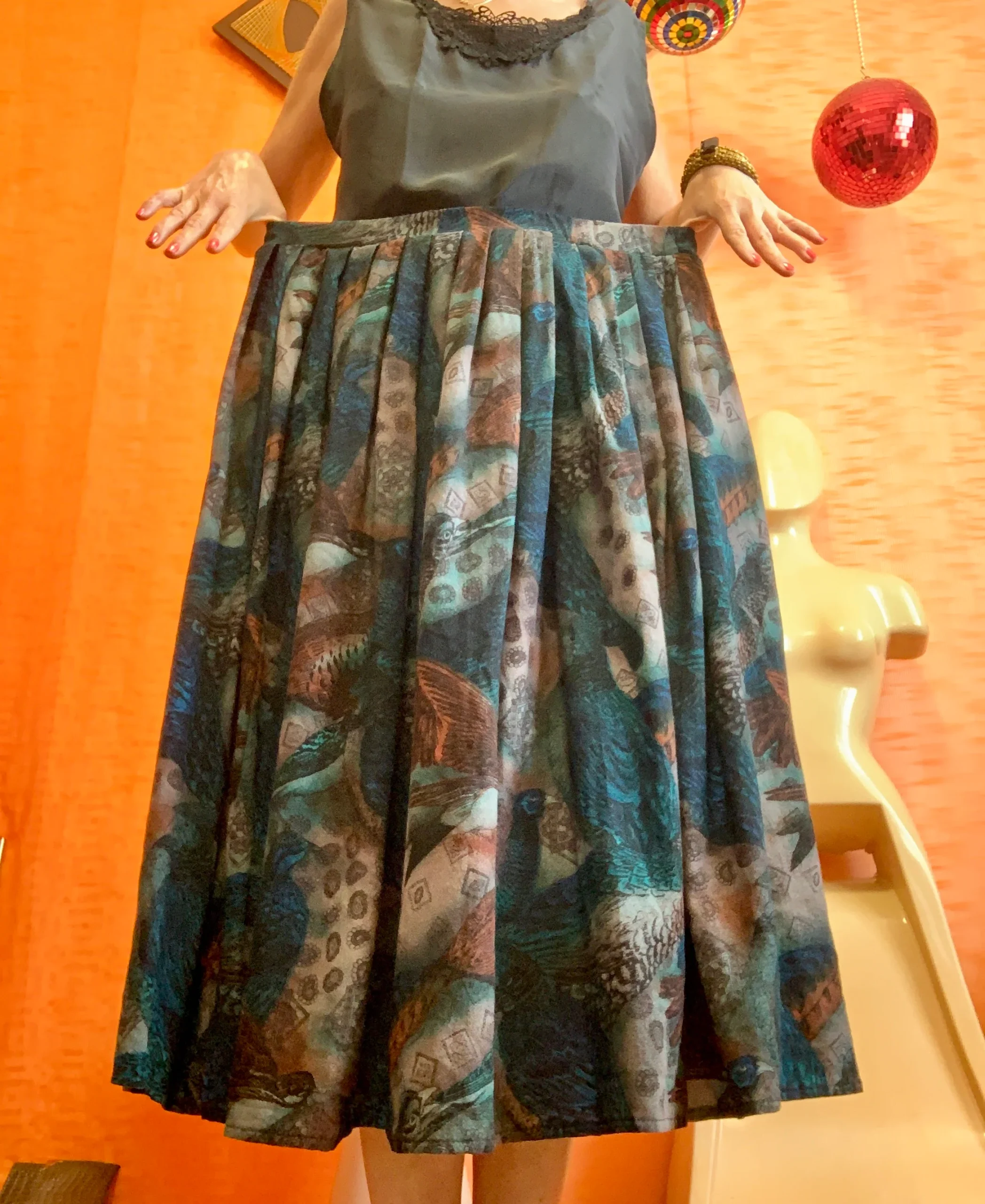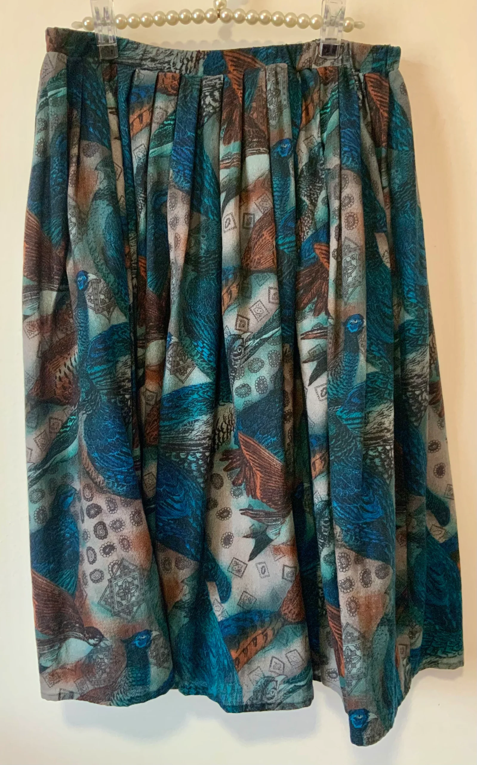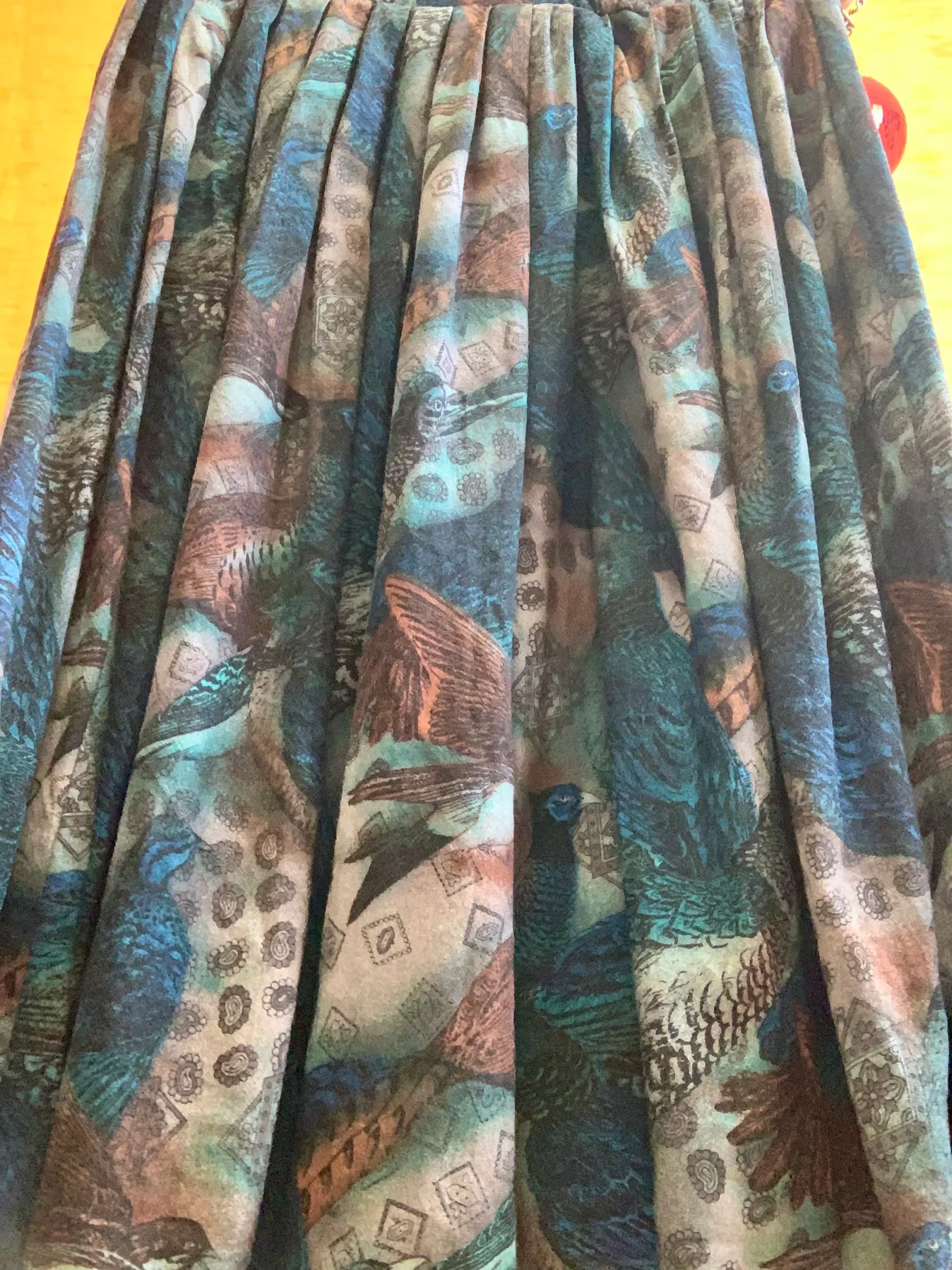 Très chic robe Made in France Marque Saint Charles Vintage – Taille élastique motifs paisley/cachemires et oiseaux, couleurs couleurs bleues foncées –