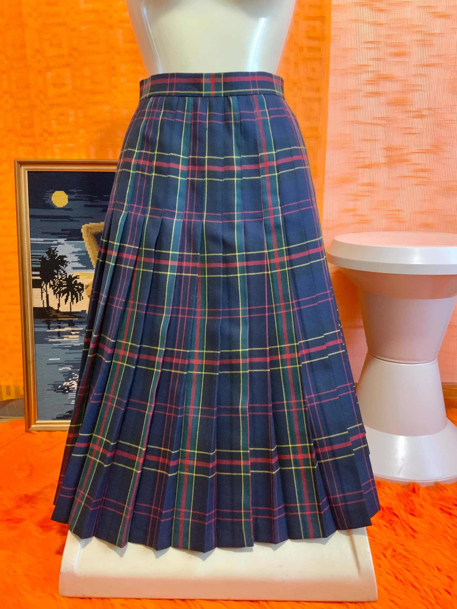 Jupe plissée en tartan écossais carreaux sur fond bleu marine – Entièrement confectionnée à la main par machine à coudre Vintage 1980-