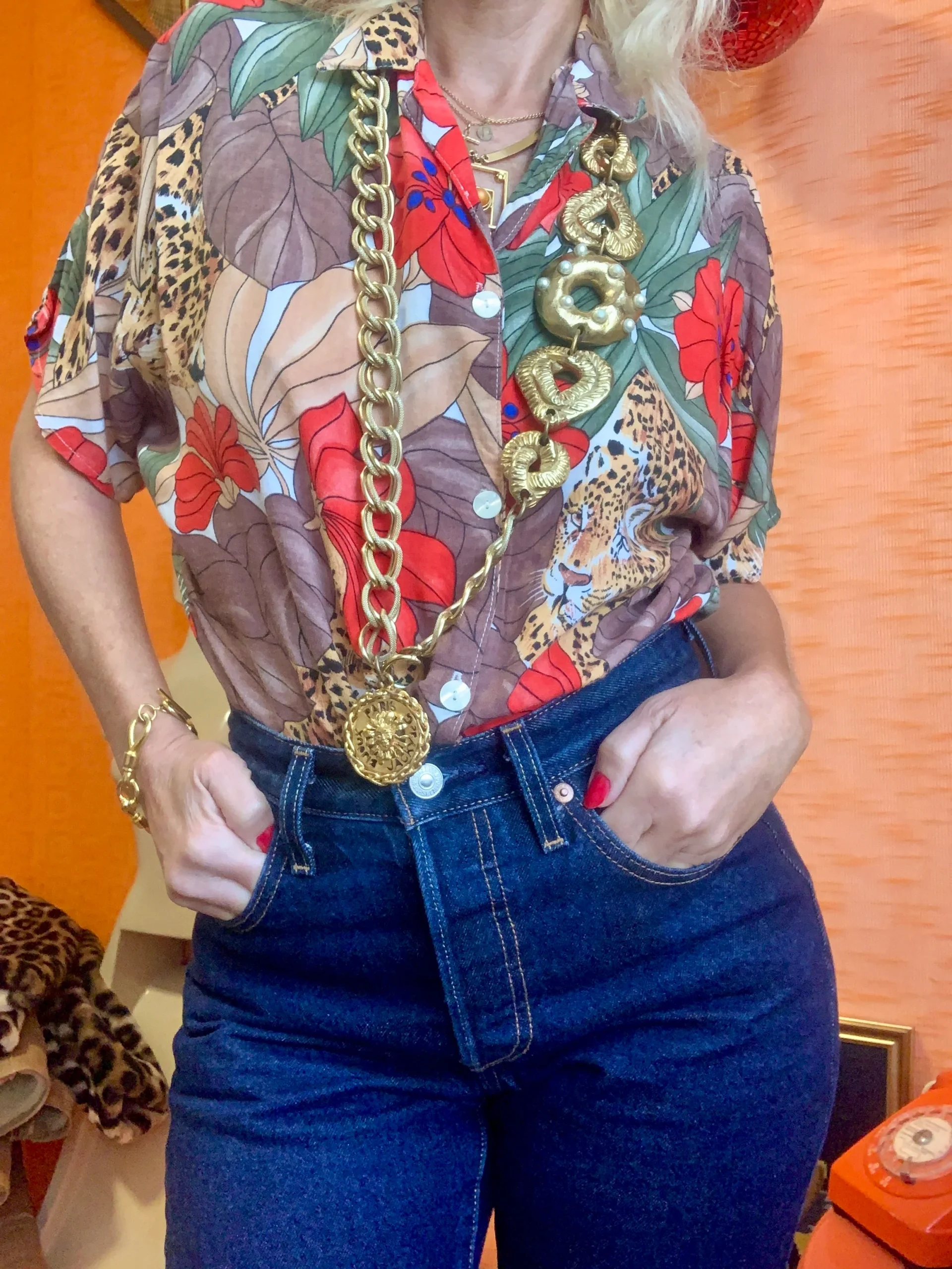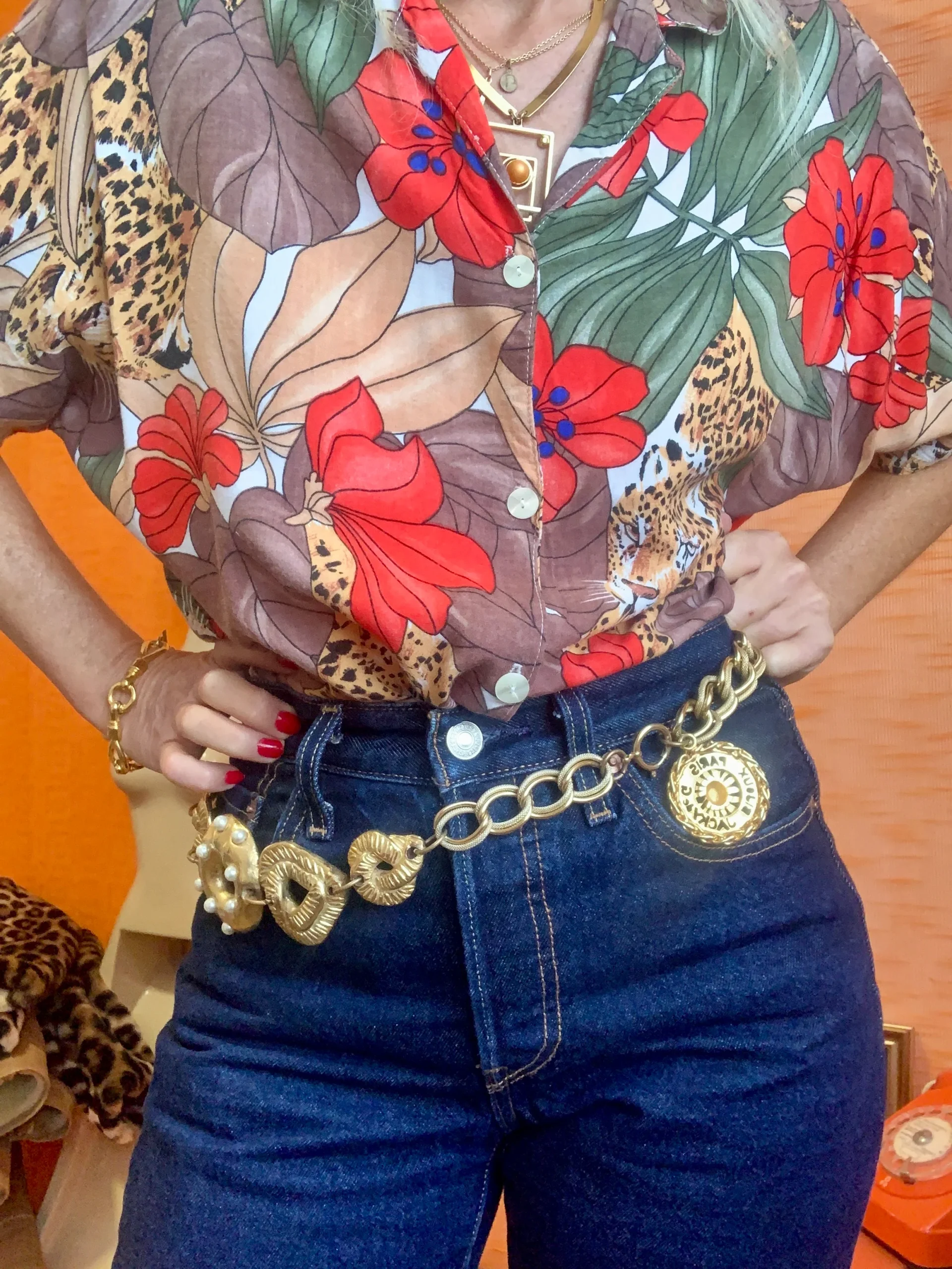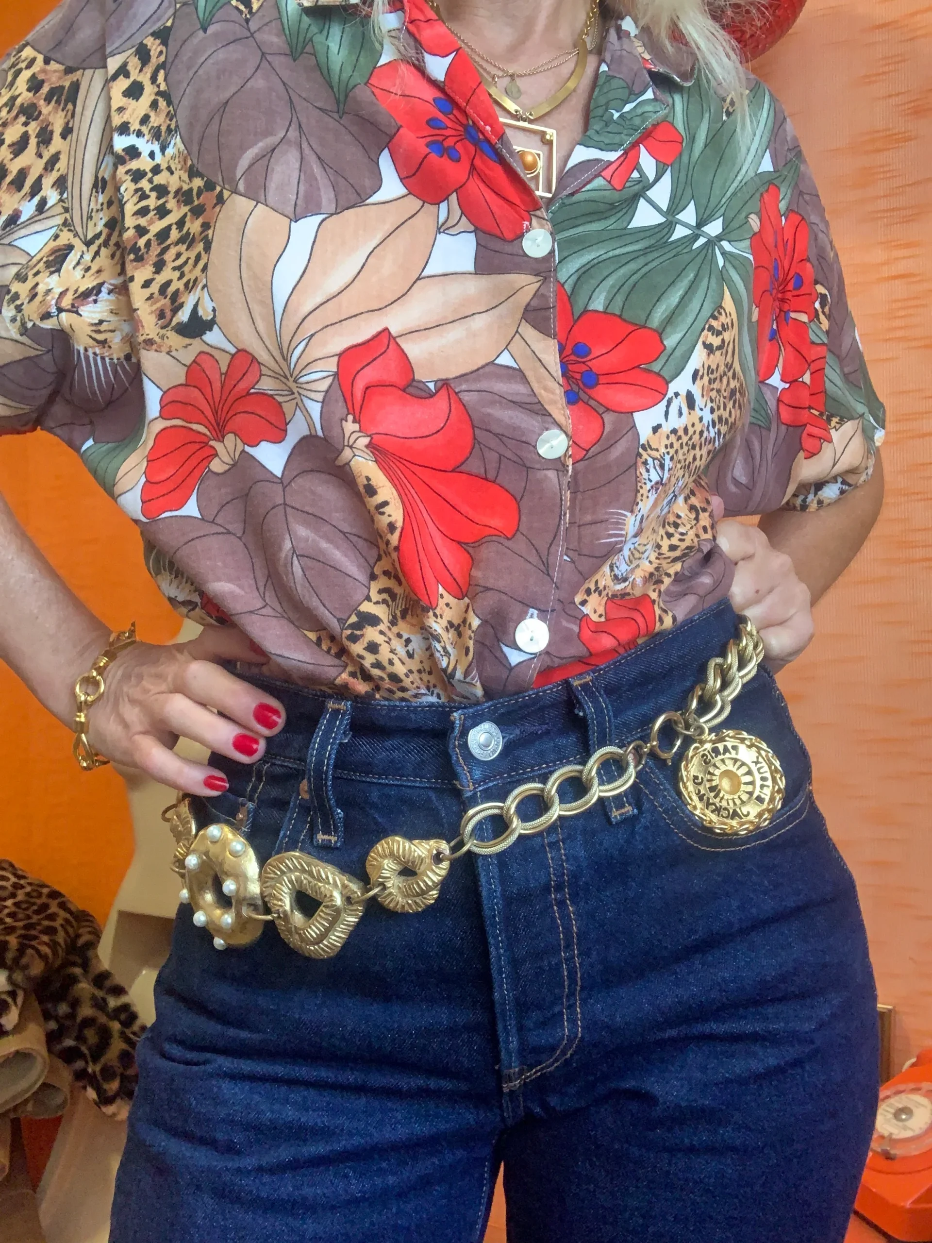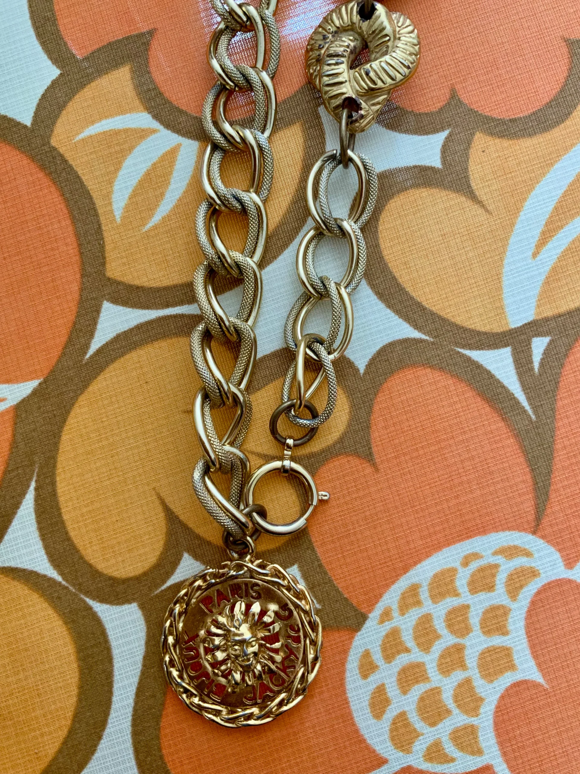 Magnifique Ceinture Chaîne / Collier Vintage 90 de chez Jacky de G. Ceinture à la base pouvant aussi être portée en collier sans aucun problème, son état est exceptionnel malgré de très légères petites traces dorures qui ne se voit pas – Pur Vintage 1990 de la célèbre maison haut de gamme Jacky de G. France Paris. Avec cercle logo nom sur le devant.