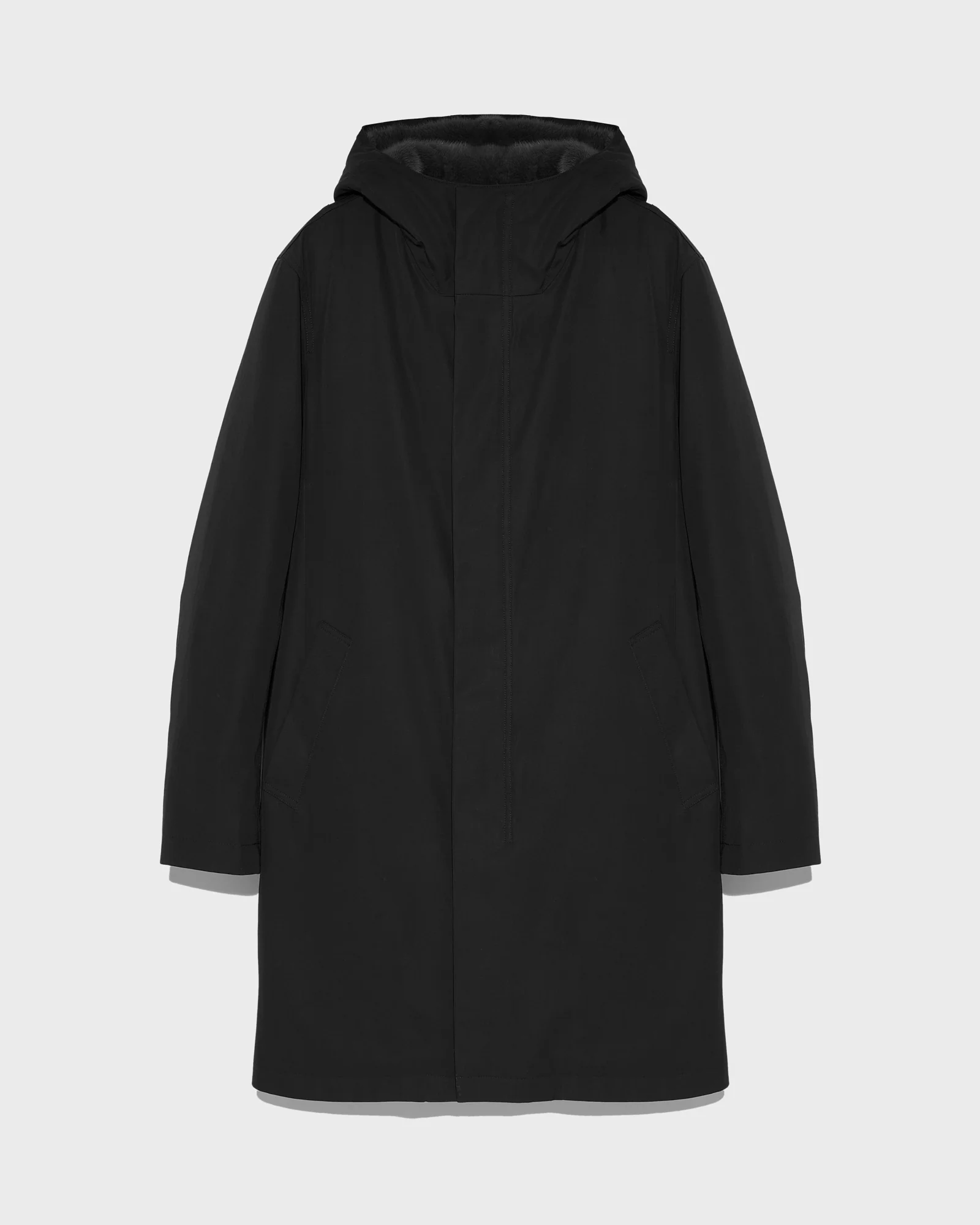 L’élégance luxueuse d’un manteau à capuche en tissu technique façon gabardine avec une doublure amovible en vison long poil. Silhouette épurée, légèreté d’un tissu très résistant, douceur du vison se combinent dans un modèle adapté à toutes les occasions ainsi qu’aux frimas de l’hiver.