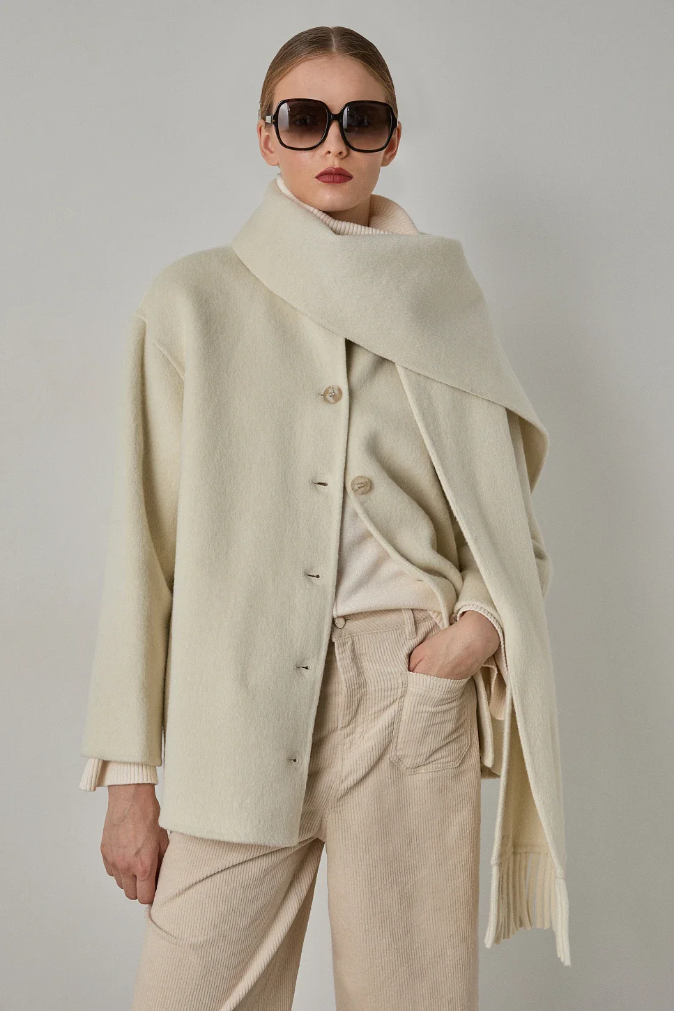 Manteau court coupe droite, fermeture à boutons, col écharpe intégrée