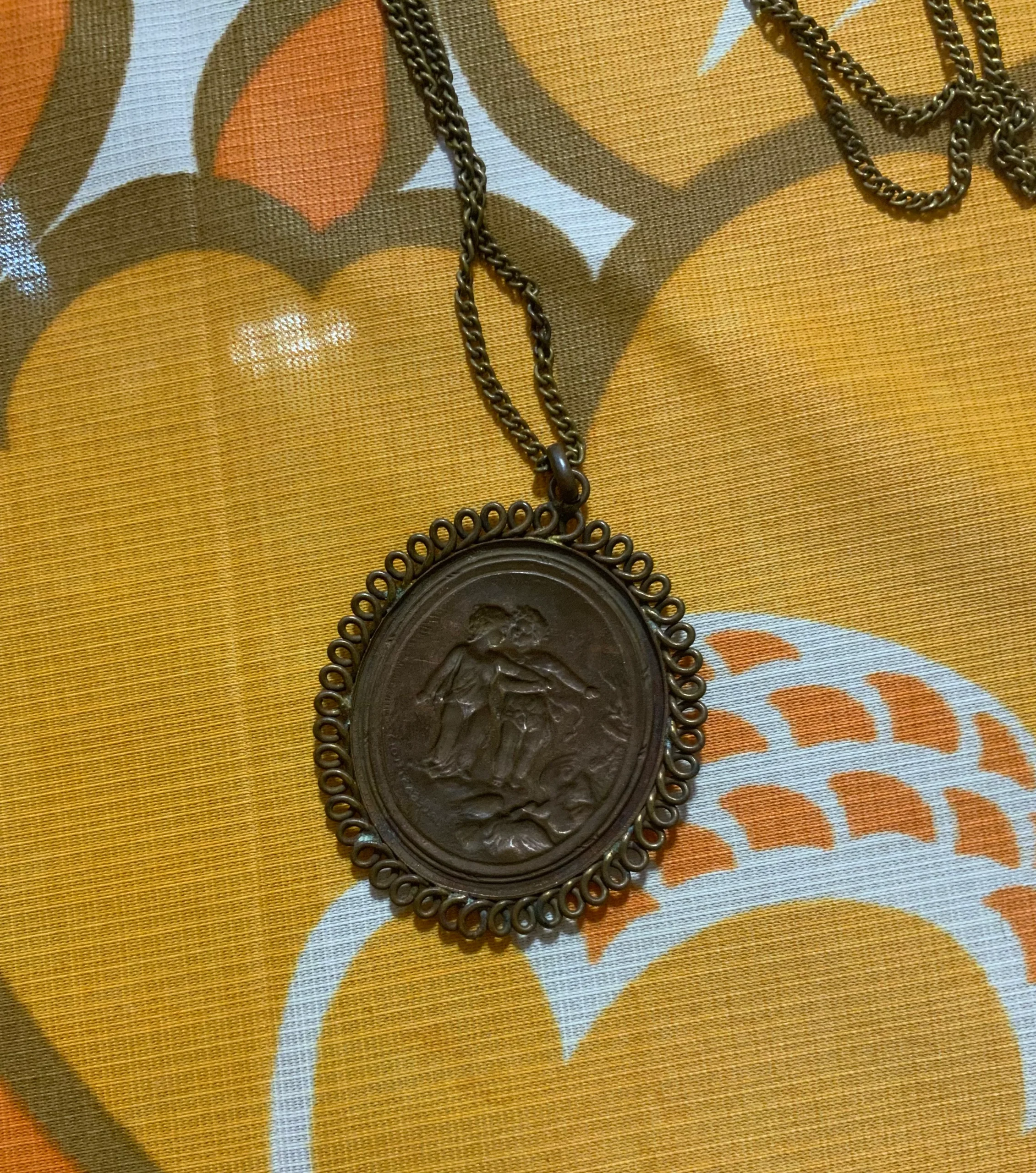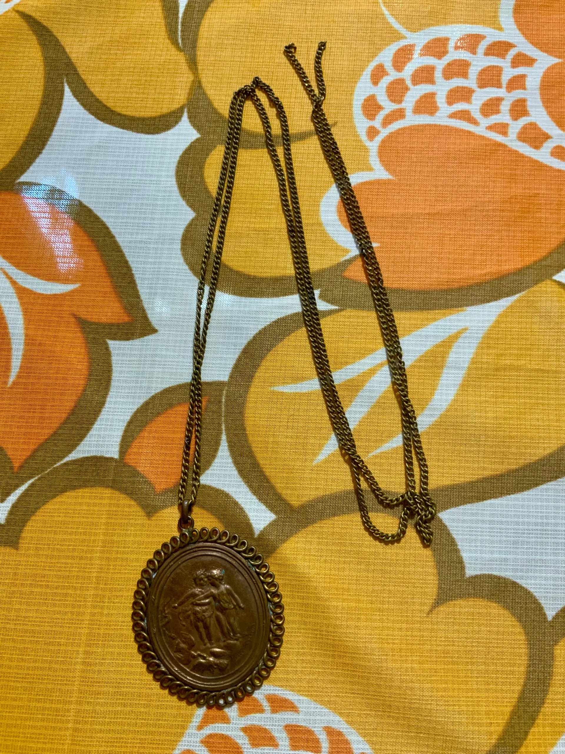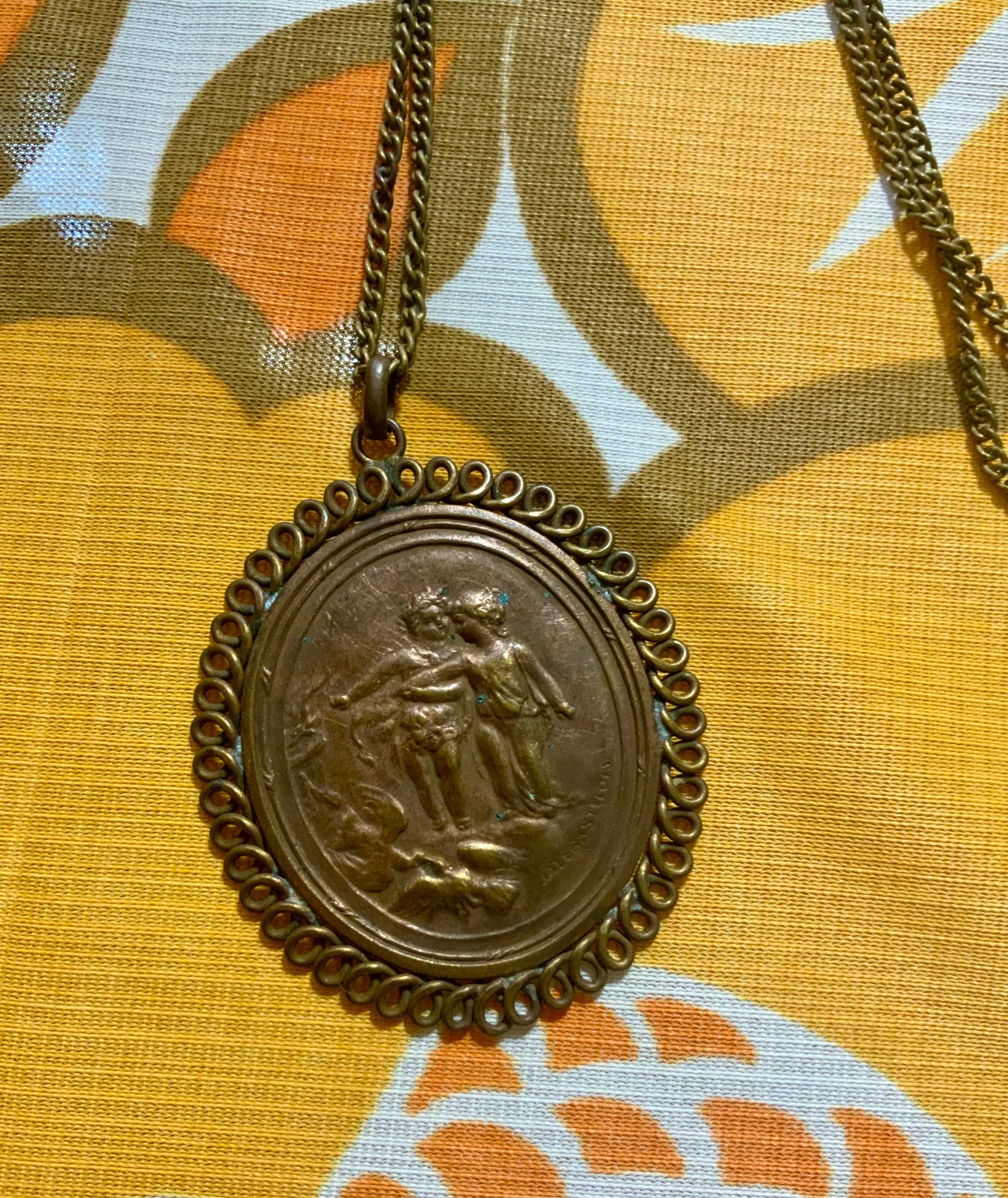 Avec sa chaîne mais cassée il lui manque son fermoir- légères traces sur le laiton Dimensions du Médaillon = 5,5×4,5 centimètres.