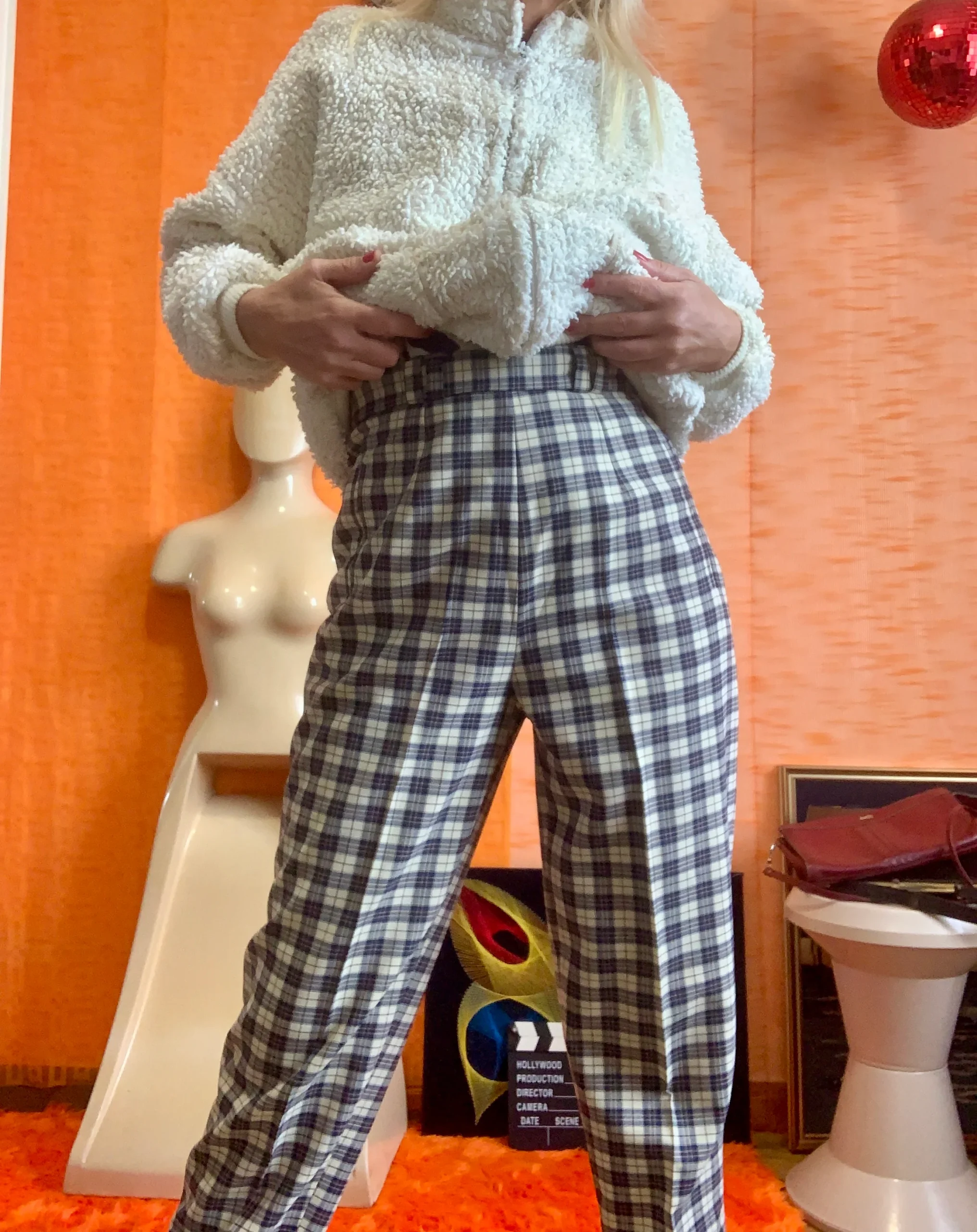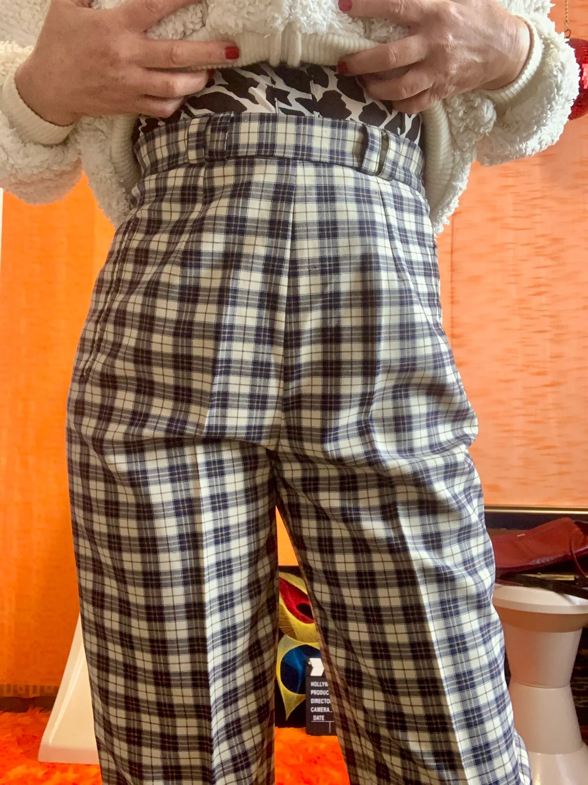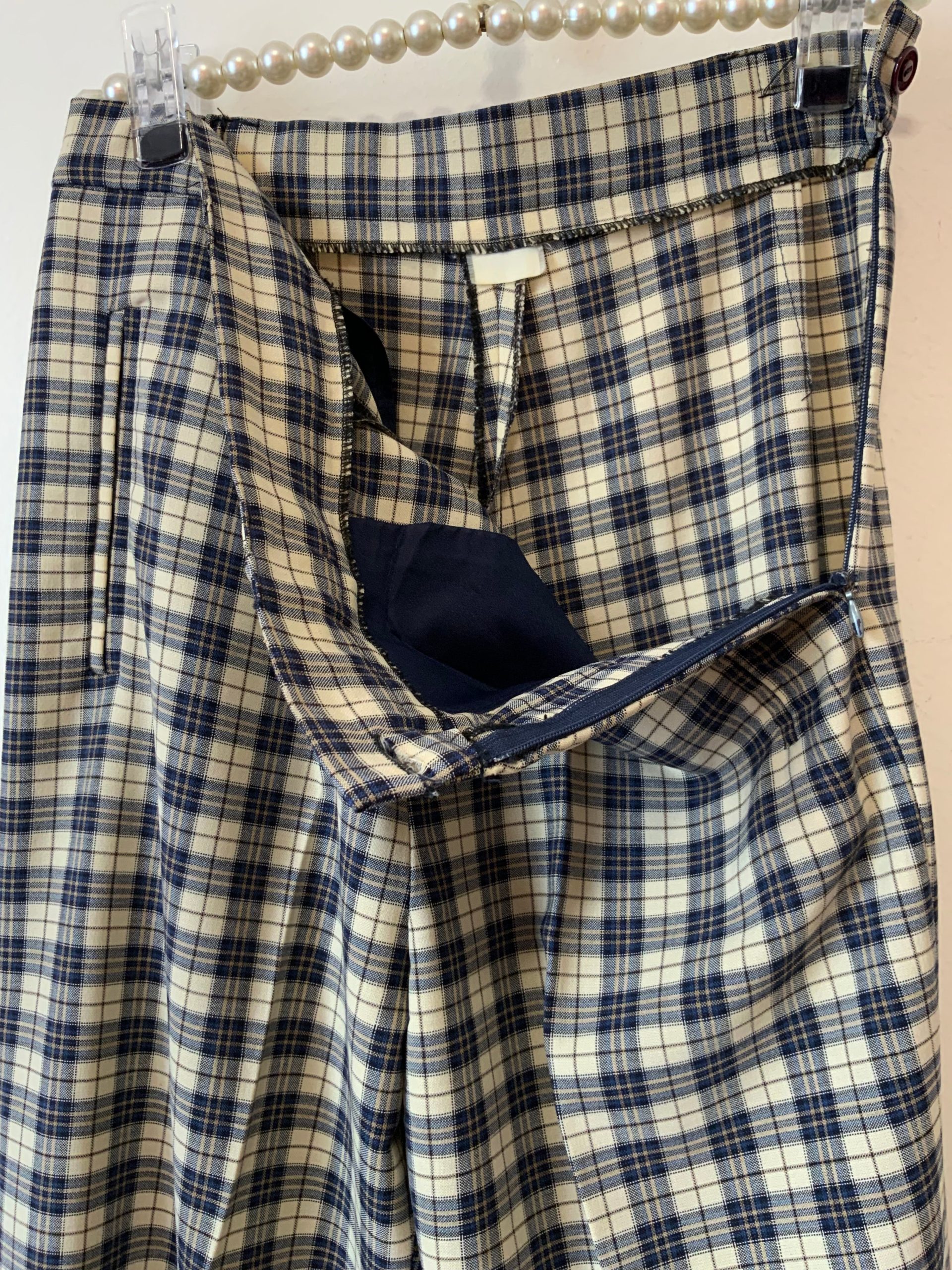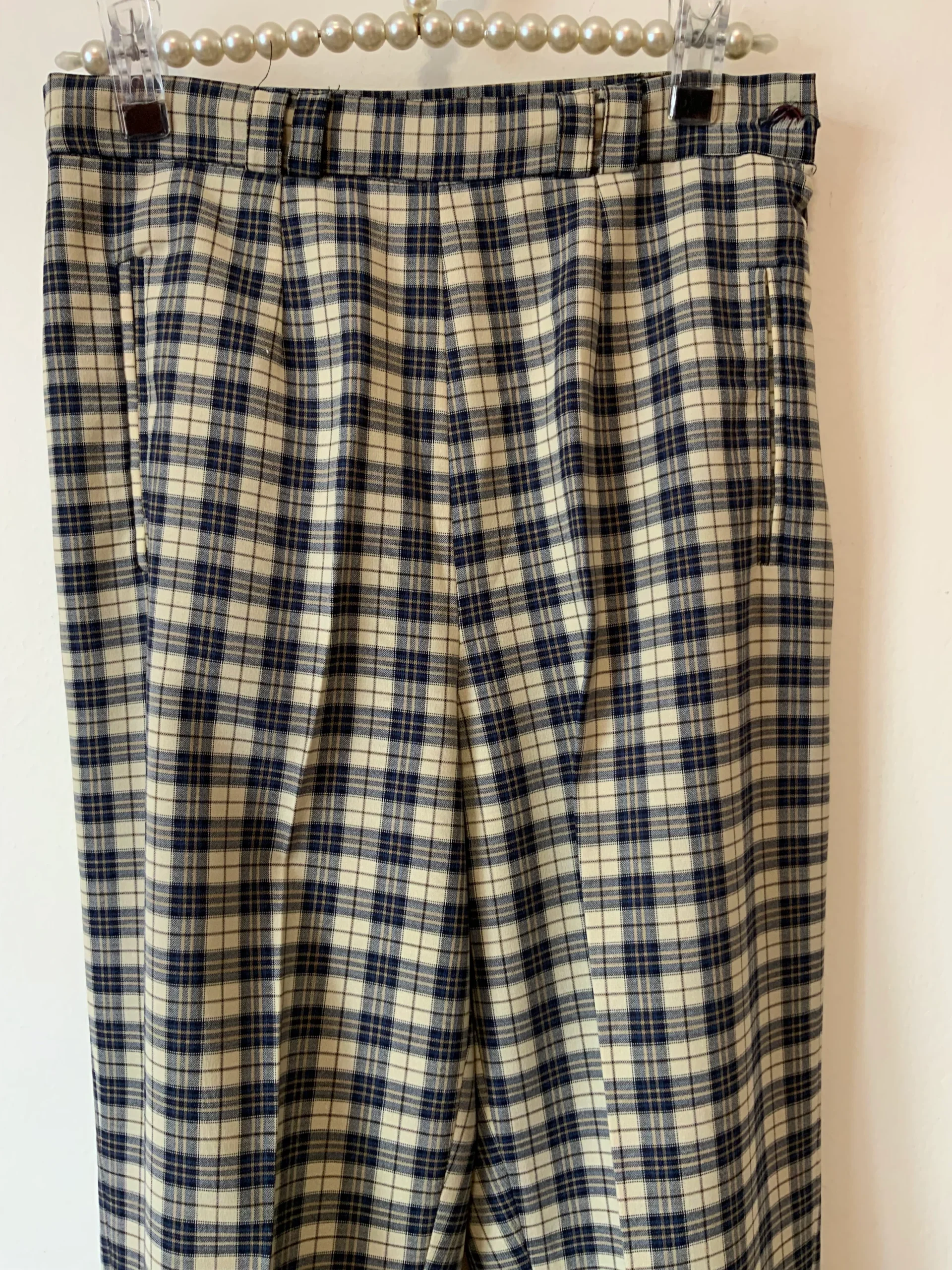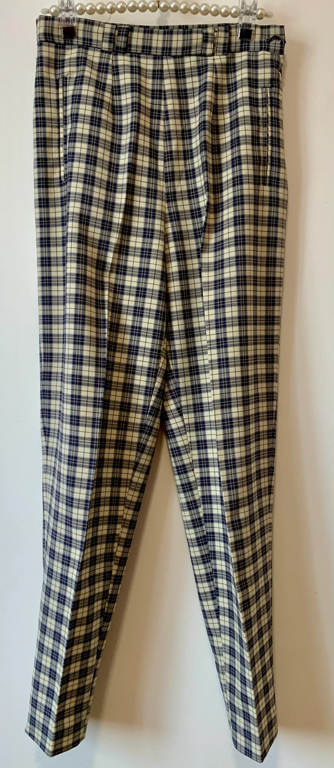 Pantalon à pinces droit à carreaux écossais bleus Vintage 1980/90 Très élégant avec poches côtés, zip et bouton sur hanche.