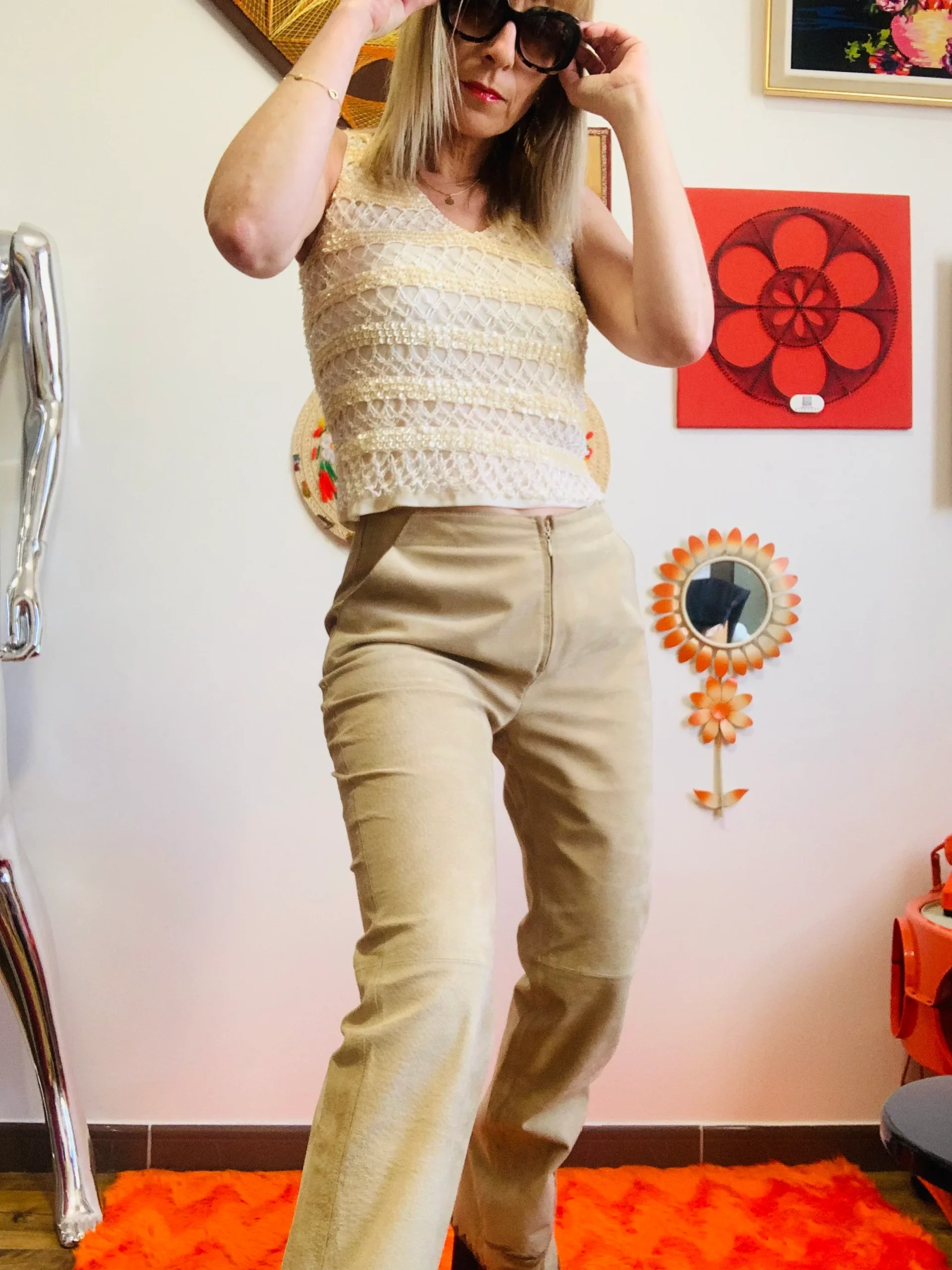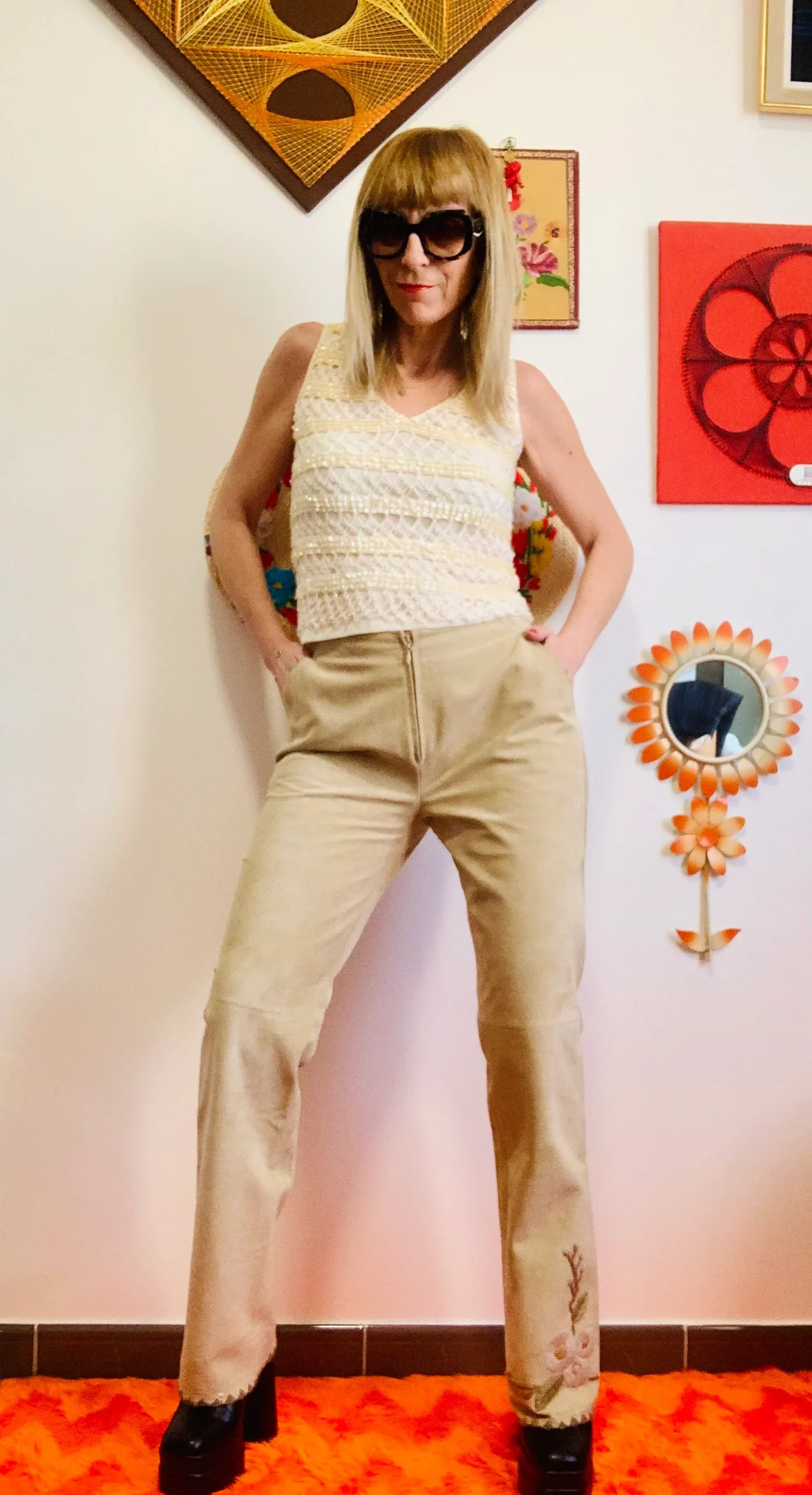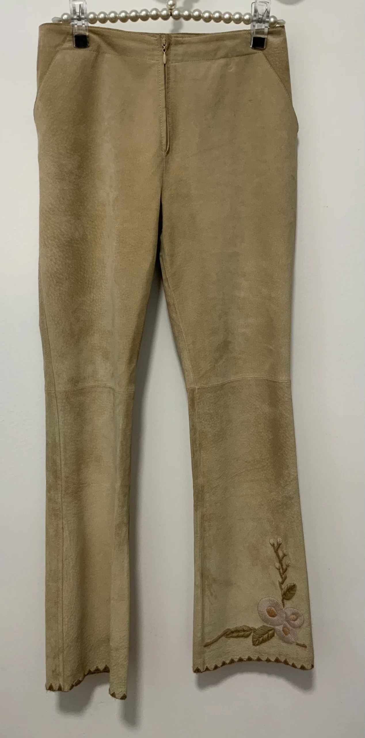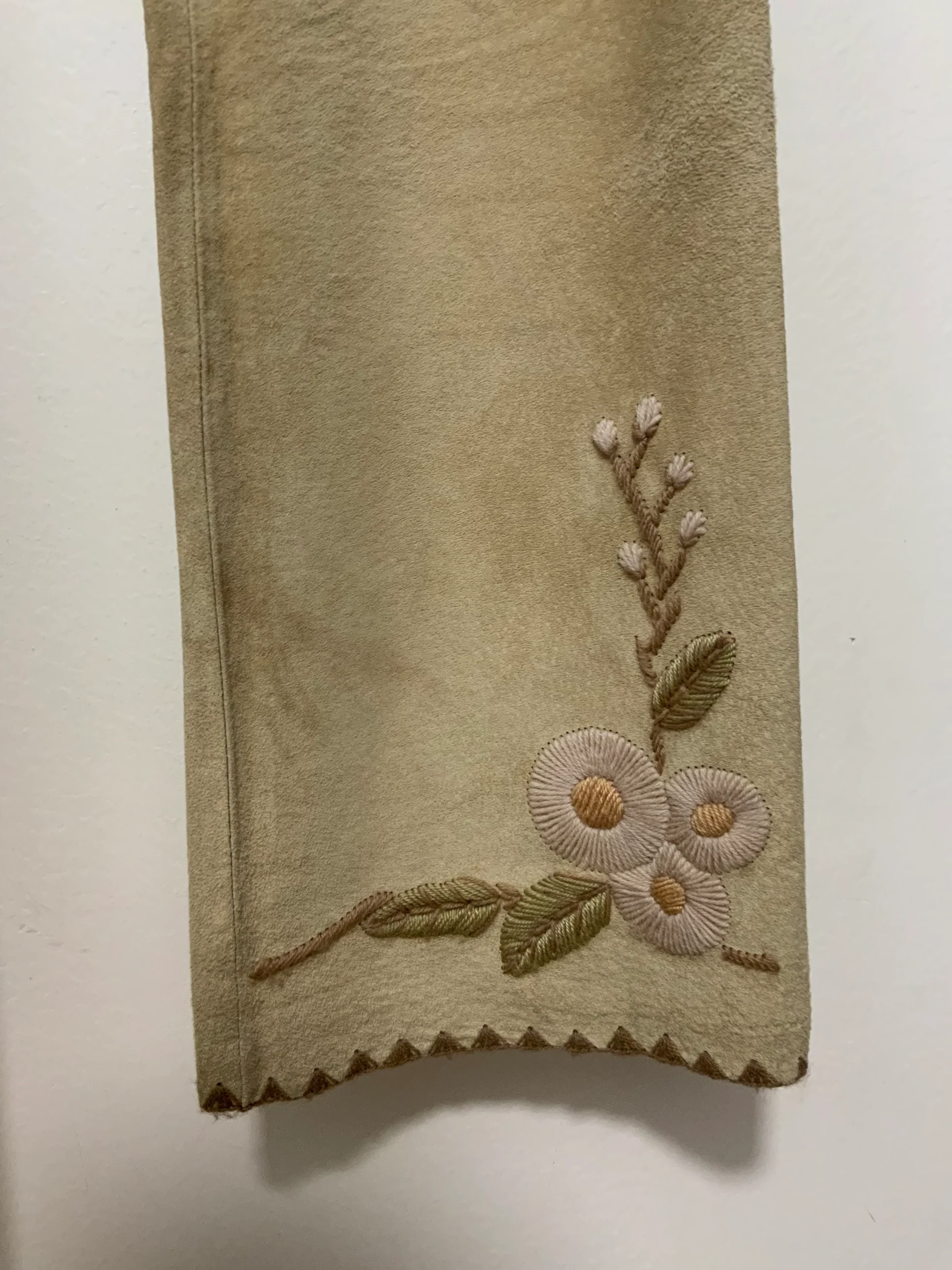 Pantalon Daim beige et Fleurs brodées en bas Beauté Vintage 1990