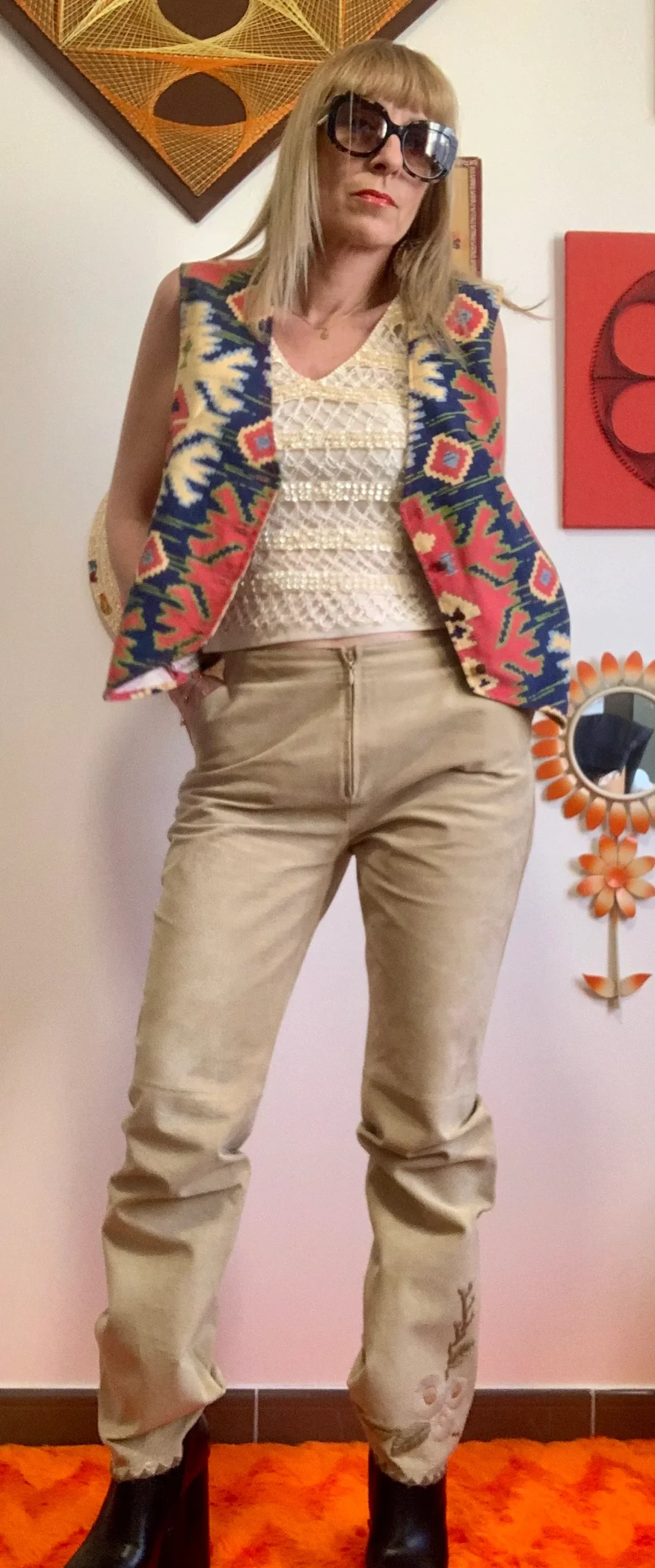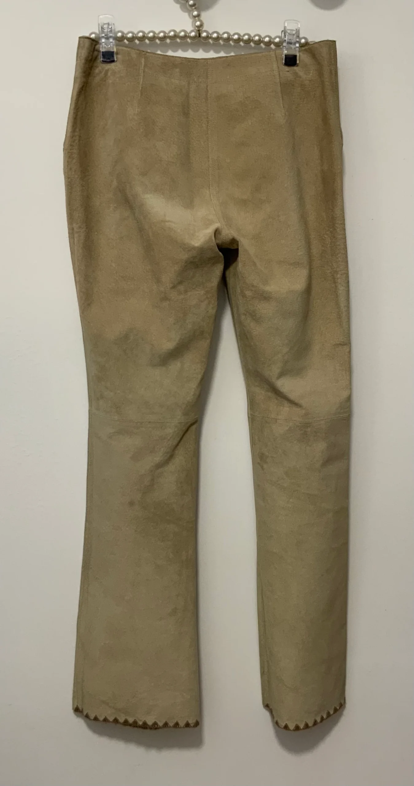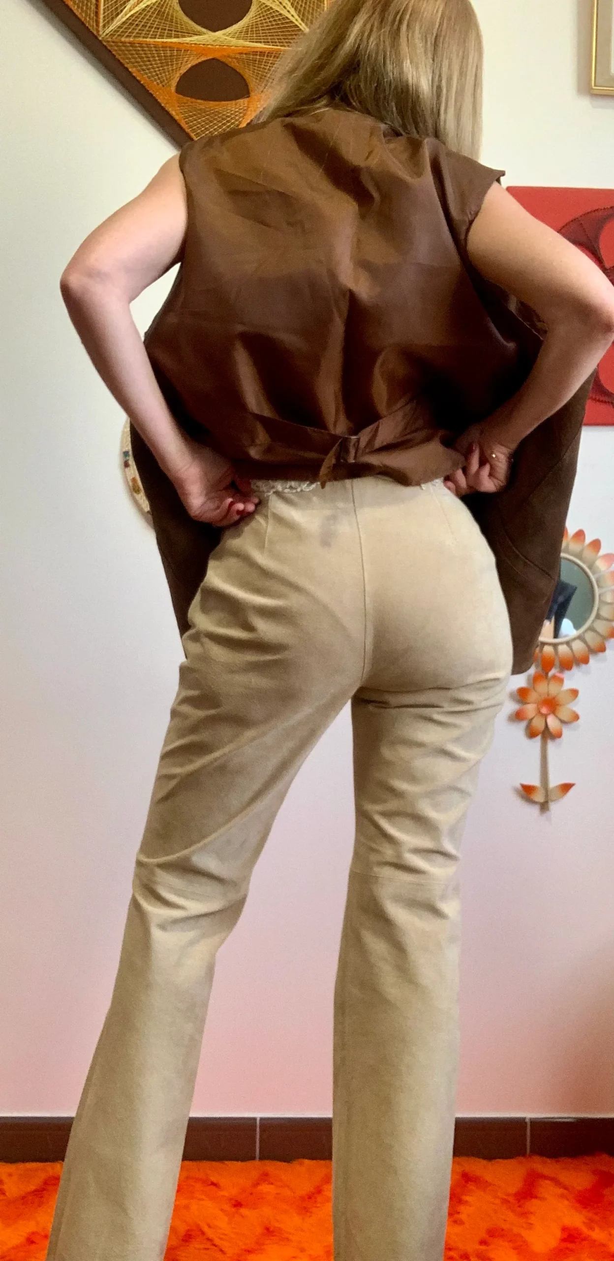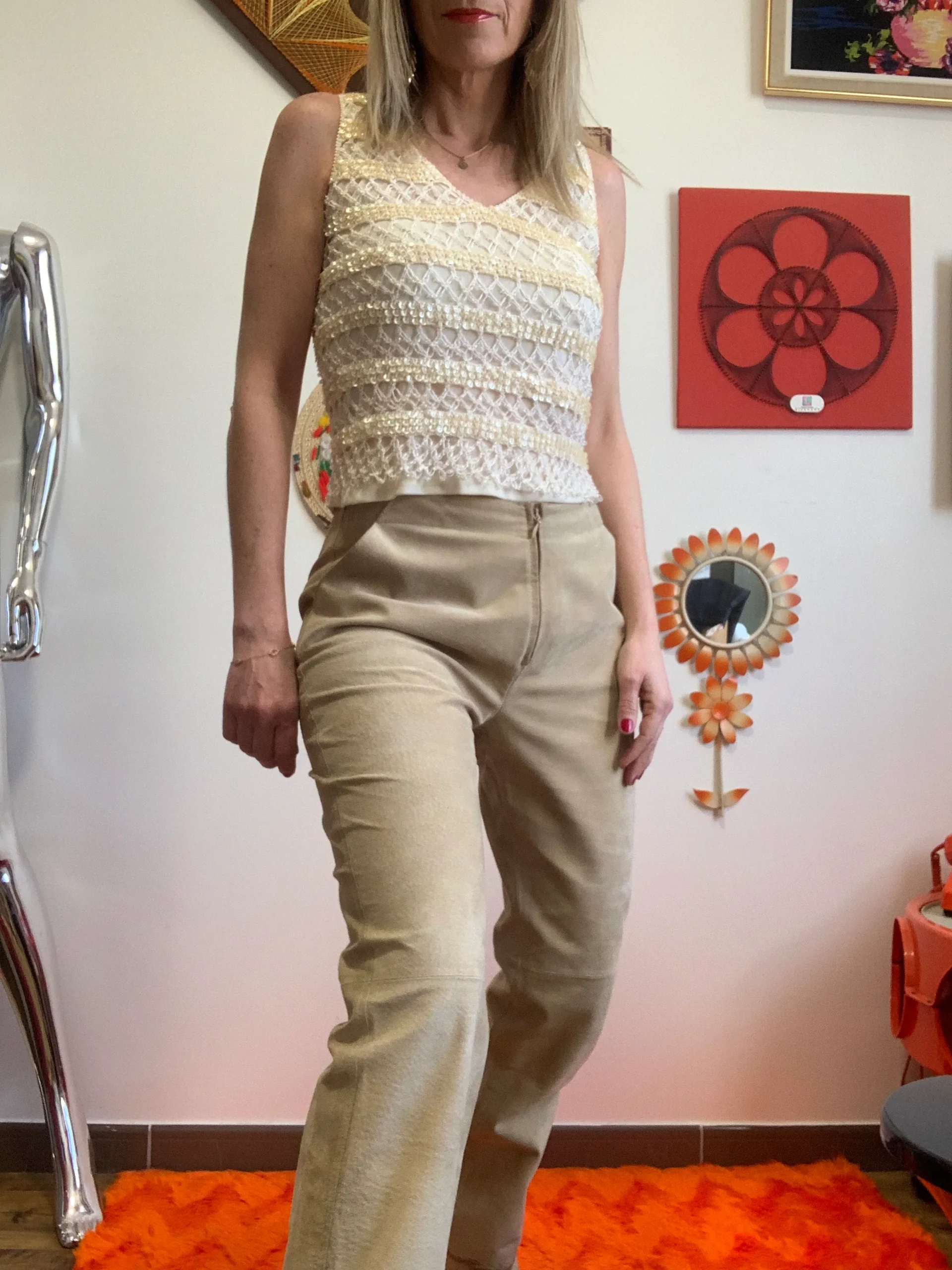Pantalon Daim beige et Fleurs brodées en bas Beauté Vintage 1990
